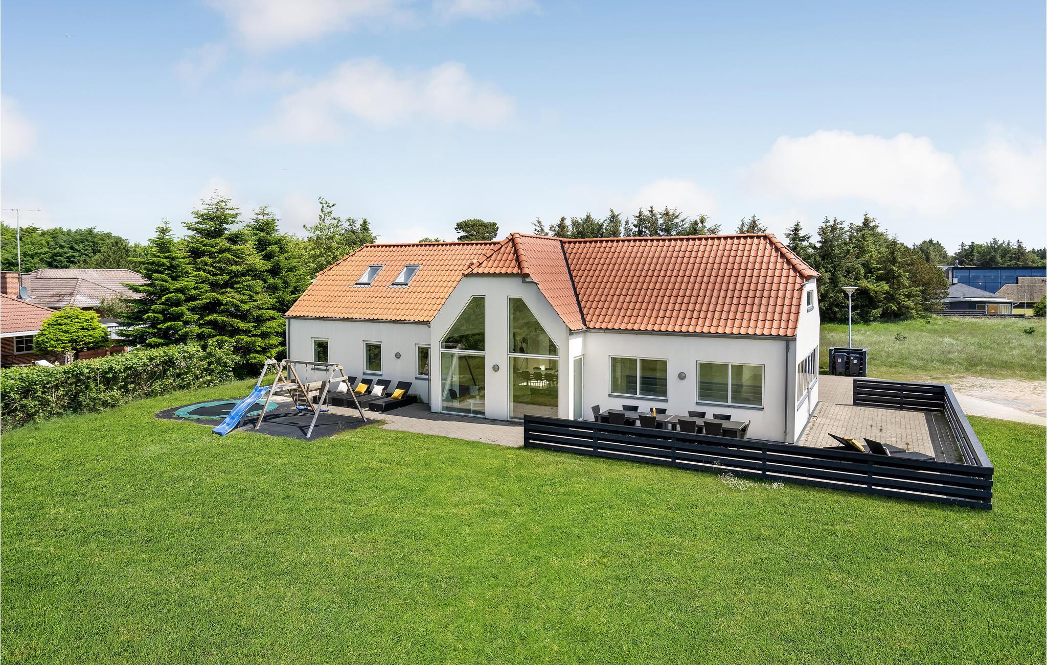 Hold en fantastisk ferie i dette pragtfulde og moderne feriehus på 210 m², med god plads til 16 personer. Huset ligger på en stor naturgrund med 230 m² terrasse og med gynger og trampolin. Huset er indrettet i en flot og moderne stil, med masser af lysindfald. Indbydende køkken med loft til kip i åben forbindelse med den smagfulde stue og spisestue samt kig til det lækre wellnessrum med en dejlig swimmingpool og sauna samt det store varmtvandsbassin, hvor der nemt kan sidde op til ti personer. Der er tre gode badeværelser, alle med toilet og brusebad. Huset råder også over et fint aktivitetsrum med pool- og billardbord og bordtennisbord, her er masser af muligheder for sjove aktiviteter og leg, både inden- og udendørs. Ikke langt fra huset ligger en golfbane, bowlingbane og en af Danmarks skønneste sandstrande, ved det fredede naturområde Skallingen.