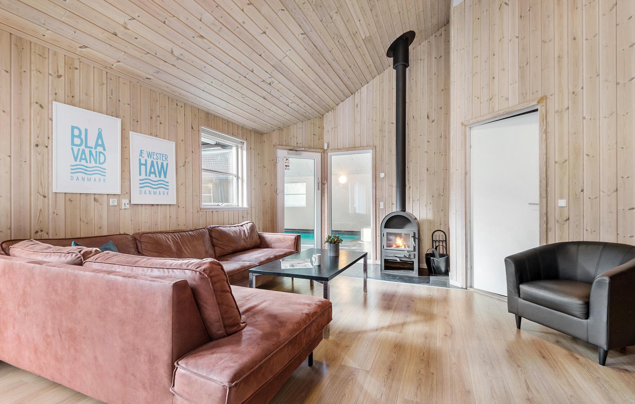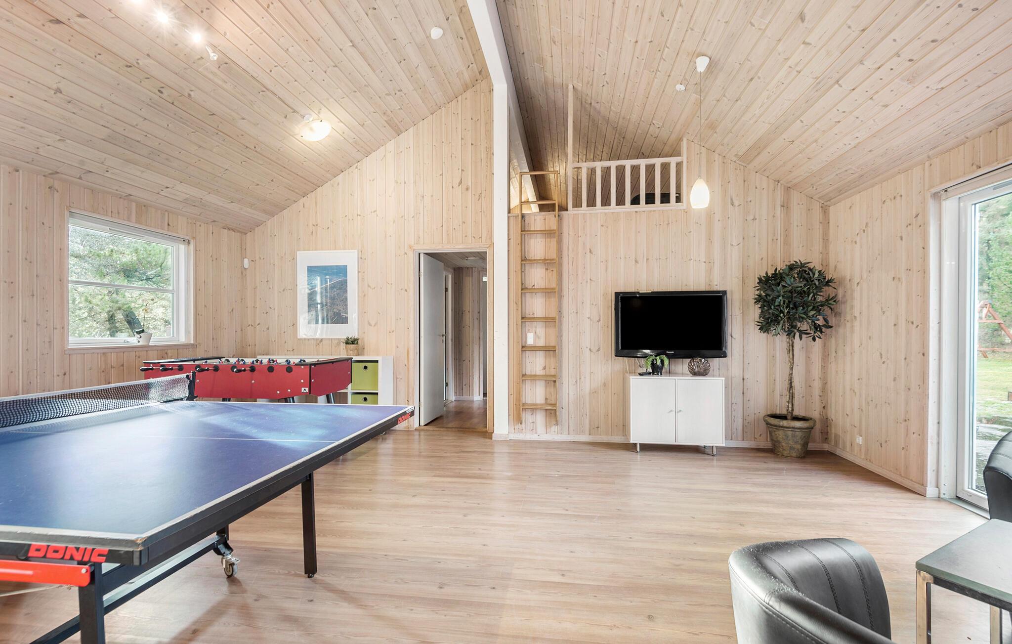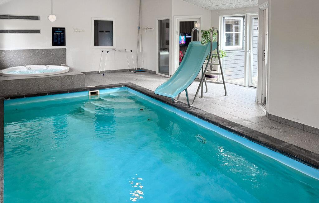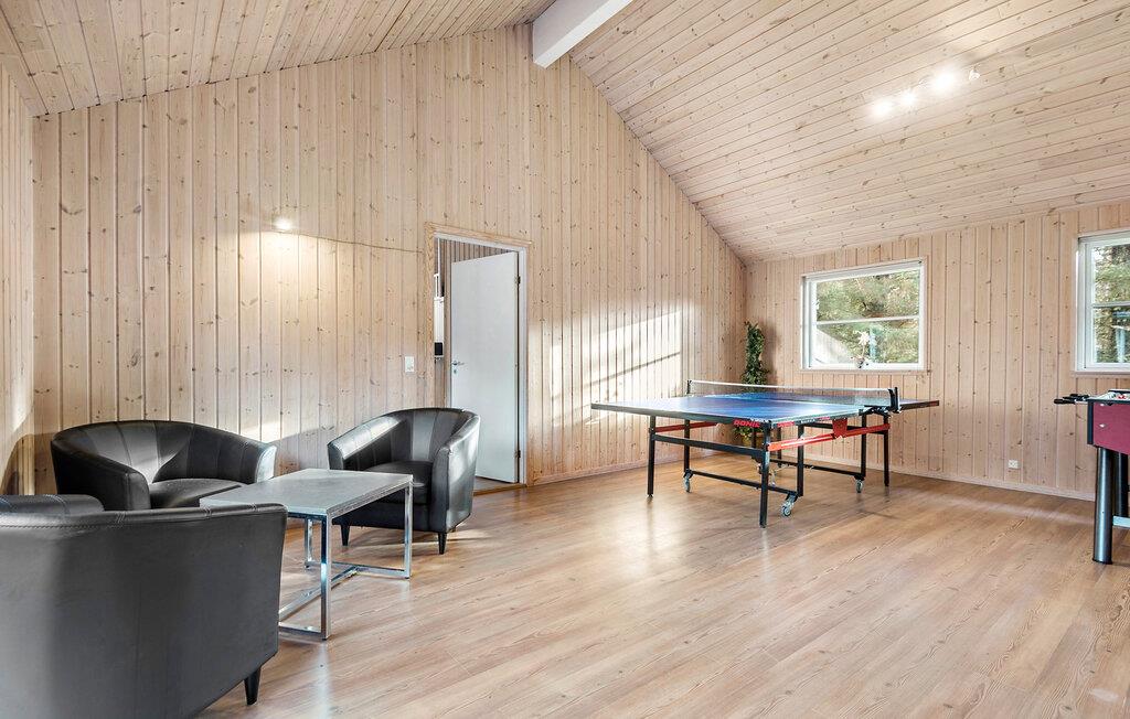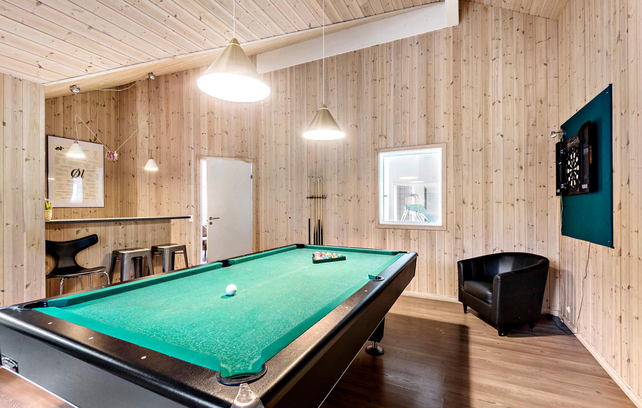 Gør jer klar til en skøn familieferie i dette rummelige og meget indbydende feriehus, hvor der er god plads til alle. De lyse trævægge skaber en lys og venlig boligatmosfære, som giver jer gode rammer til at lave mad sammen, nyde dagens måltider rundt om spisebordet eller bare slappe af i sofaen. Indendørspoolen med rutsjebane og spabad lægger op til mange timers badesjov, mens saunaen er garant for en rolig stund efter dagens strabadser. Det rummelige aktivitetsrum er udstyret med dart, billard, bordtennis og bordfodbold - så her får I et herligt sted til de hyggelige aftener. Huset kombinerer moderne bekvemmeligheder med en hyggelig atmosfære og giver jer et skønt ferieparadis.