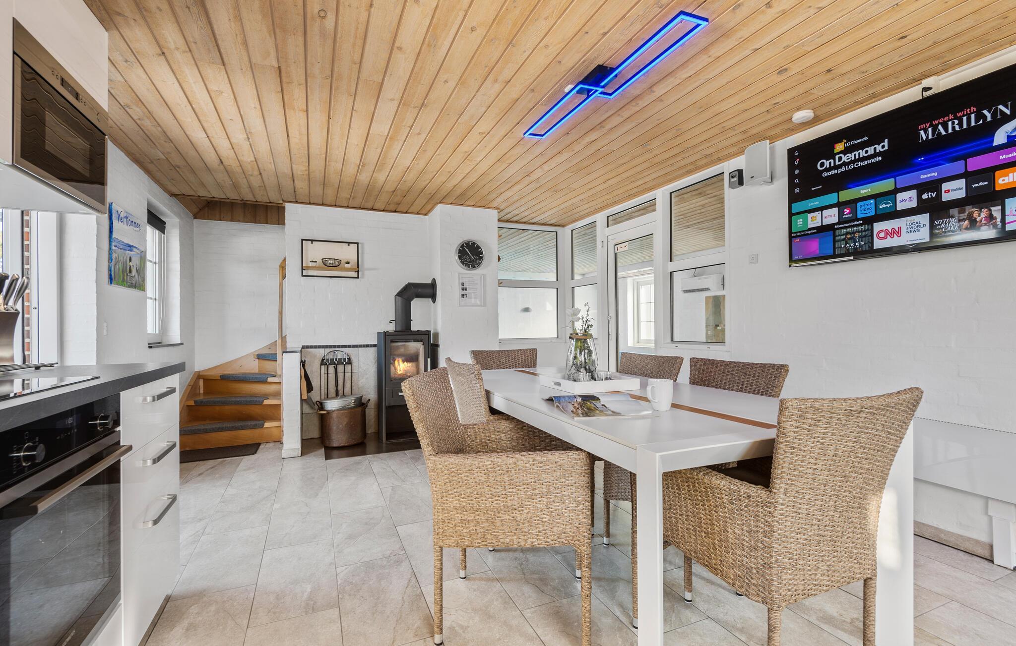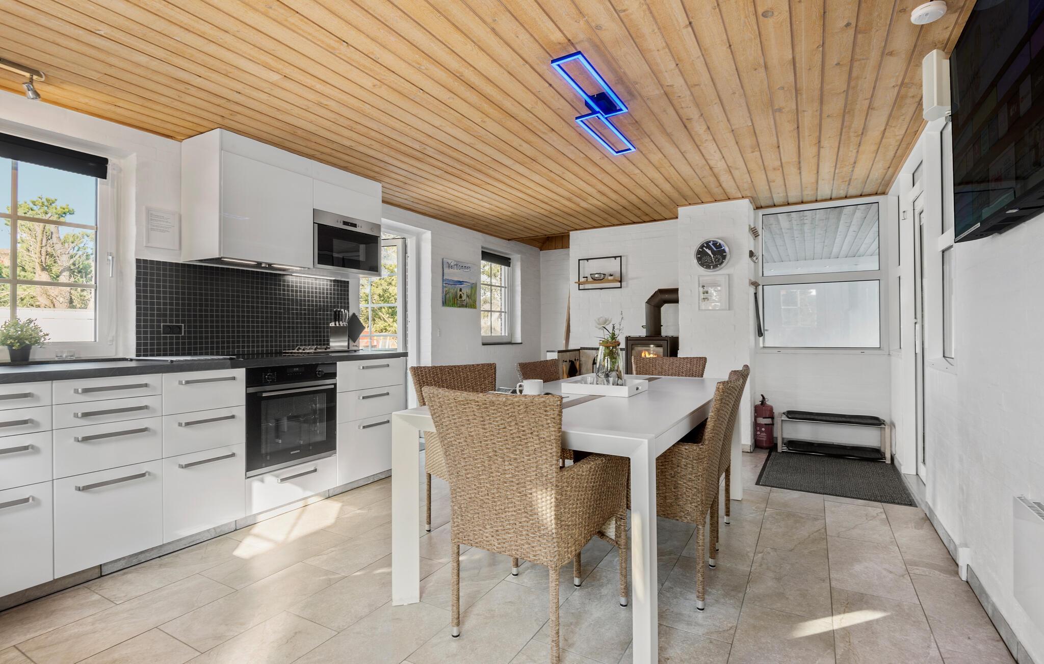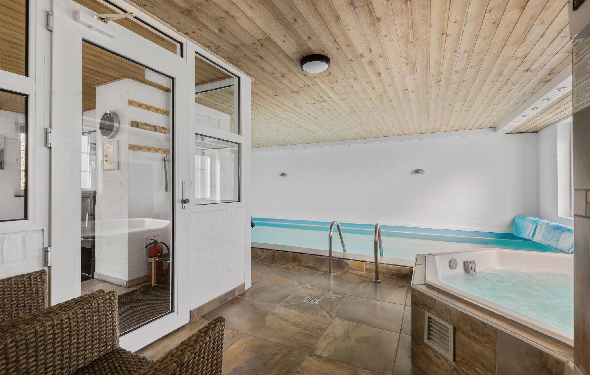 Glæd jer til en dejlig ferie i dette charmerende stråtagshus, der ideelt set kombinerer ro og aktivitet. jeres hyggelige sommerhus er noget særligt med sin stilfulde indretning og rummelige værelser. Begynd dagene med en lækker morgenmad i det moderne, åbne køkken, som byder på masser af plads til fælles måltider. Senere kan I nyde en pause i den rummelige opholdsstue, hvor der er et komfortabelt sofaområde og dejlig varme fra brændeovnen. Den interne pool, spabad og sauna lægger op til at slappe af i krop og sind og lade batterierne op til nye ferieoplevelser.
