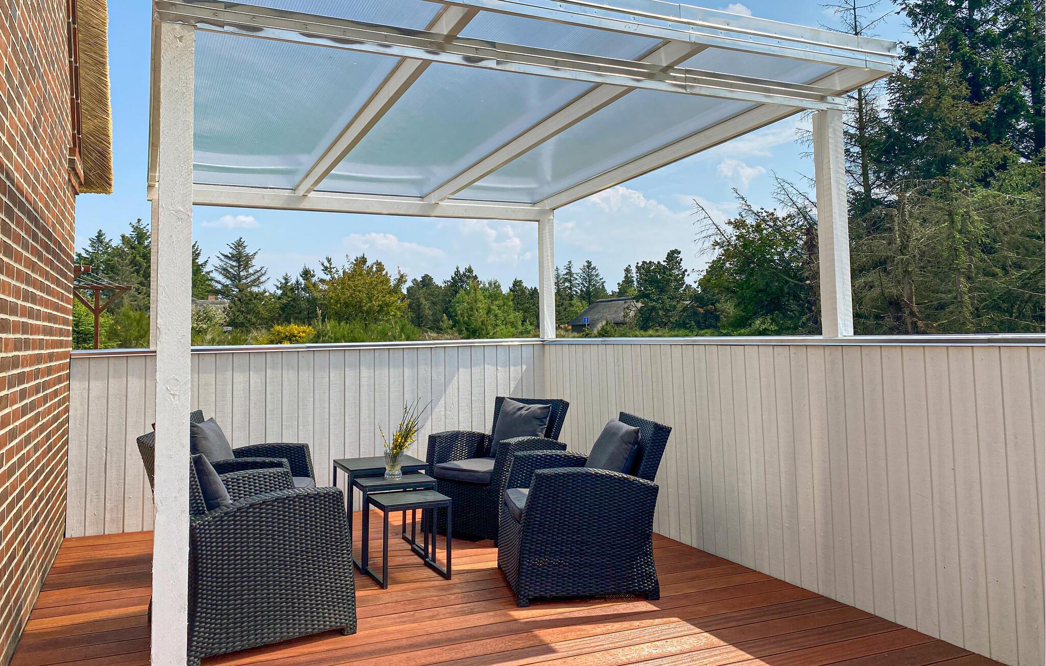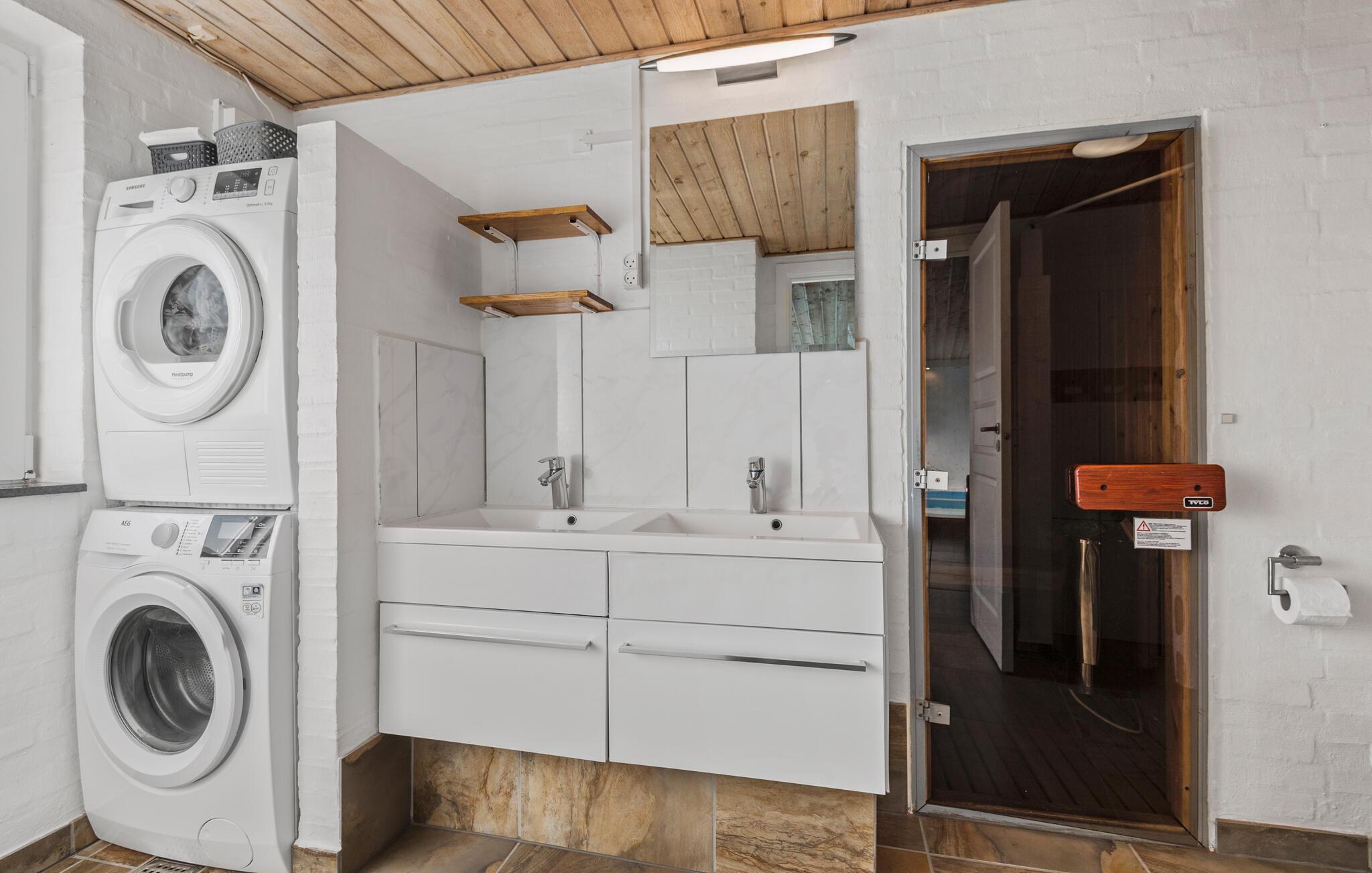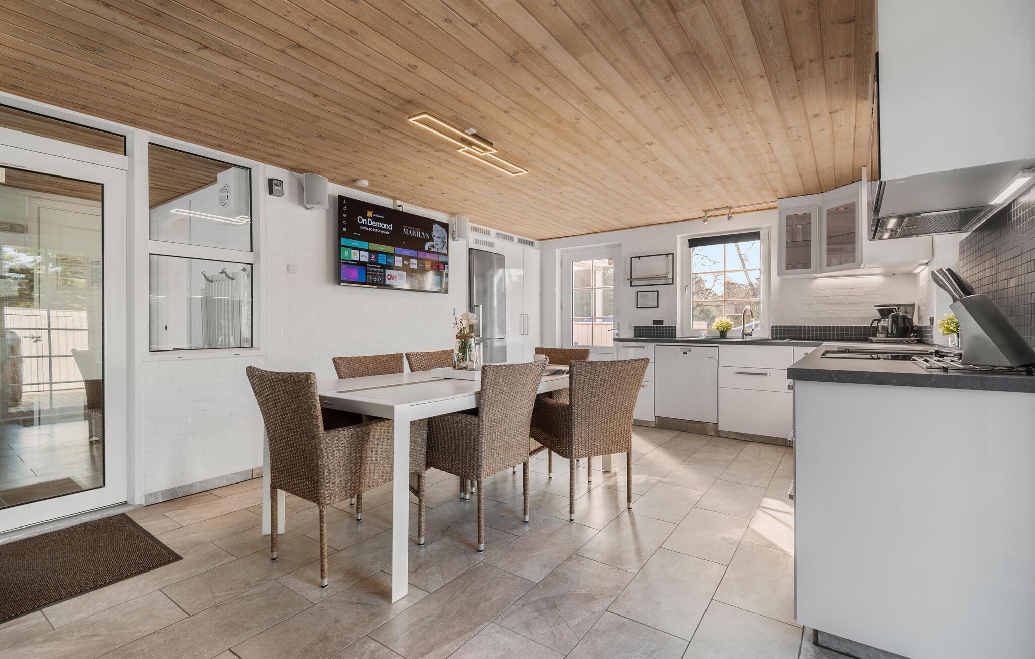 Glæd jer til en dejlig ferie i dette charmerende stråtagshus, der ideelt set kombinerer ro og aktivitet. jeres hyggelige sommerhus er noget særligt med sin stilfulde indretning og rummelige værelser. Begynd dagene med en lækker morgenmad i det moderne, åbne køkken, som byder på masser af plads til fælles måltider. Senere kan I nyde en pause i den rummelige opholdsstue, hvor der er et komfortabelt sofaområde og dejlig varme fra brændeovnen. Den interne pool, spabad og sauna lægger op til at slappe af i krop og sind og lade batterierne op til nye ferieoplevelser.