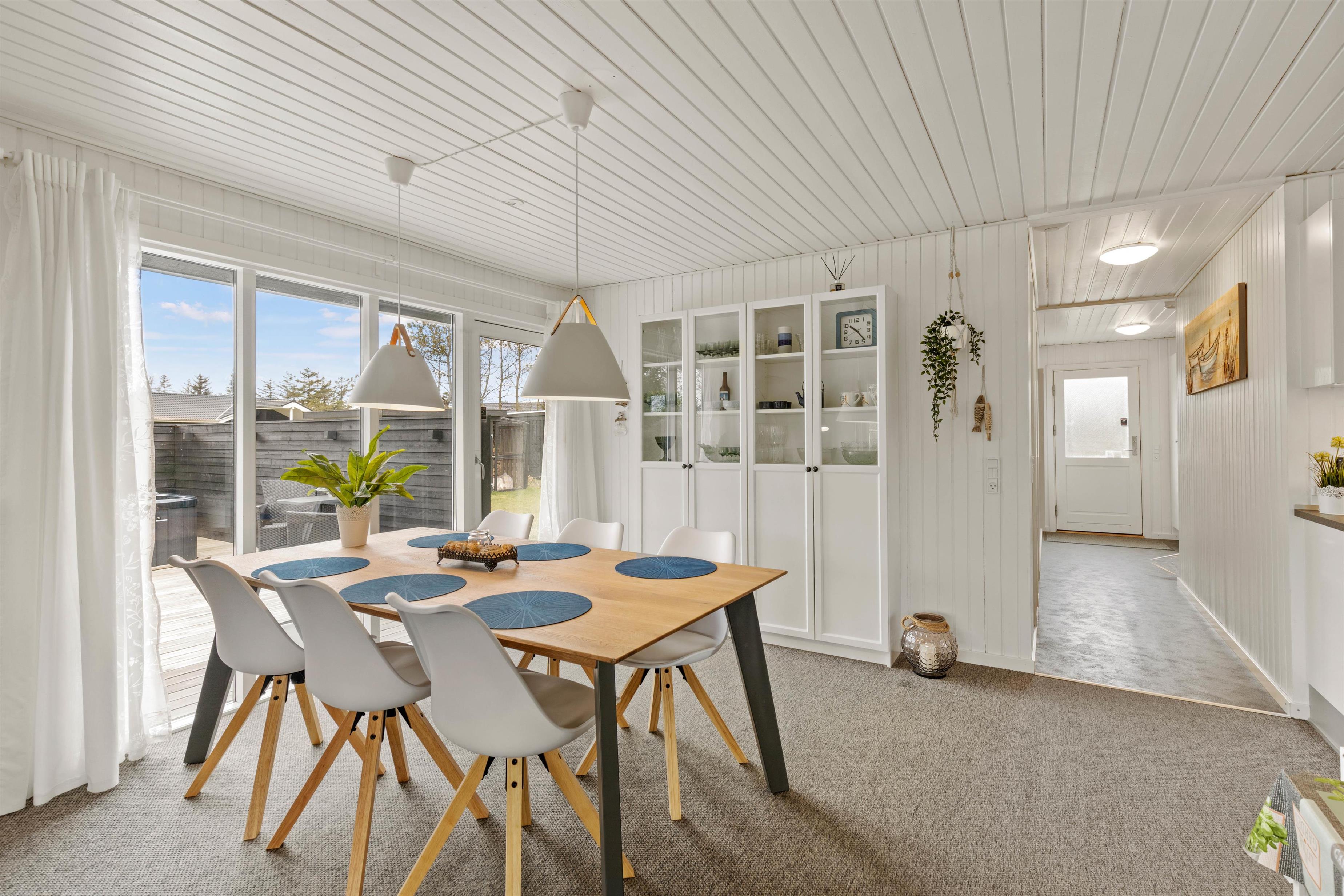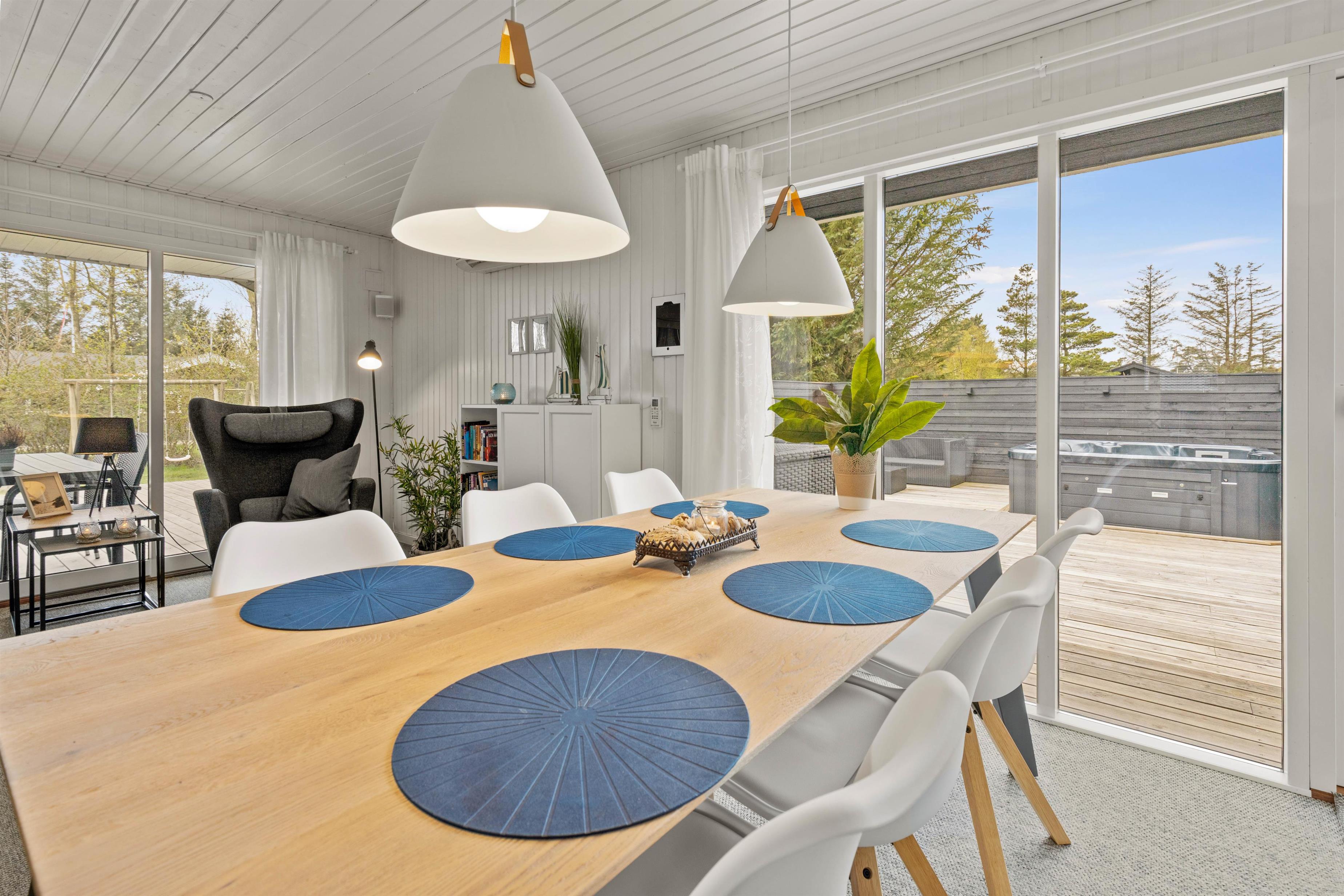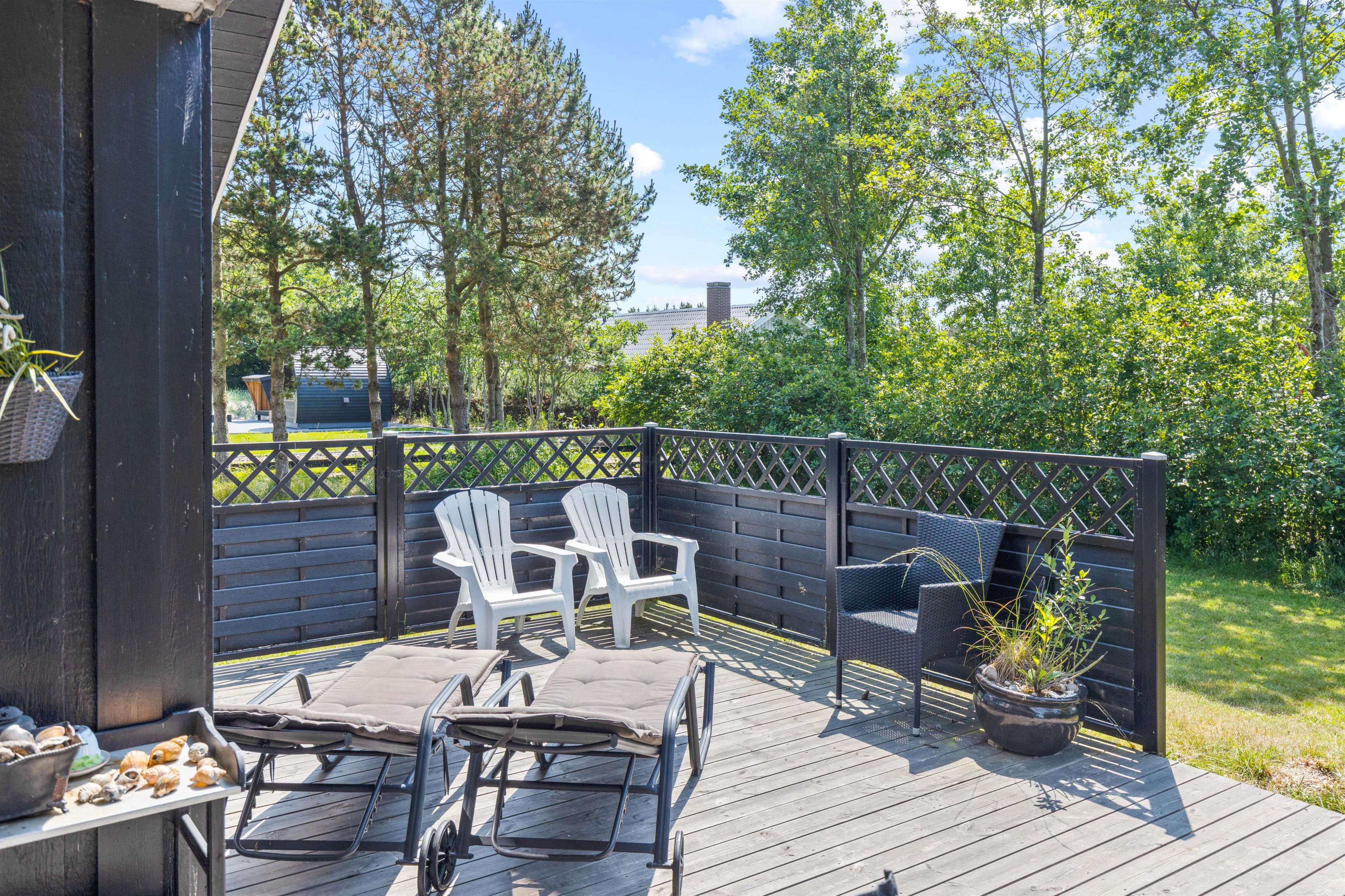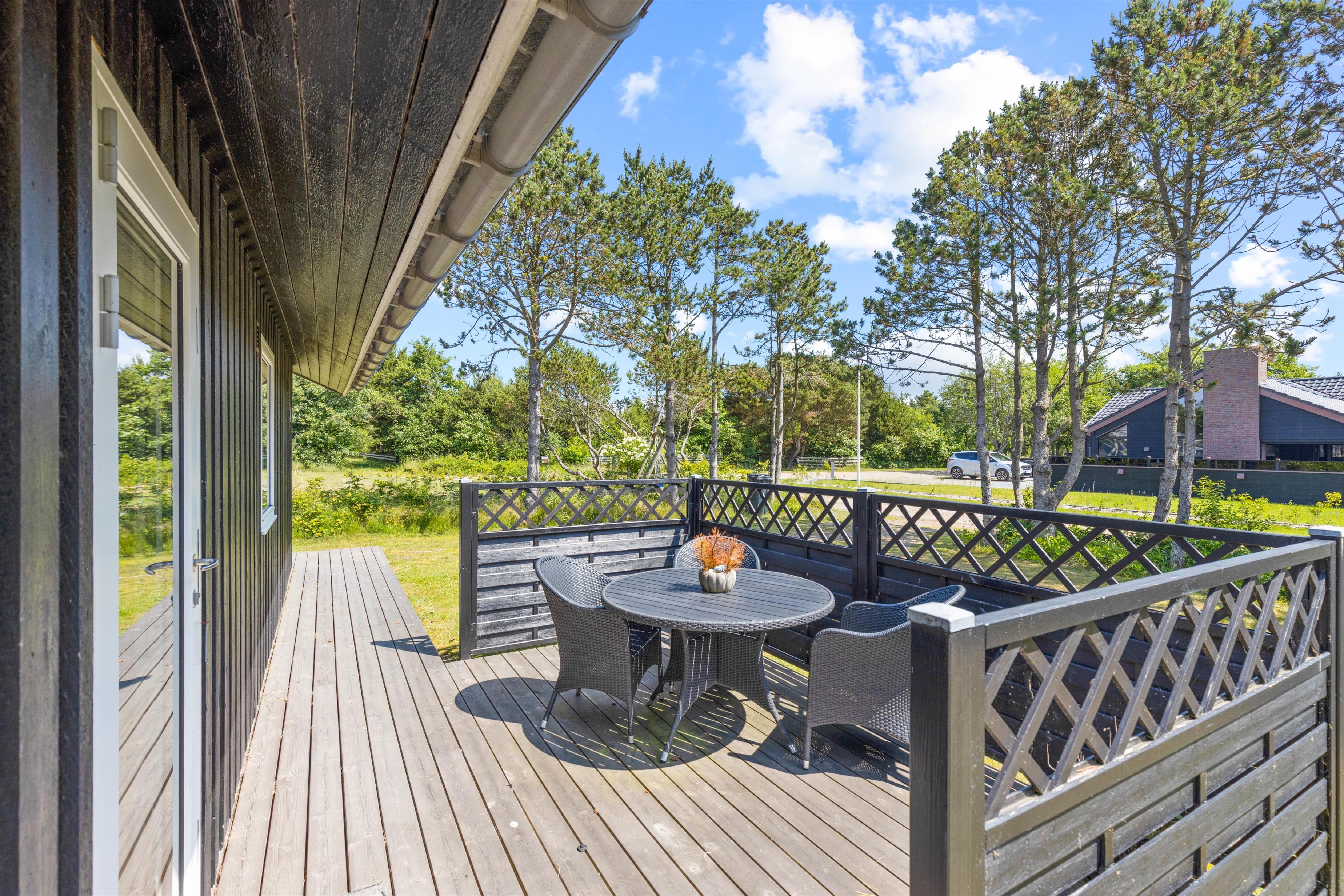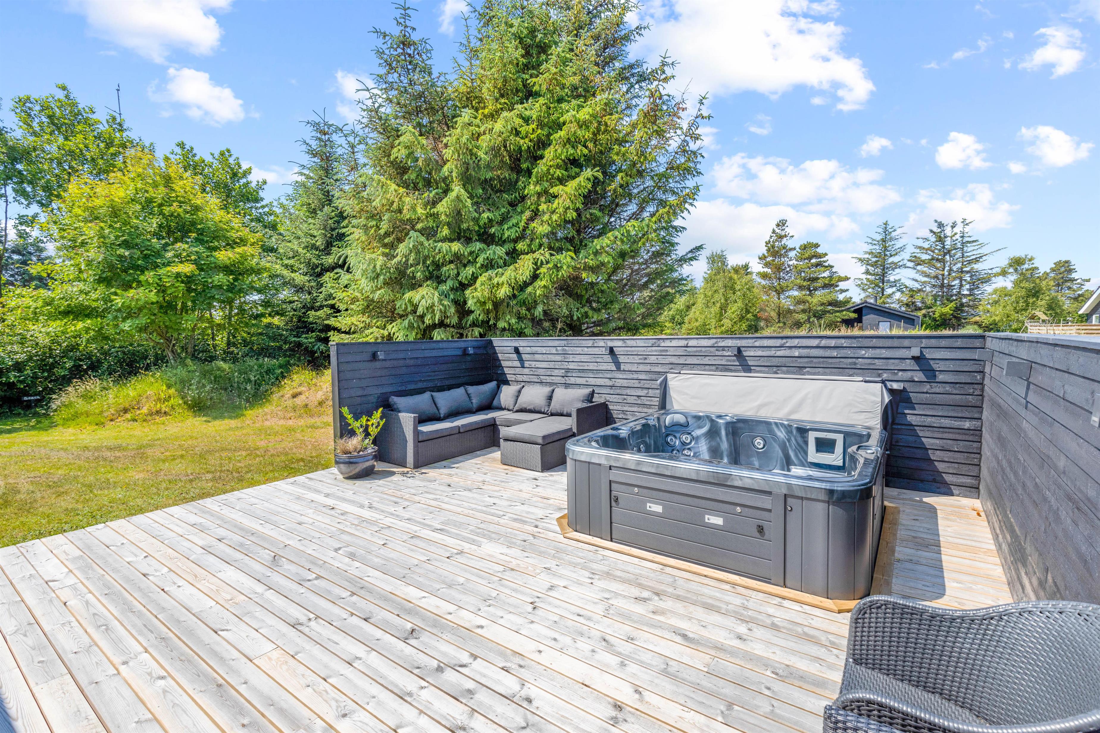 I dette skønne sommerhus vil I have muligheden for at nyde den vestjyske natur i alt slags vejr. I kan nemlig slappe af i det varme udendørs spabad – det er da luksus! Derudover rummer feriehuset en stor, delvist overdækket og afskærmet terrasse med terrassevarmer, som strækker sig rundt om sommerhuset. Her er der altid mulighed for at finde en solstråle.