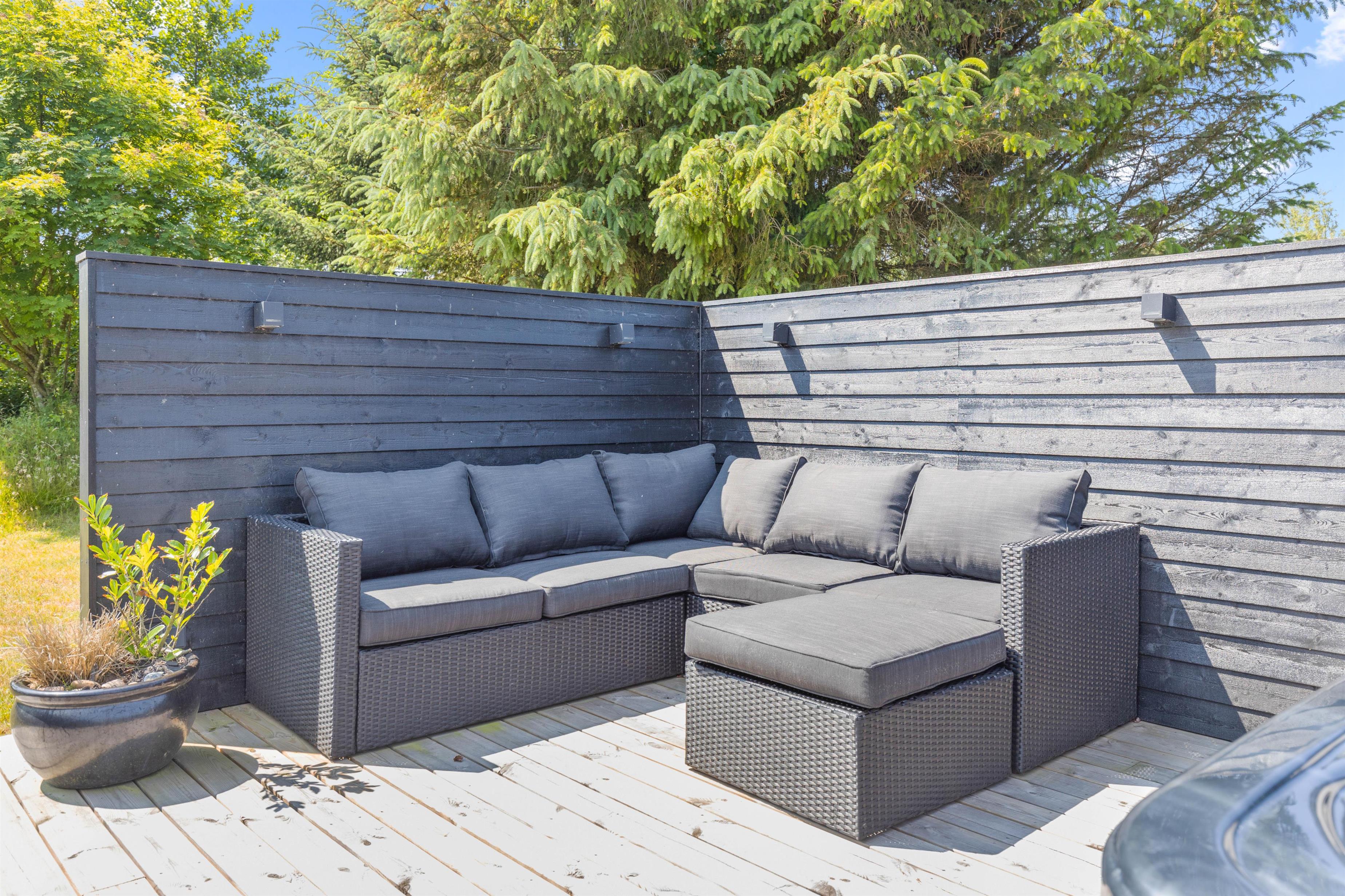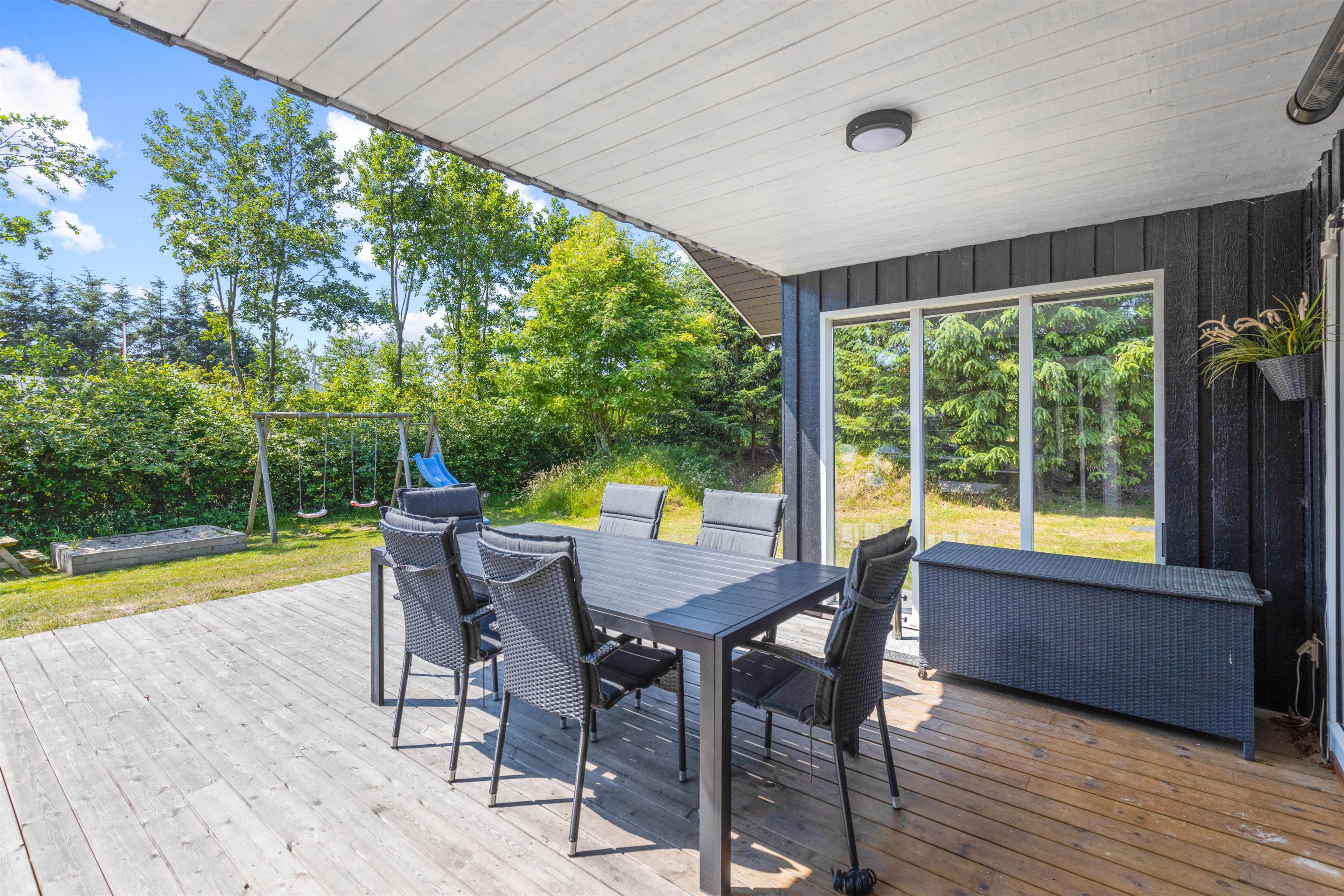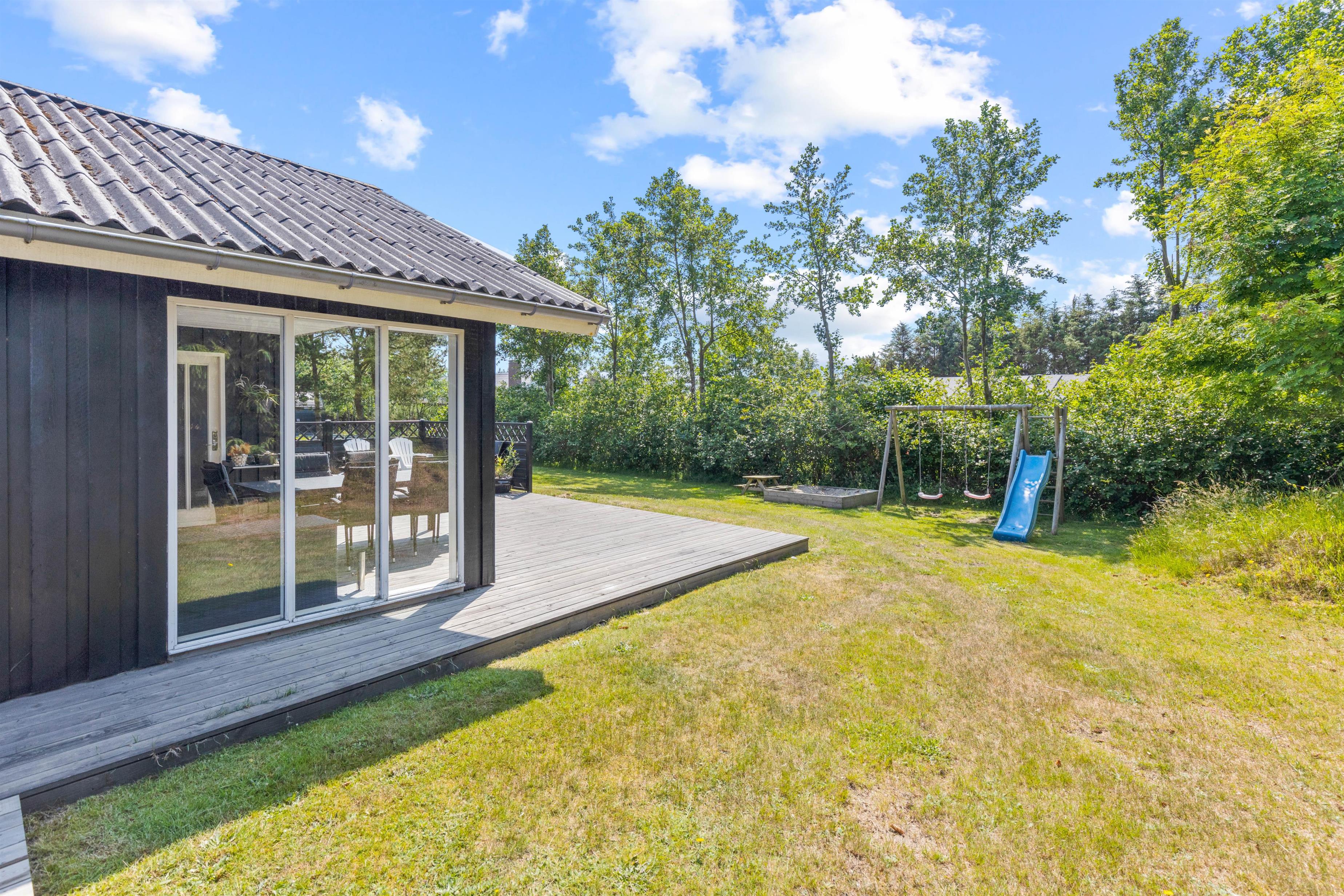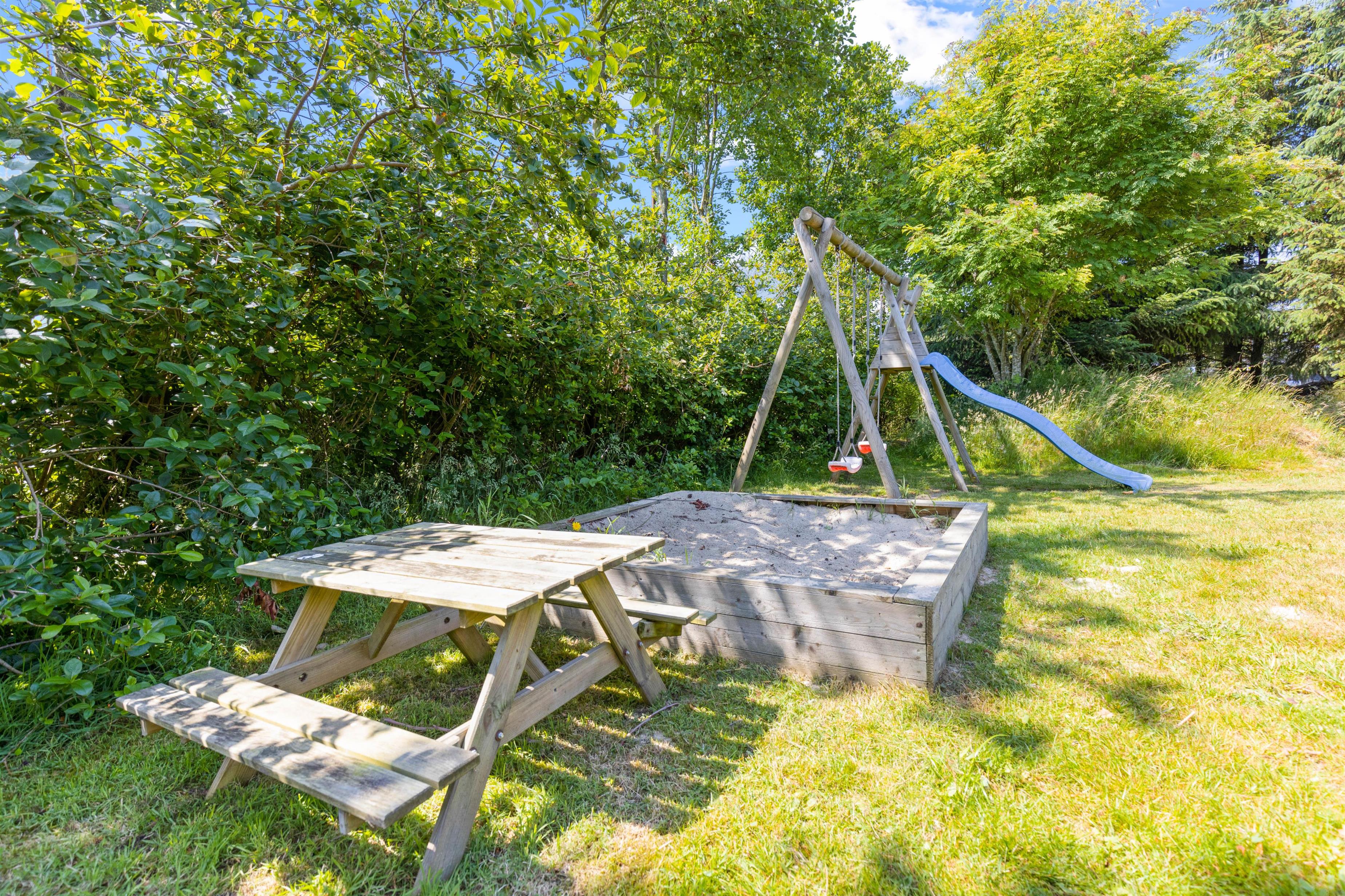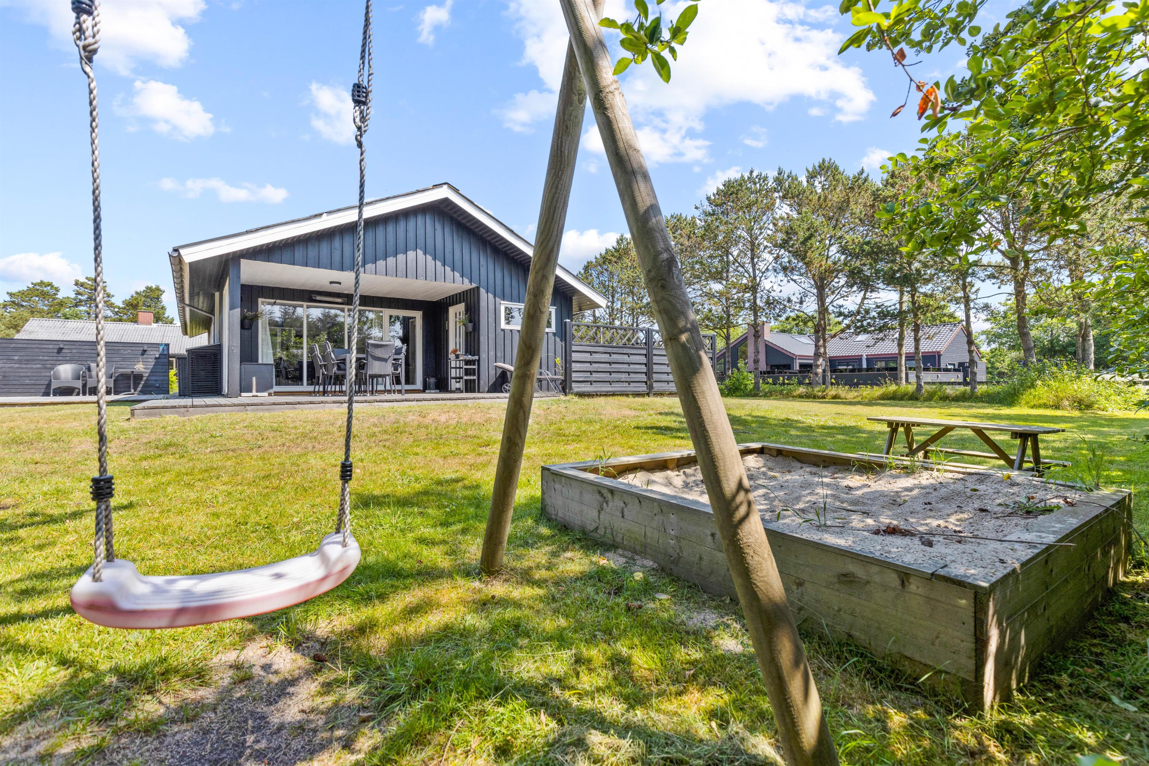 De yngste gæster kommer til at have en fest i de udendørs omgivelser. Der er rig mulighed for leg og sjov på sommerhusets gyngestativ med rutsjebane og i sandkassen, hvor der kan bygges store sandslotte. Feriehuset er omgivet af en stor græsplæne – måske skal der spilles en fodboldkamp, så I kan finde den helt store topscorer?
