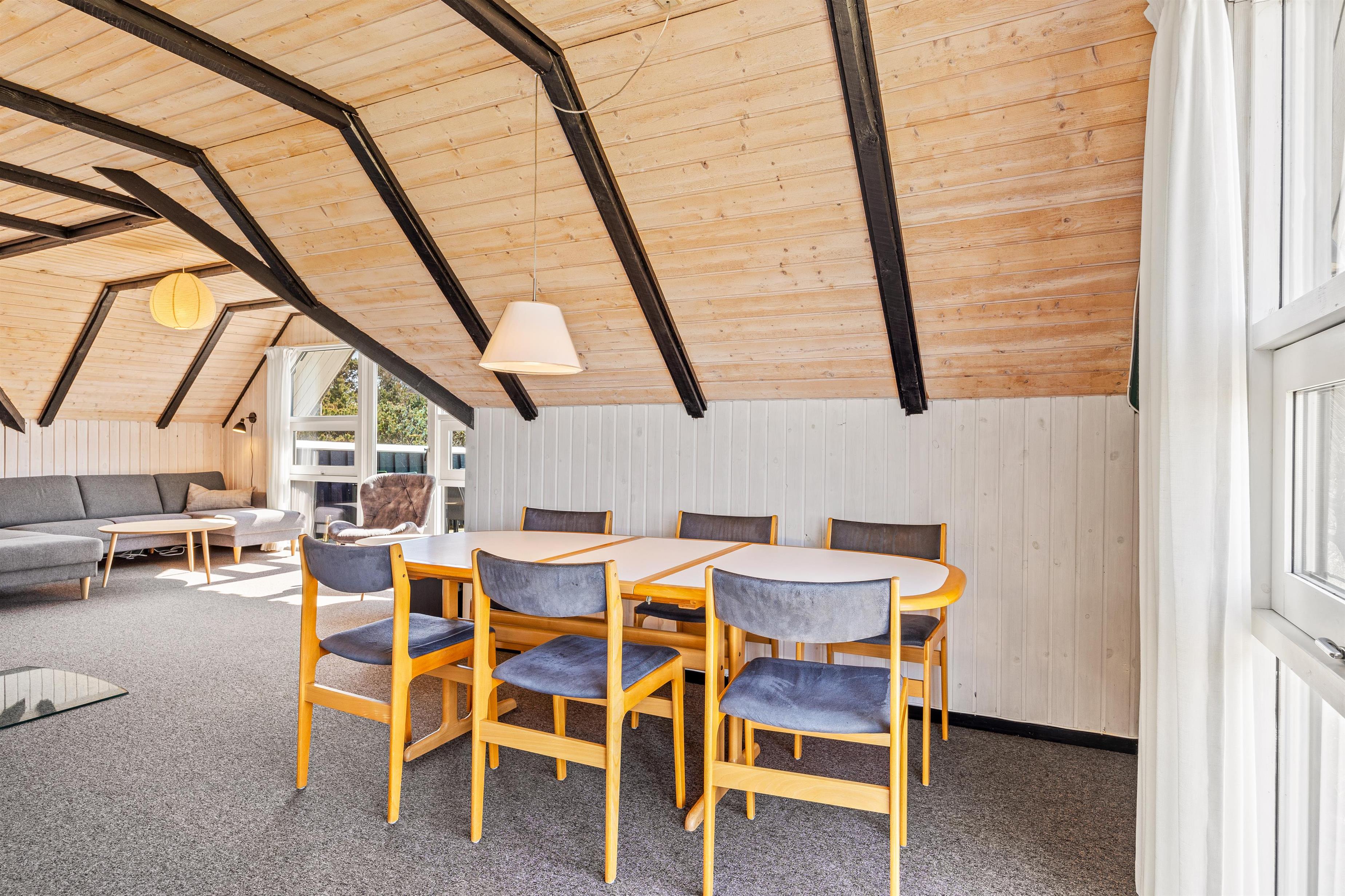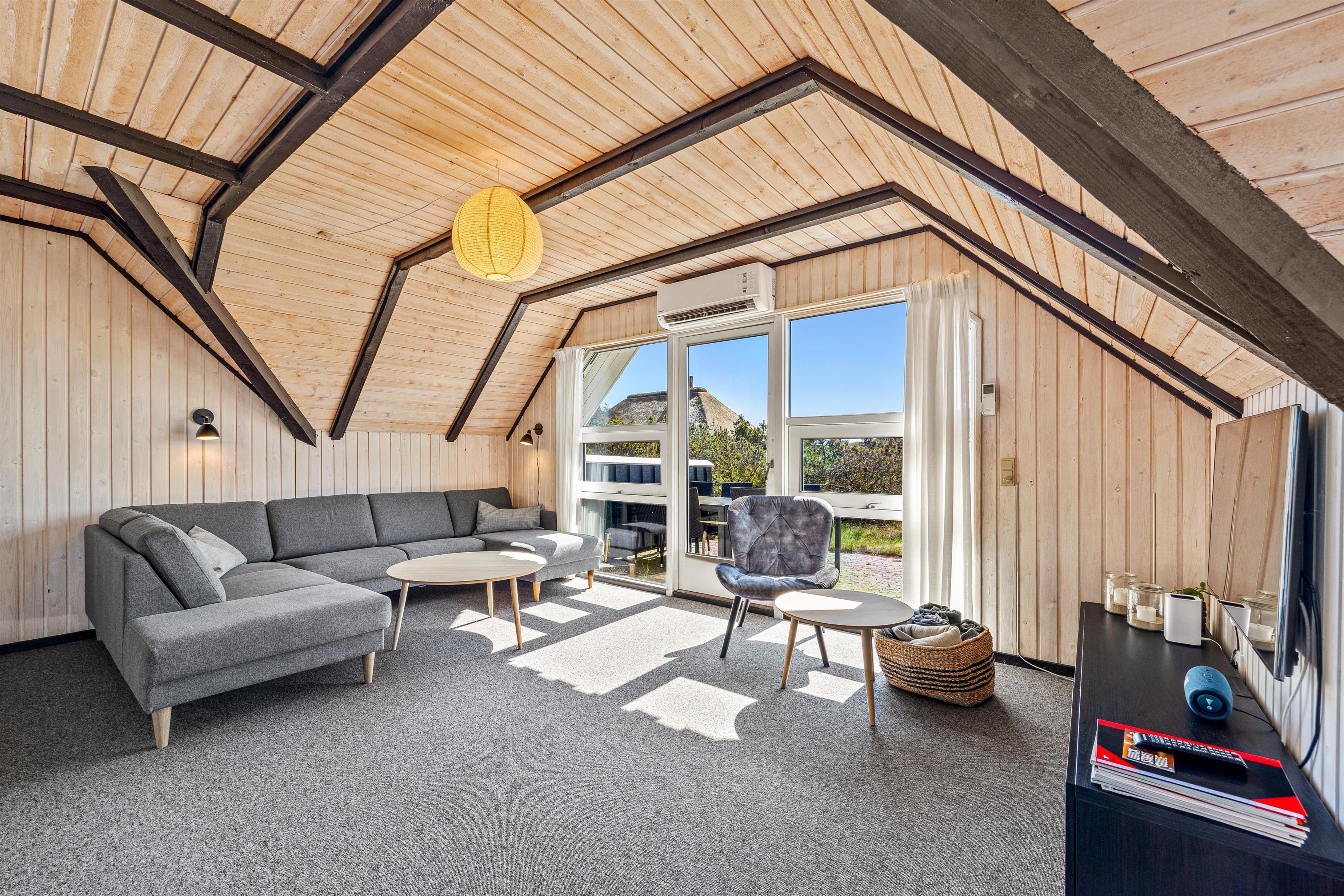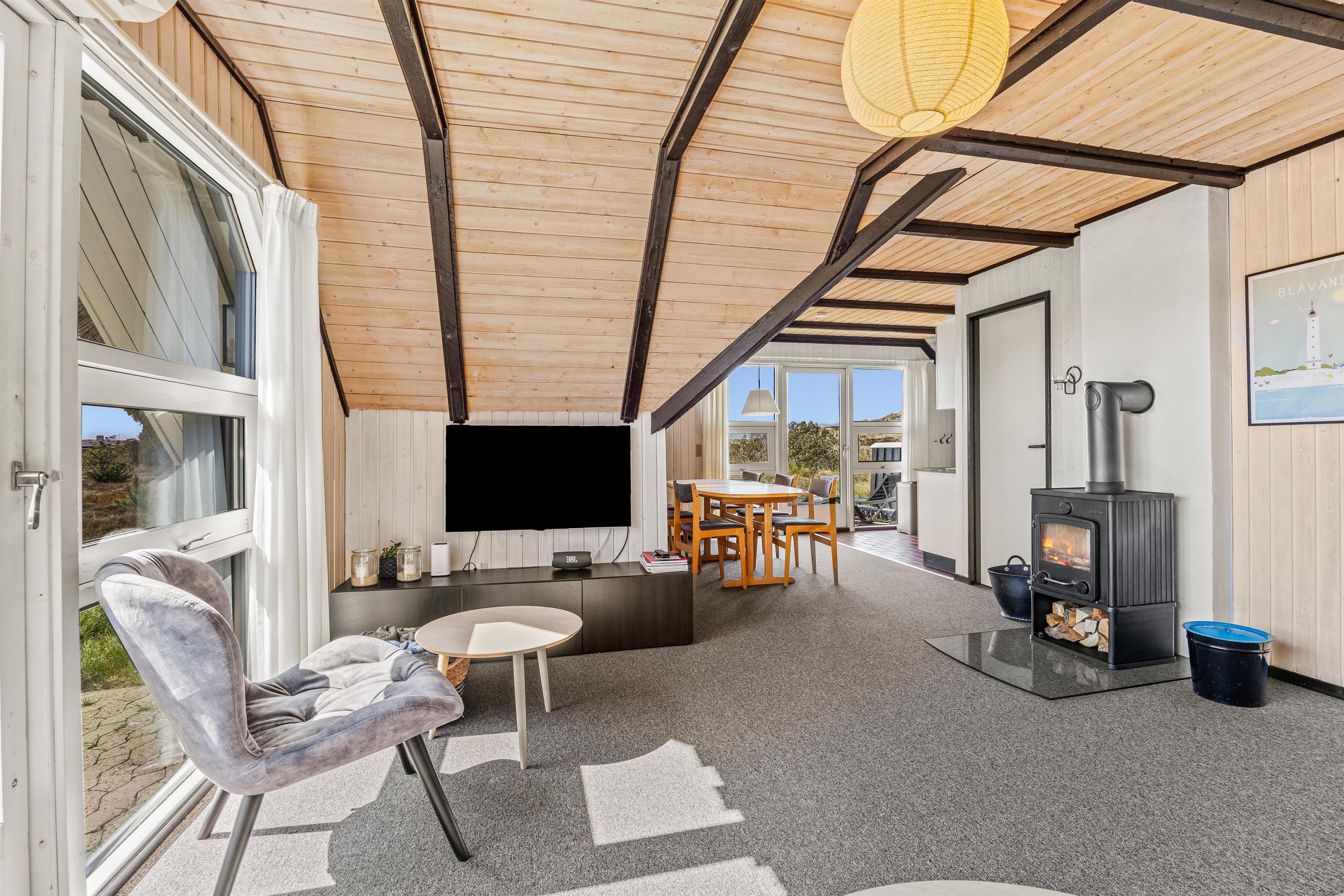 Stuen er hyggeligt indrettet med gulvtæppe og brændeovn. Det knitrende brænde skaber ikke blot en god varme, men sætter også prikken over i’et til feriestemningen. I sommerhuset er der også en energibesparende varmepumpe, som I med fordel kan benytte.