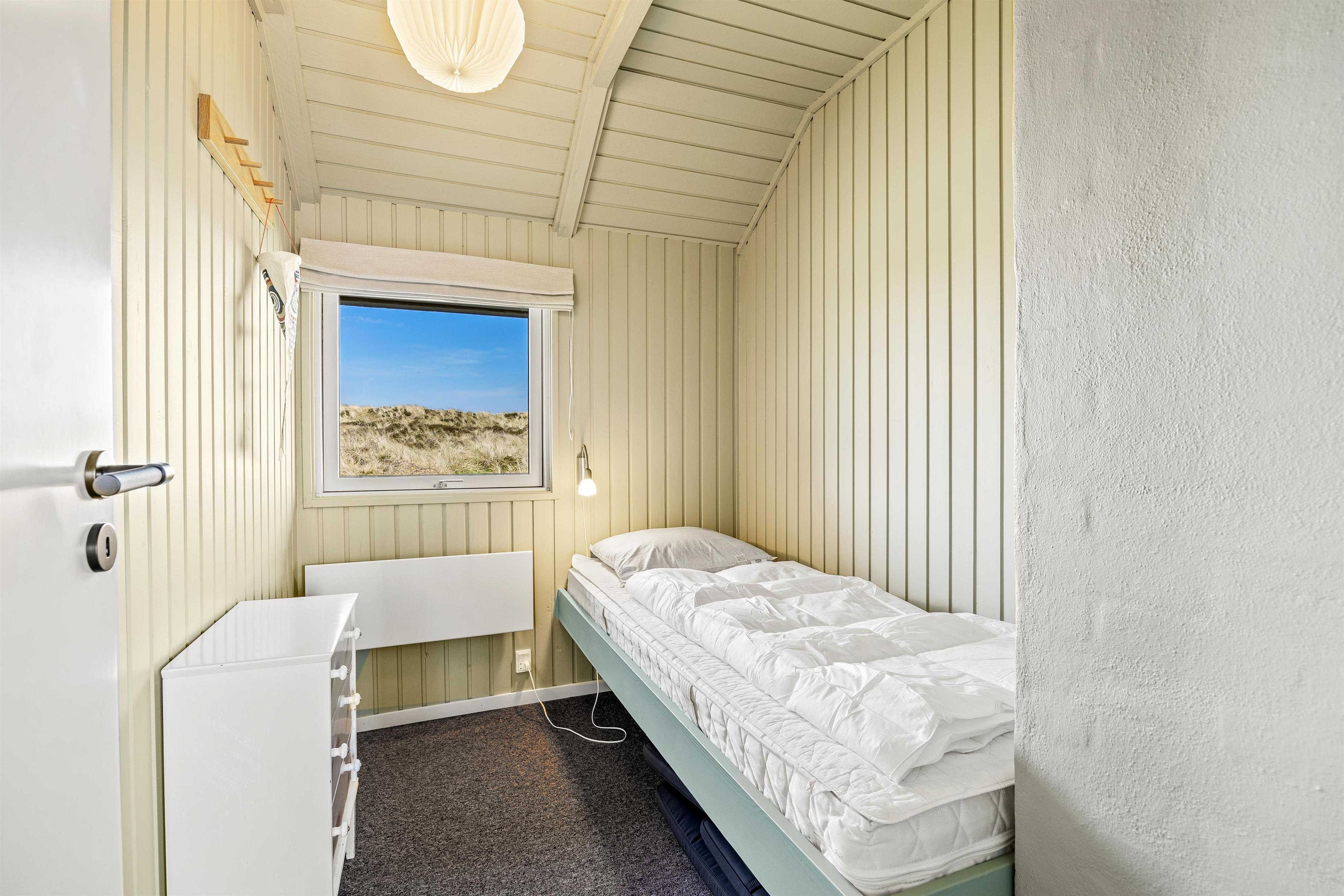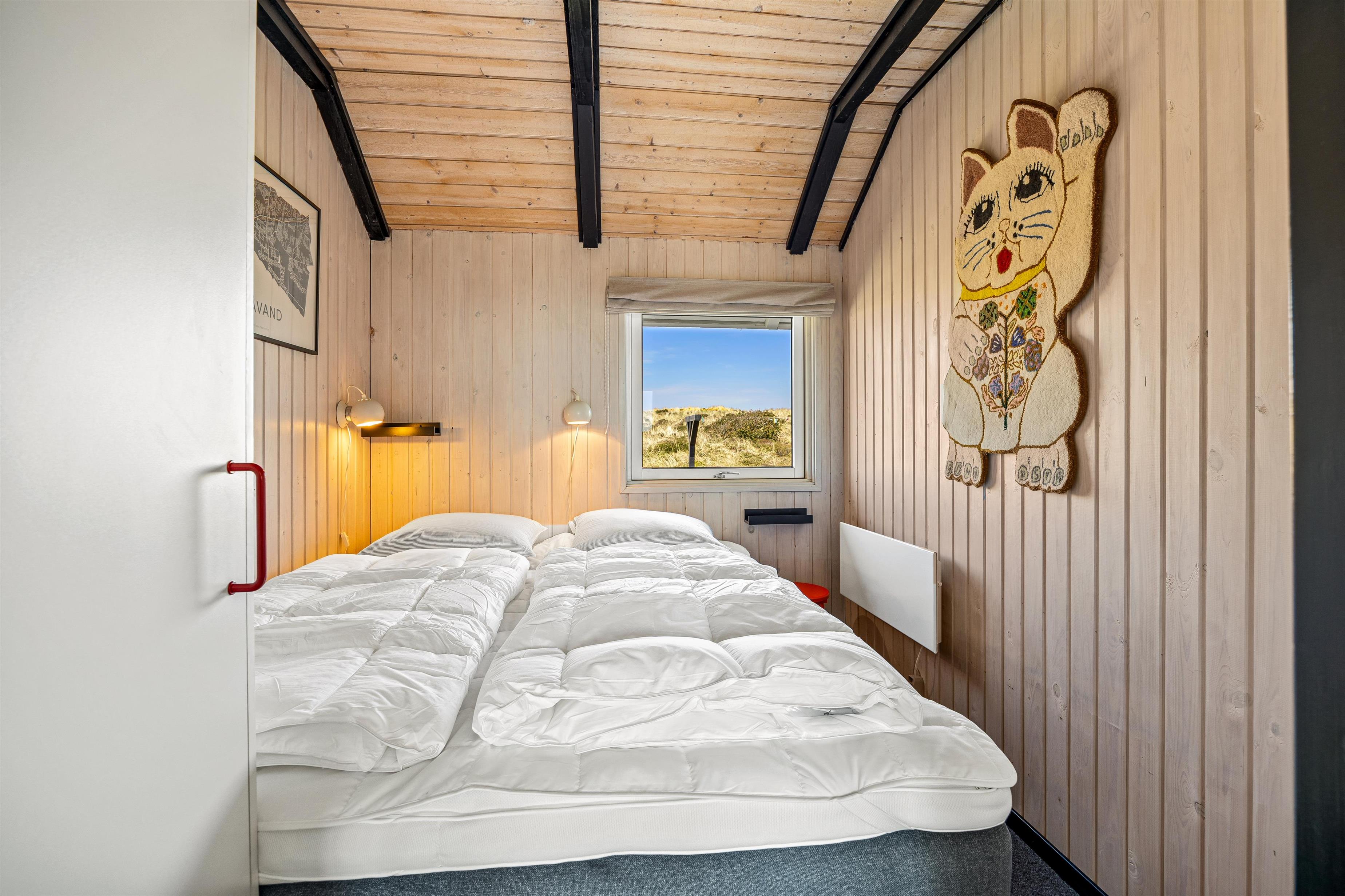 Sommerhusets badeværelse er med gulvvarme samt vaskemaskine, og de 5 sovepladser er fordelt på 3 værelser. Der er 2 med dobbeltseng, mens det sidste værelse er indrettet med en enkeltseng.