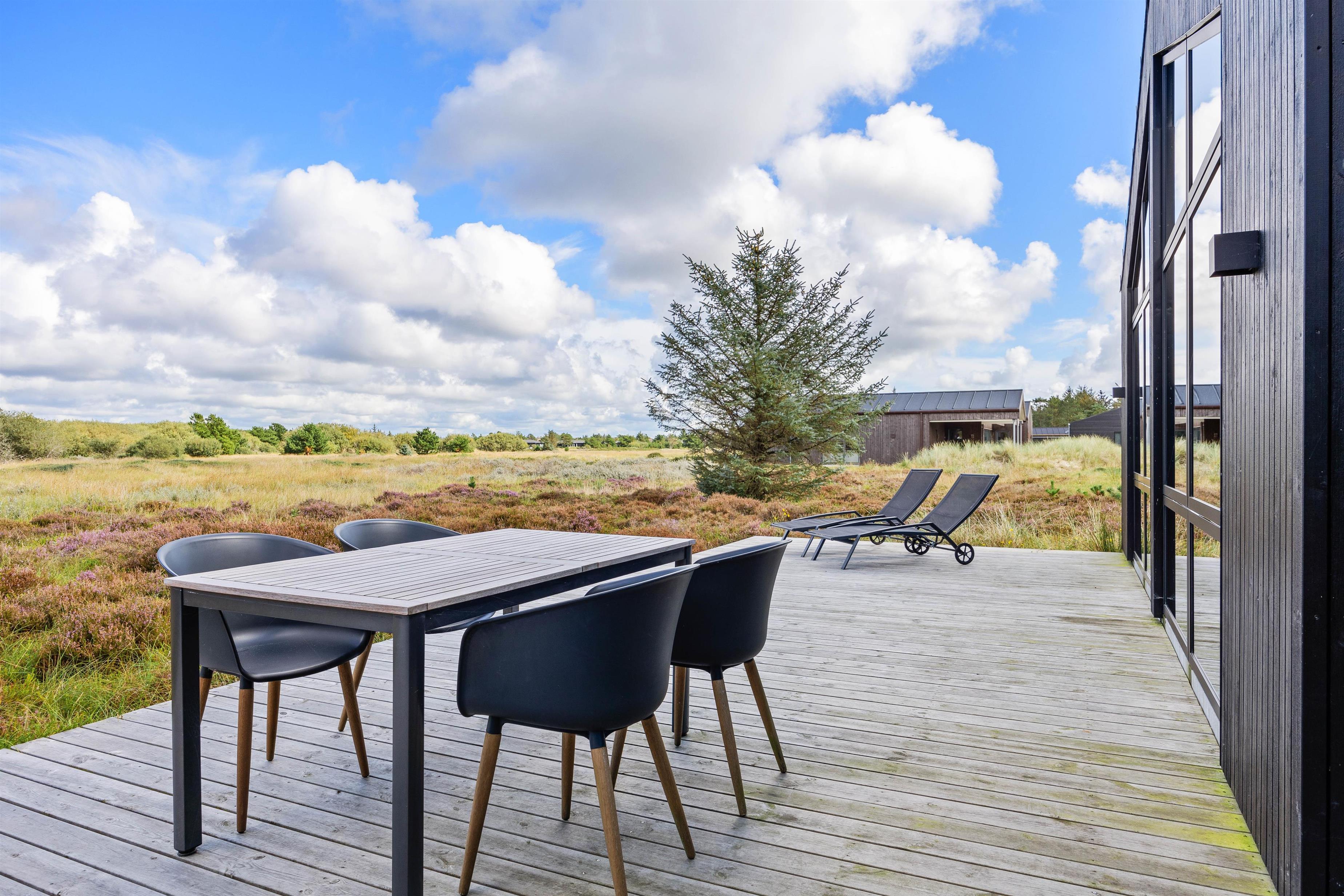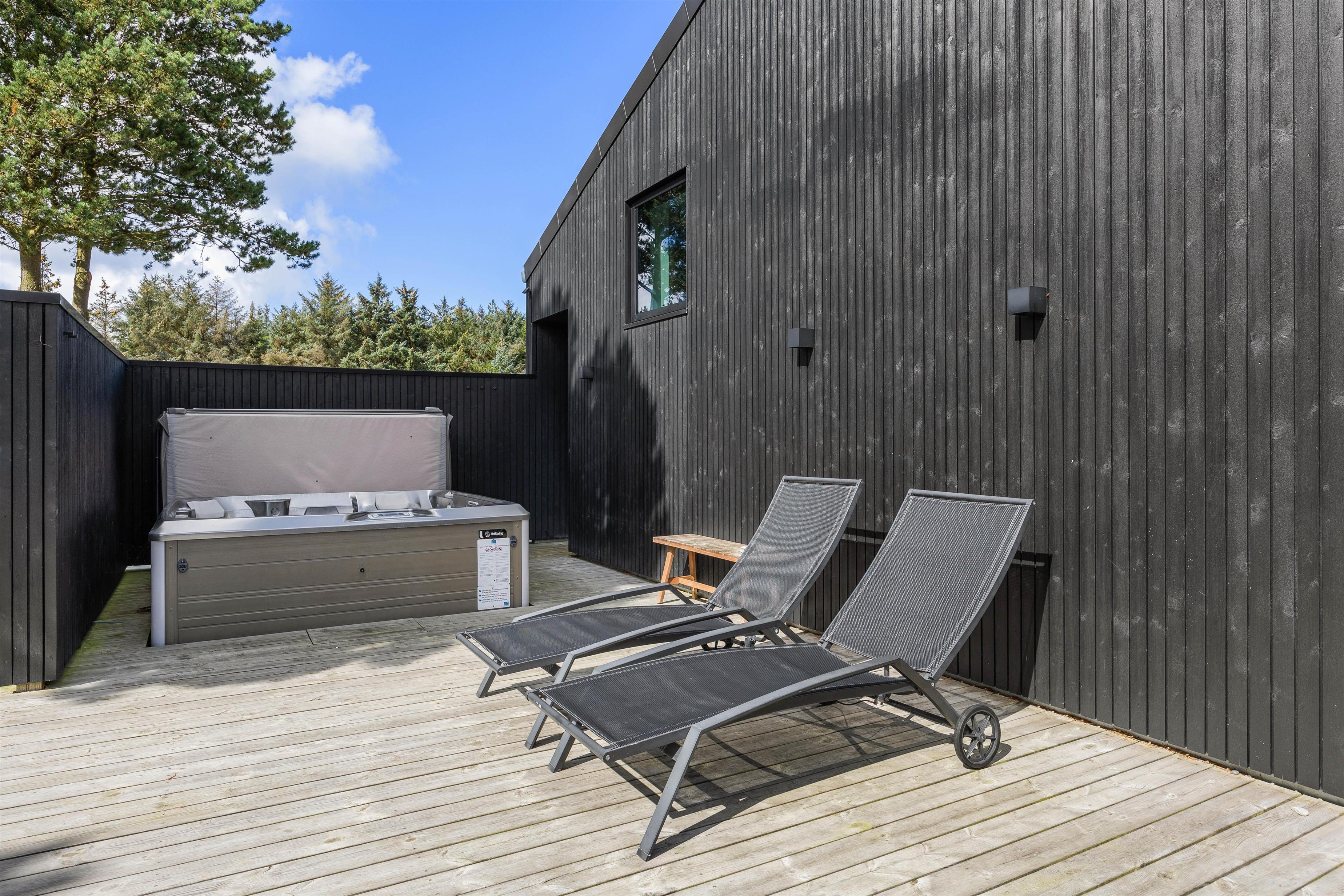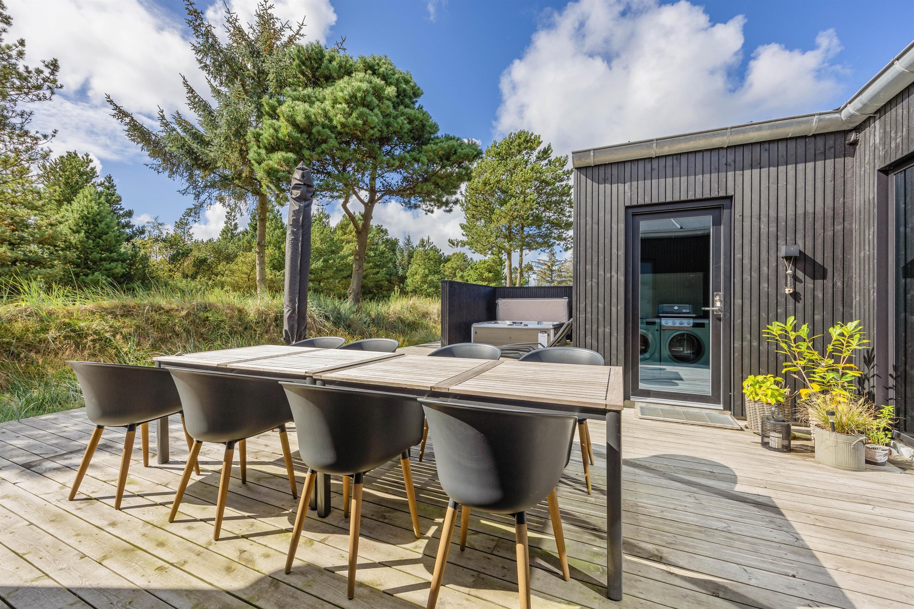 En stor træterrasse sørger for, at I på bedste vis kan nyde den friske luft og den vestjyske natur på ferien. Terrassen er både åben og afskærmet, og der er god plads til, at alle 8 feriegæster kan finde en plads i solen – og måske hopper et par stykker i udespaen?