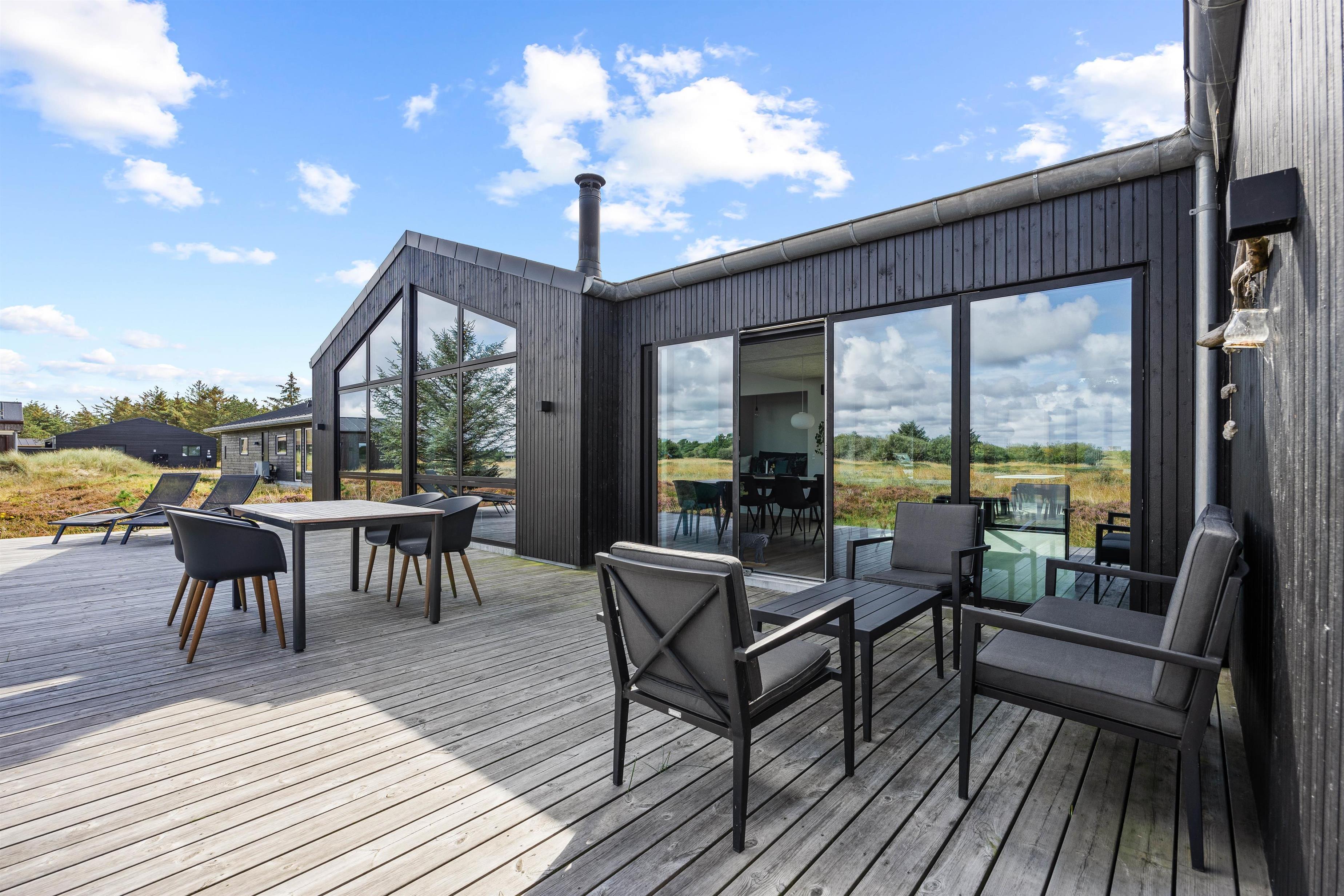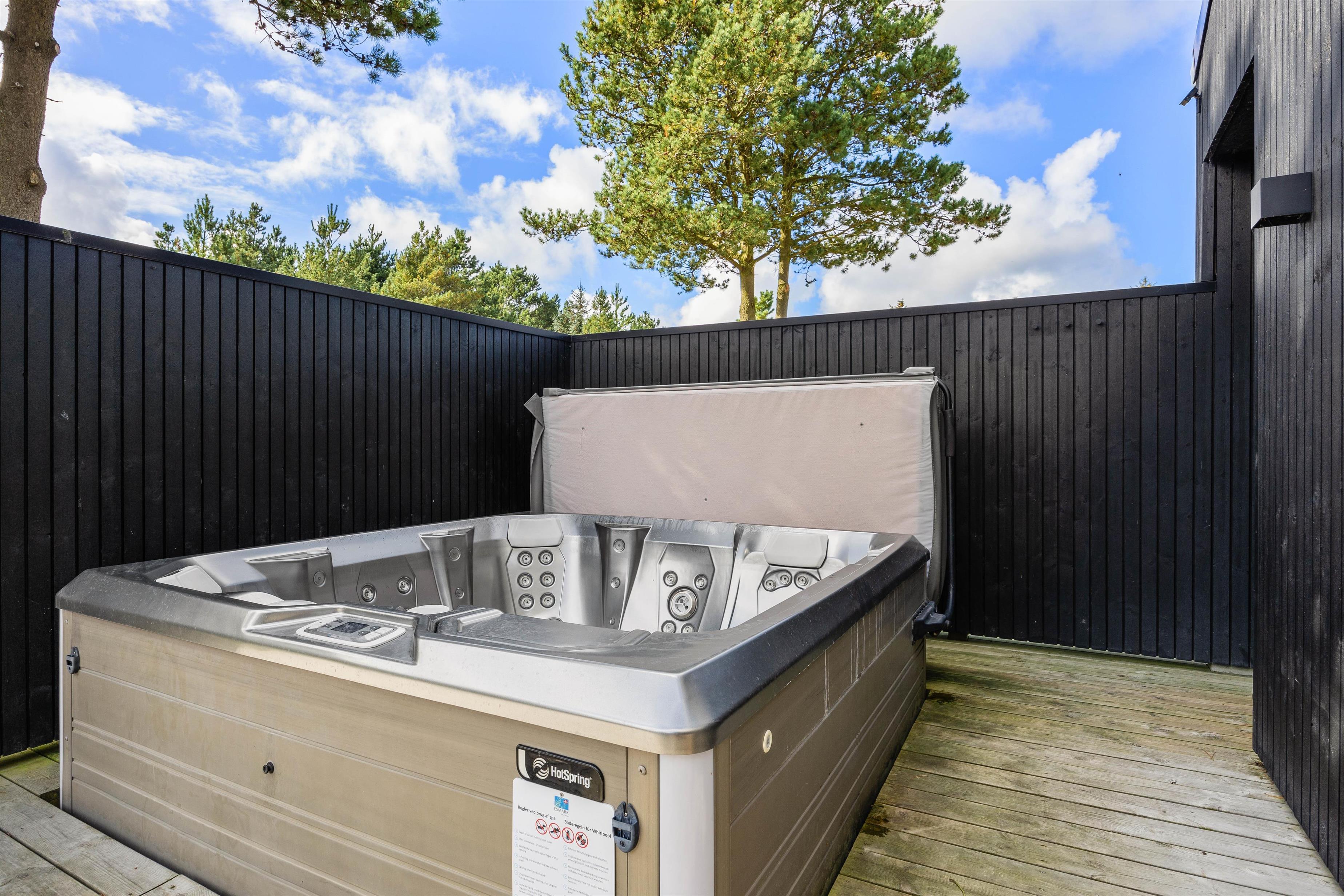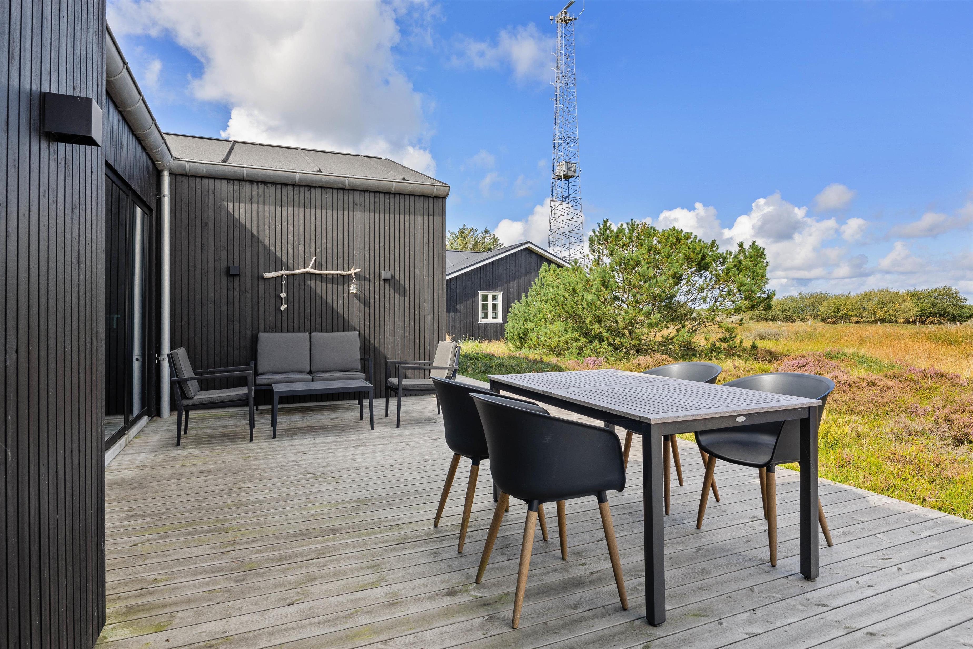 En stor træterrasse sørger for, at I på bedste vis kan nyde den friske luft og den vestjyske natur på ferien. Terrassen er både åben og afskærmet, og der er god plads til, at alle 8 feriegæster kan finde en plads i solen – og måske hopper et par stykker i udespaen?