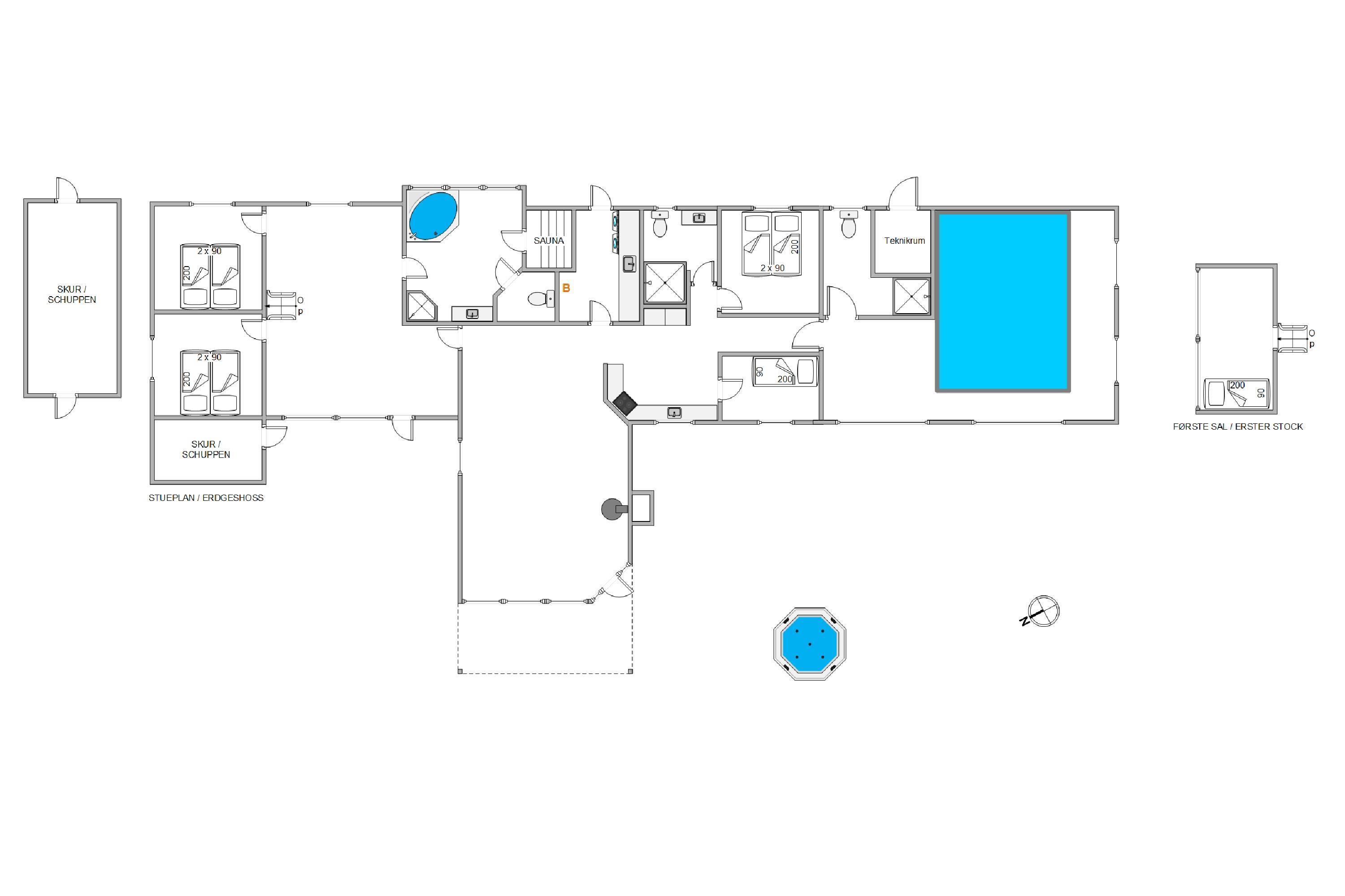 I 3 af soverummene står der behagelige dobbeltsenge og de 2 sidste sovepladser fordeler sig med en enkeltseng i et værelse ved køkkenet, og en madras på hemsen. De 2 badeværelser har begge gulvvarme, og det største rum har også en lækker 2-personers spa og en sauna.