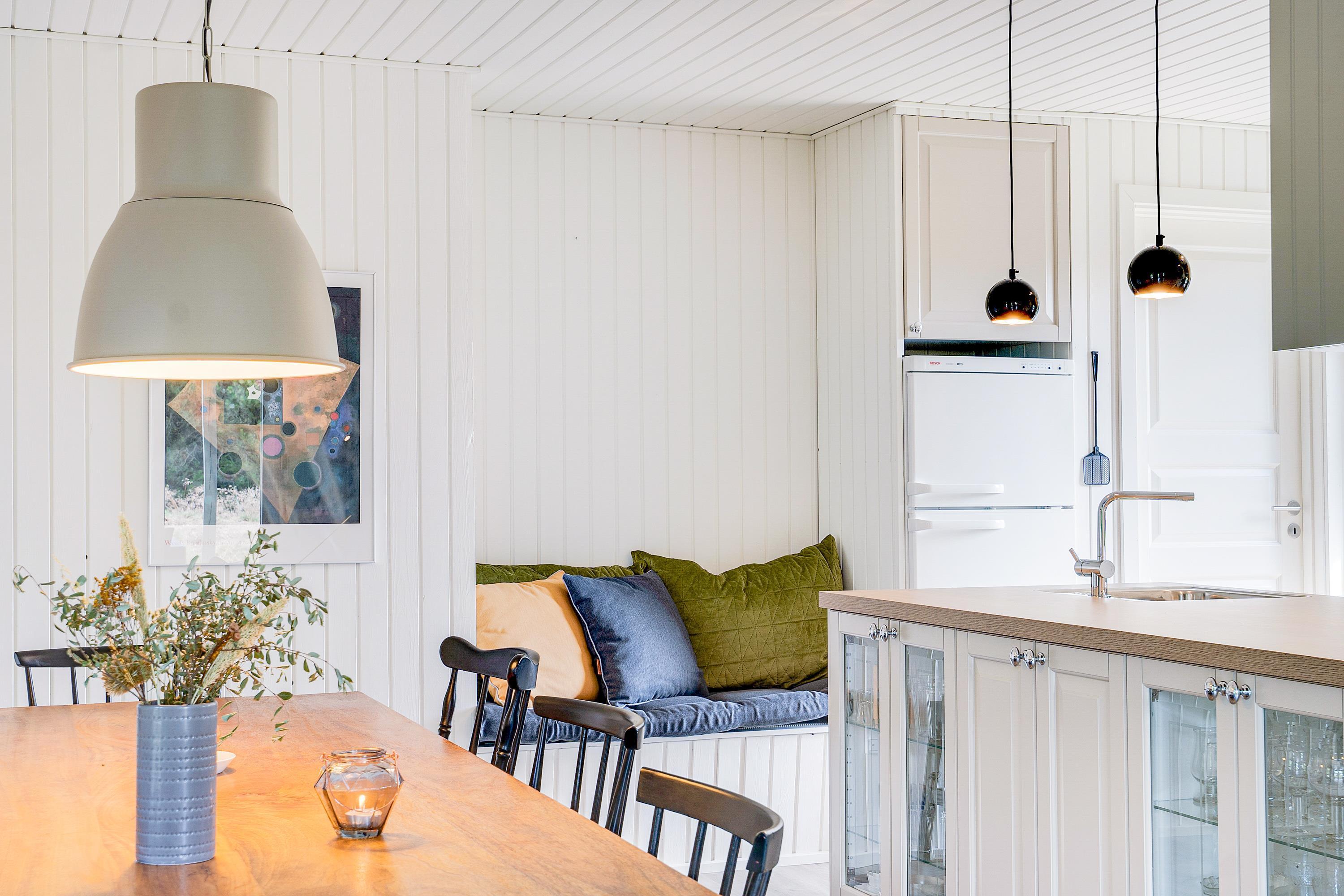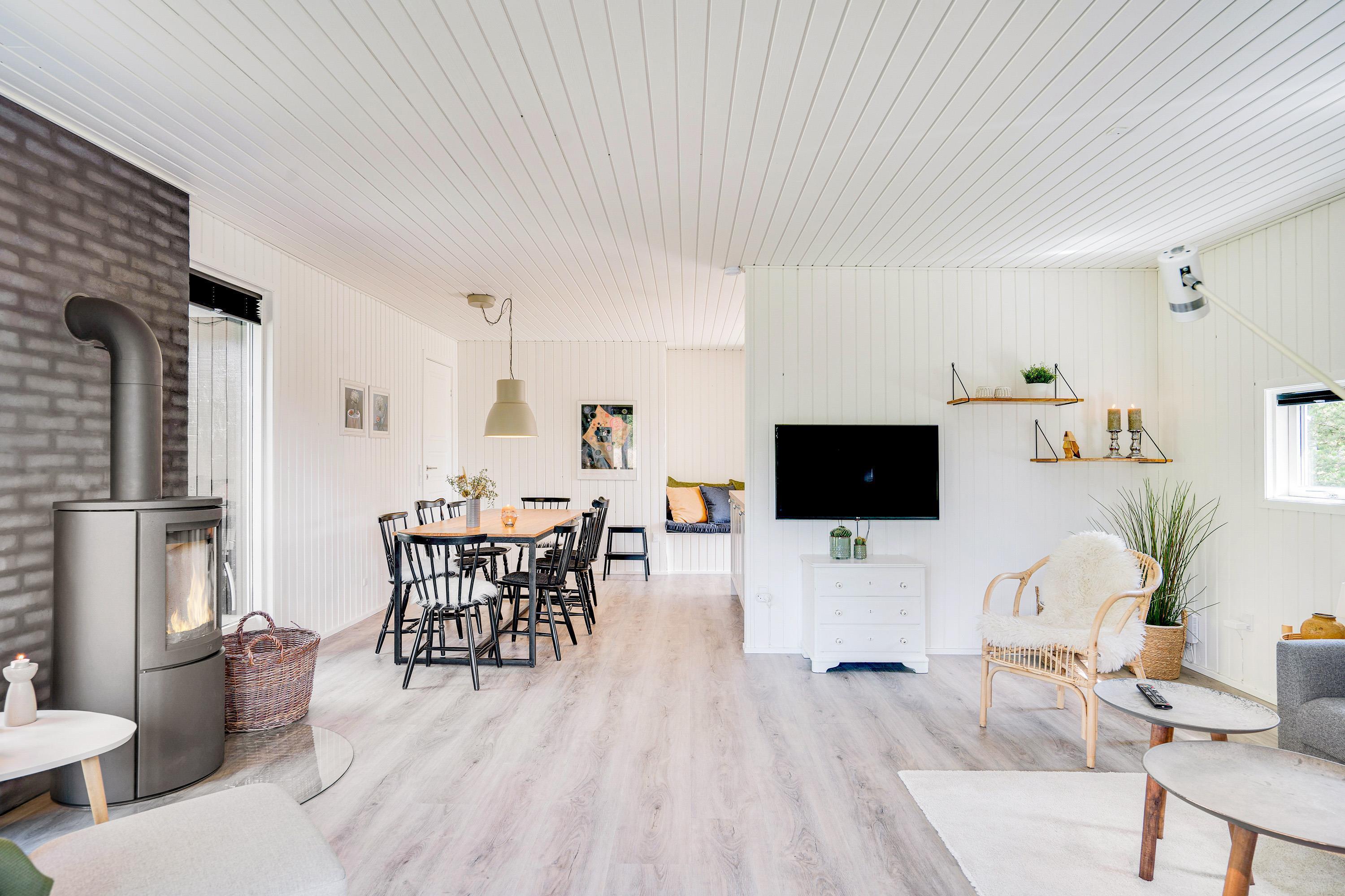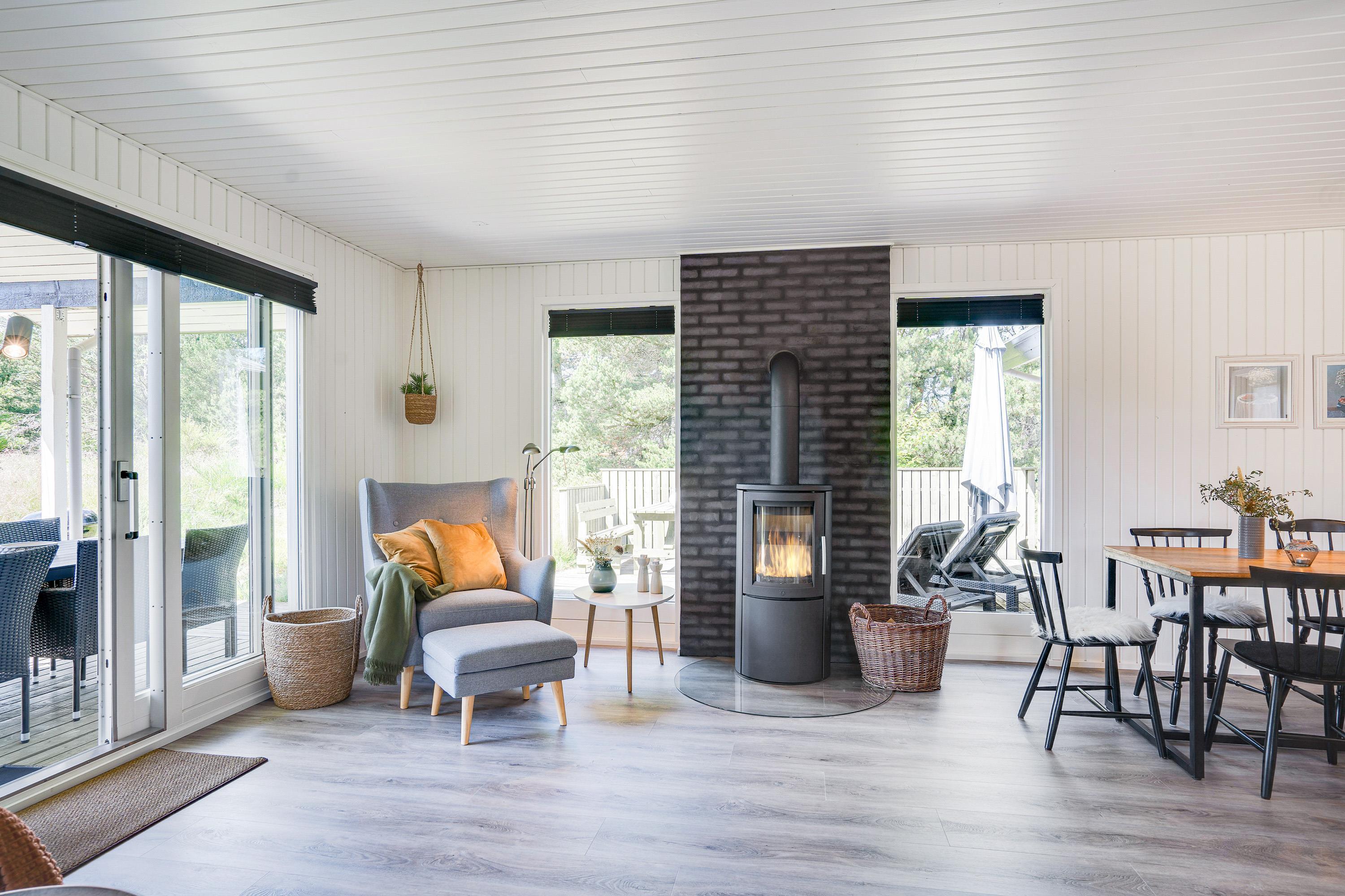 Det klassiske træsommerhus byder på skønne detaljer både inde og ude. Rummene er hyggeligt indrettet med lyse farver og der er tænkt på komforten fx med en lækker hjørnesofa og en lænestol med læselys ved brændeovnen - det perfekte sted en et par times afslapning med en god bog eller en varm kop te.