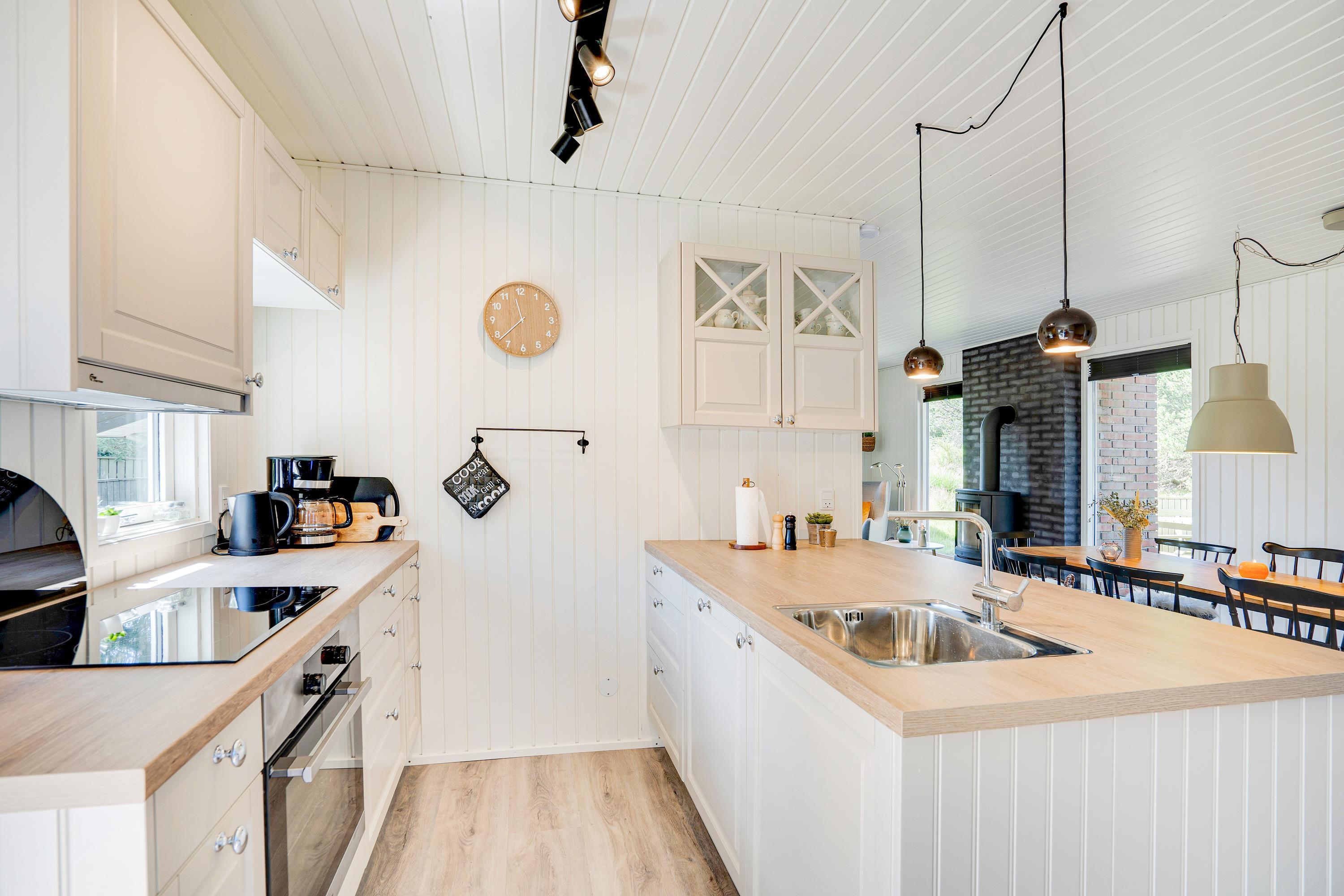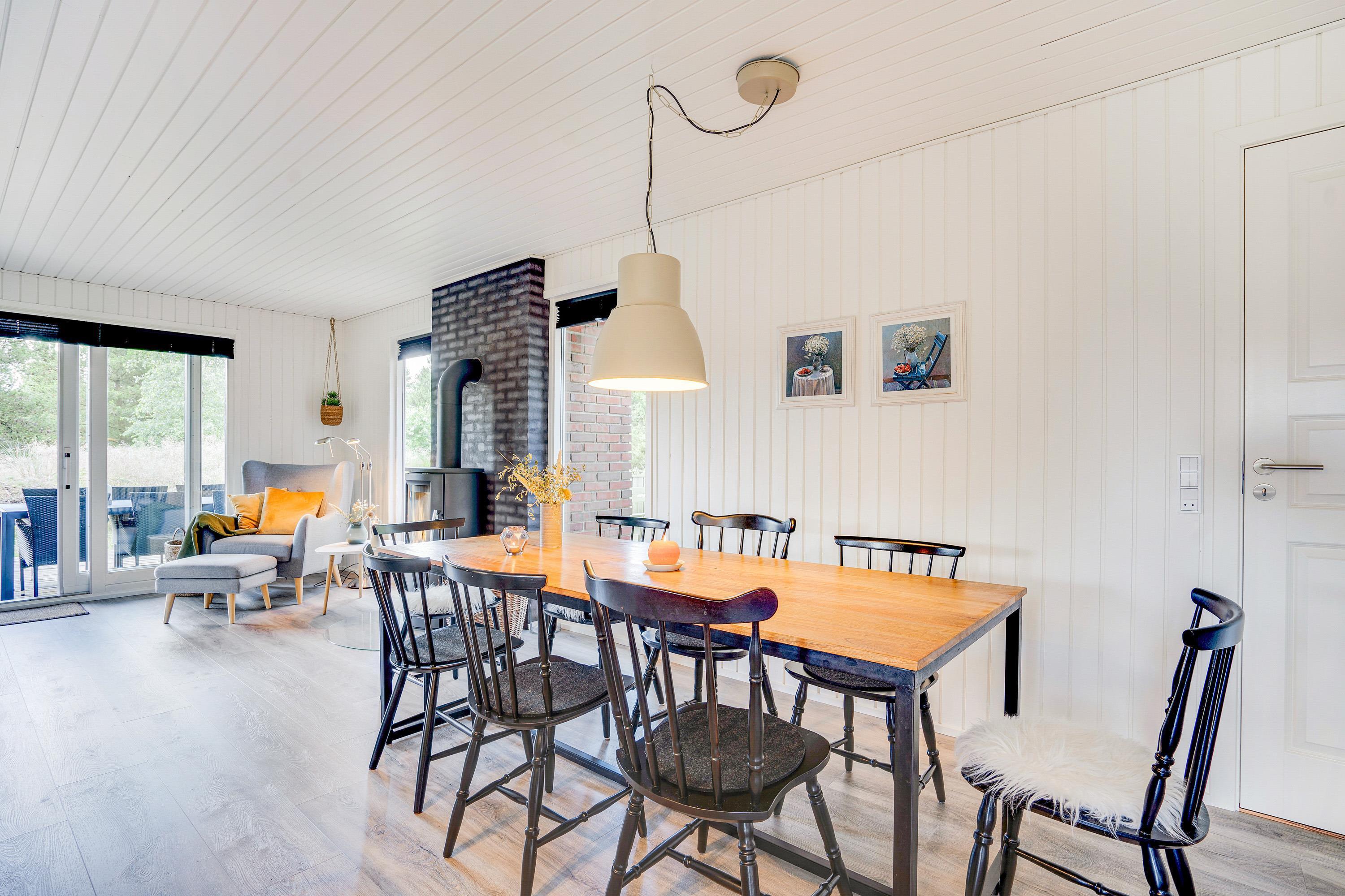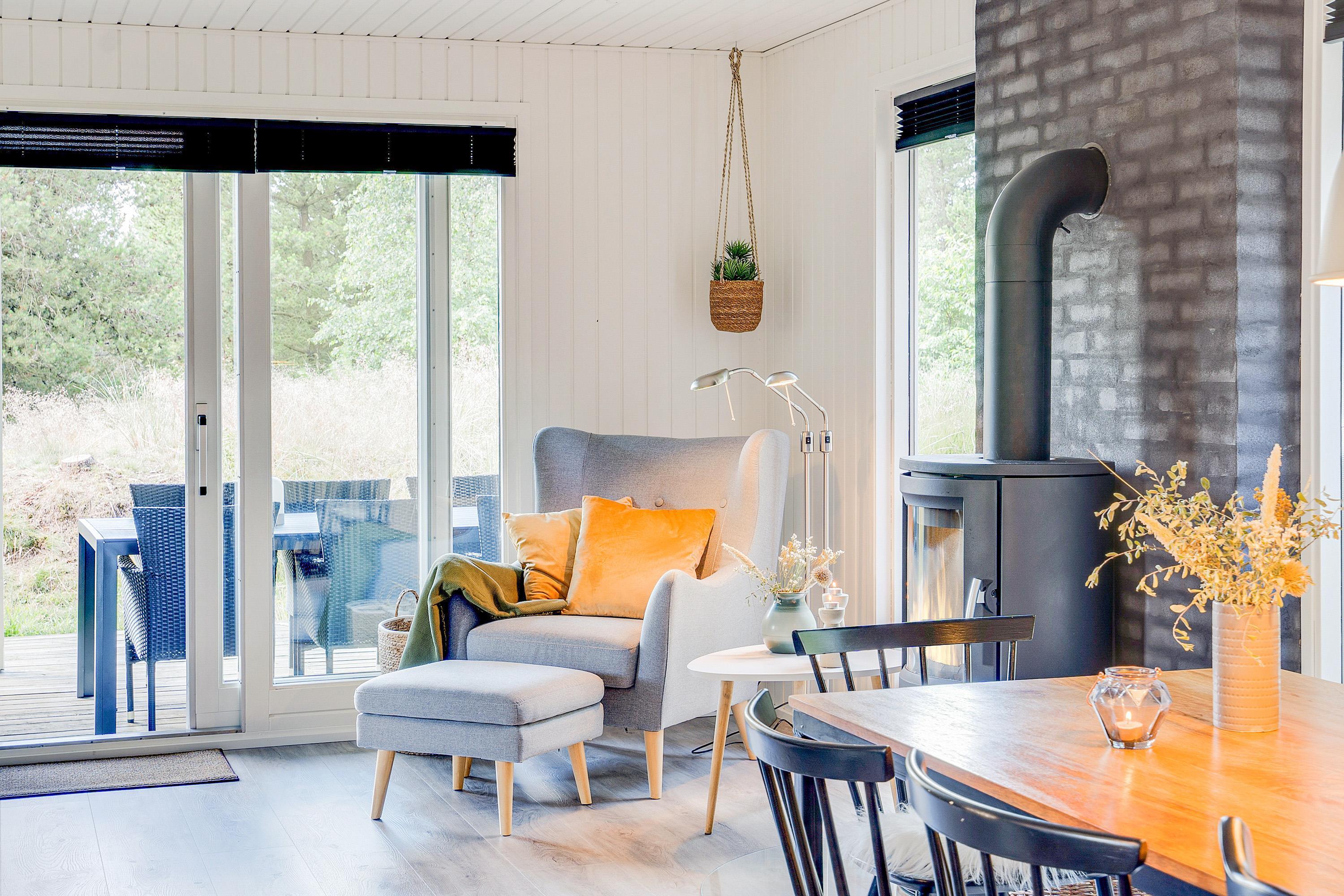 Det klassiske træsommerhus byder på skønne detaljer både inde og ude. Rummene er hyggeligt indrettet med lyse farver og der er tænkt på komforten fx med en lækker hjørnesofa og en lænestol med læselys ved brændeovnen - det perfekte sted en et par times afslapning med en god bog eller en varm kop te.