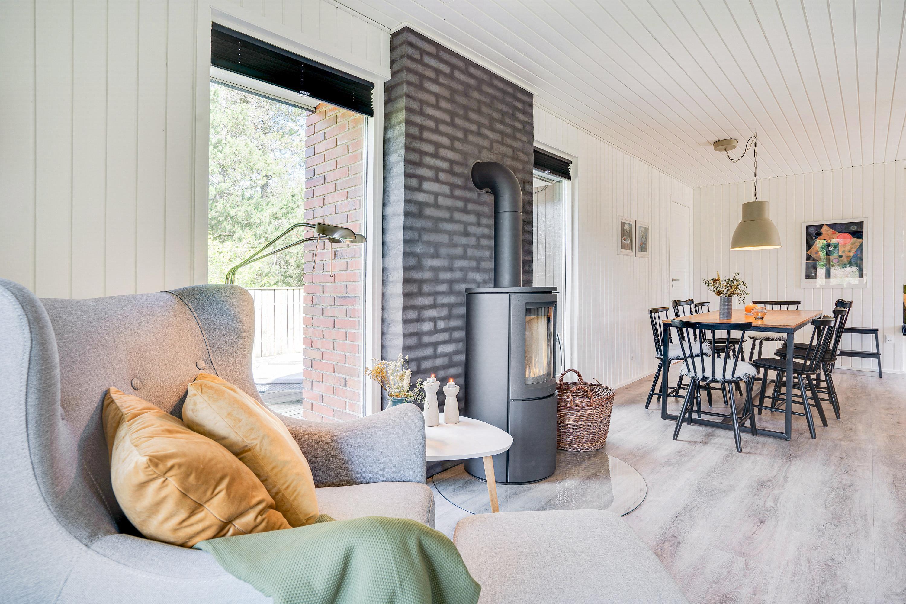 Lys og venlig indretning med brændeovn som prikken over i'et
