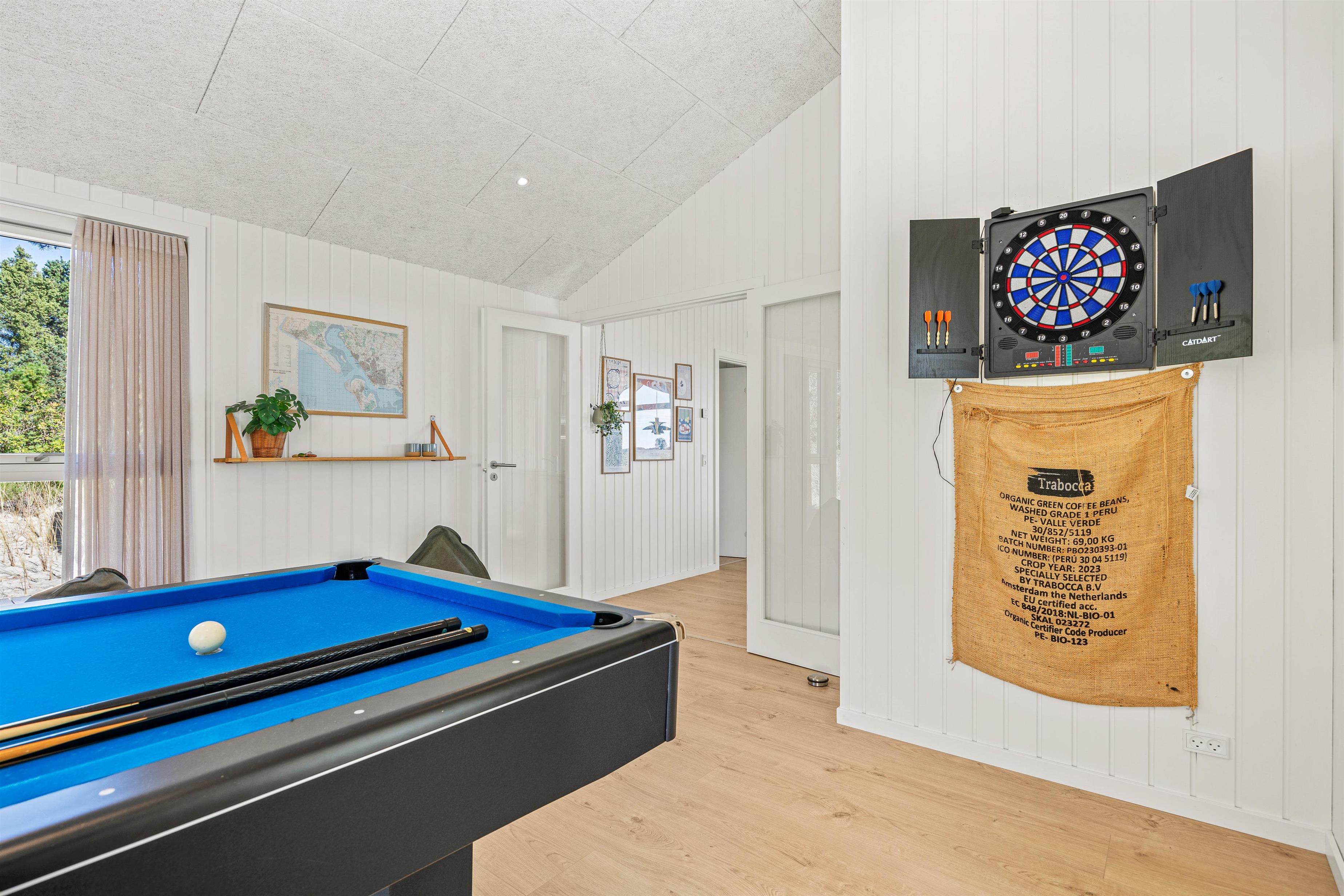 De fire soveværelser er udstyret med gode dobbeltsenge, hvor I kan få den bedste nattesøvn til morgendagens aktiviteter. De to badeværelser med gulvvarme og begge med fluenet i vinduerne ligger godt fordelt i huset; i det ene er der desuden badekar, så I kan slutte dagen af med et afslappende karbad – måske med et køligt glas vin. I aktivitetsrummet, som ligger adskilt fra køkken-alrummet, kan både børn og voksne brænde ekstra energi af ved at spille billard eller bordtennis og måske finde feriens mester. I kan også kaste jer over et af husets mange brætspil.