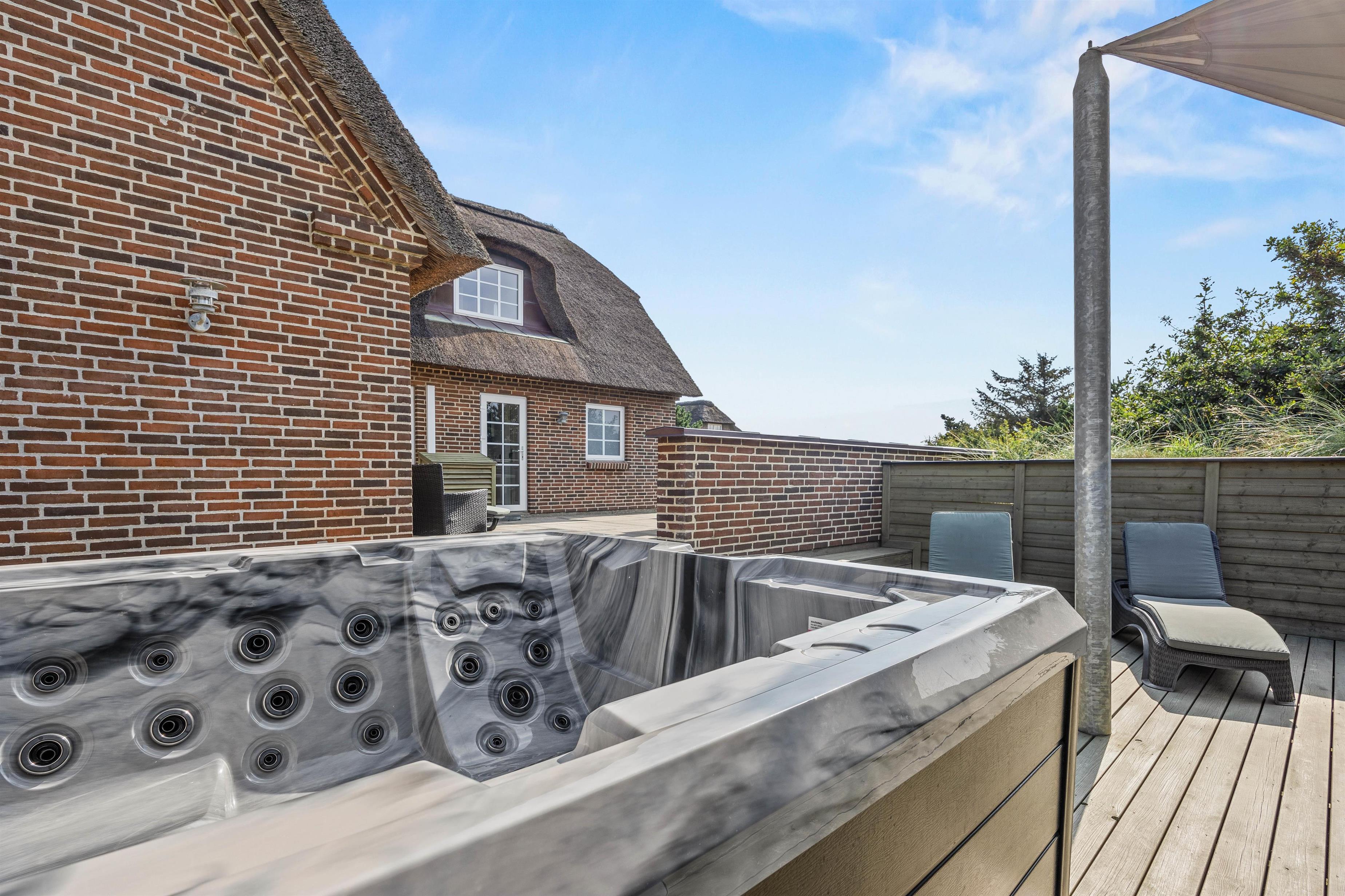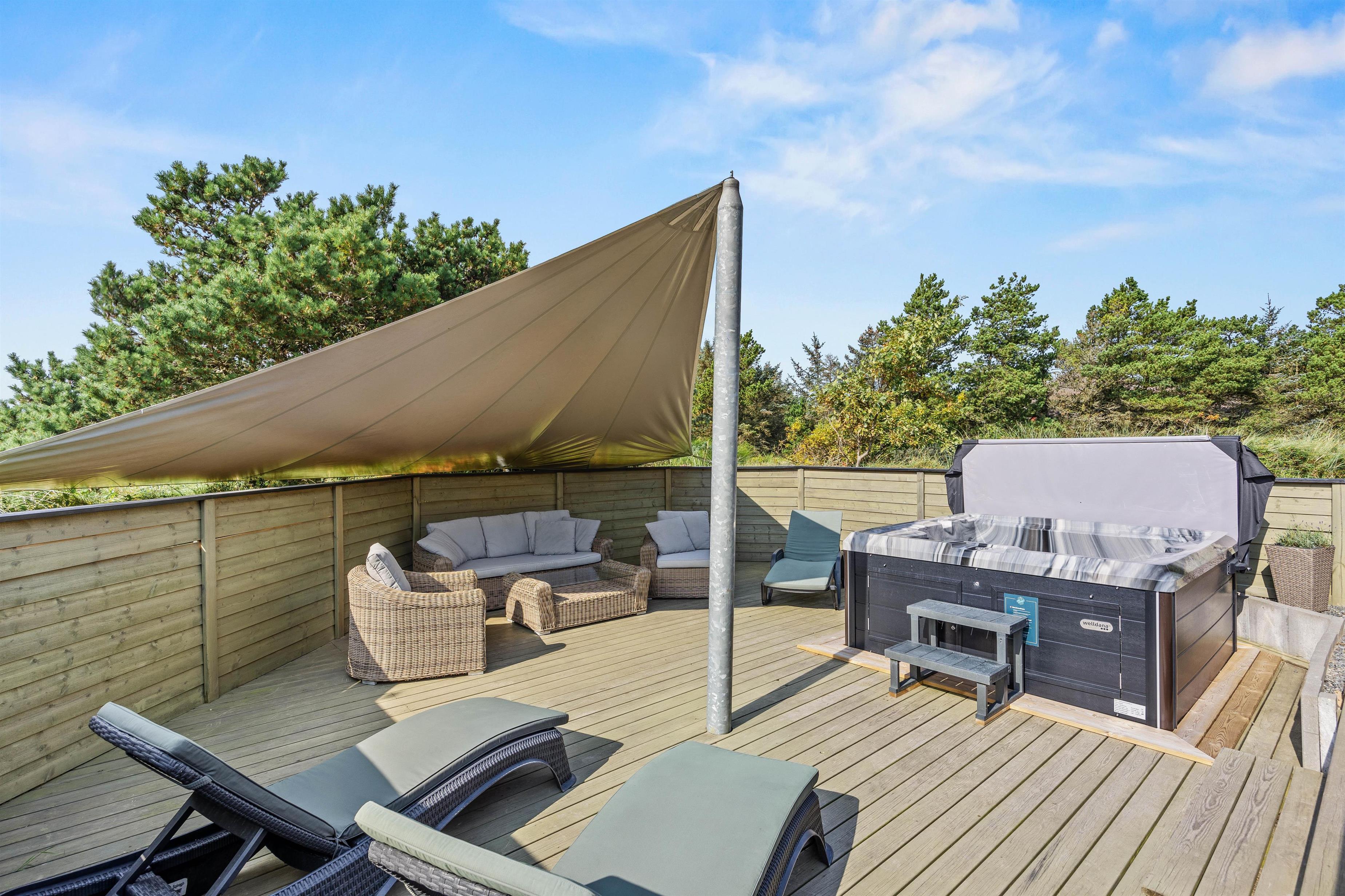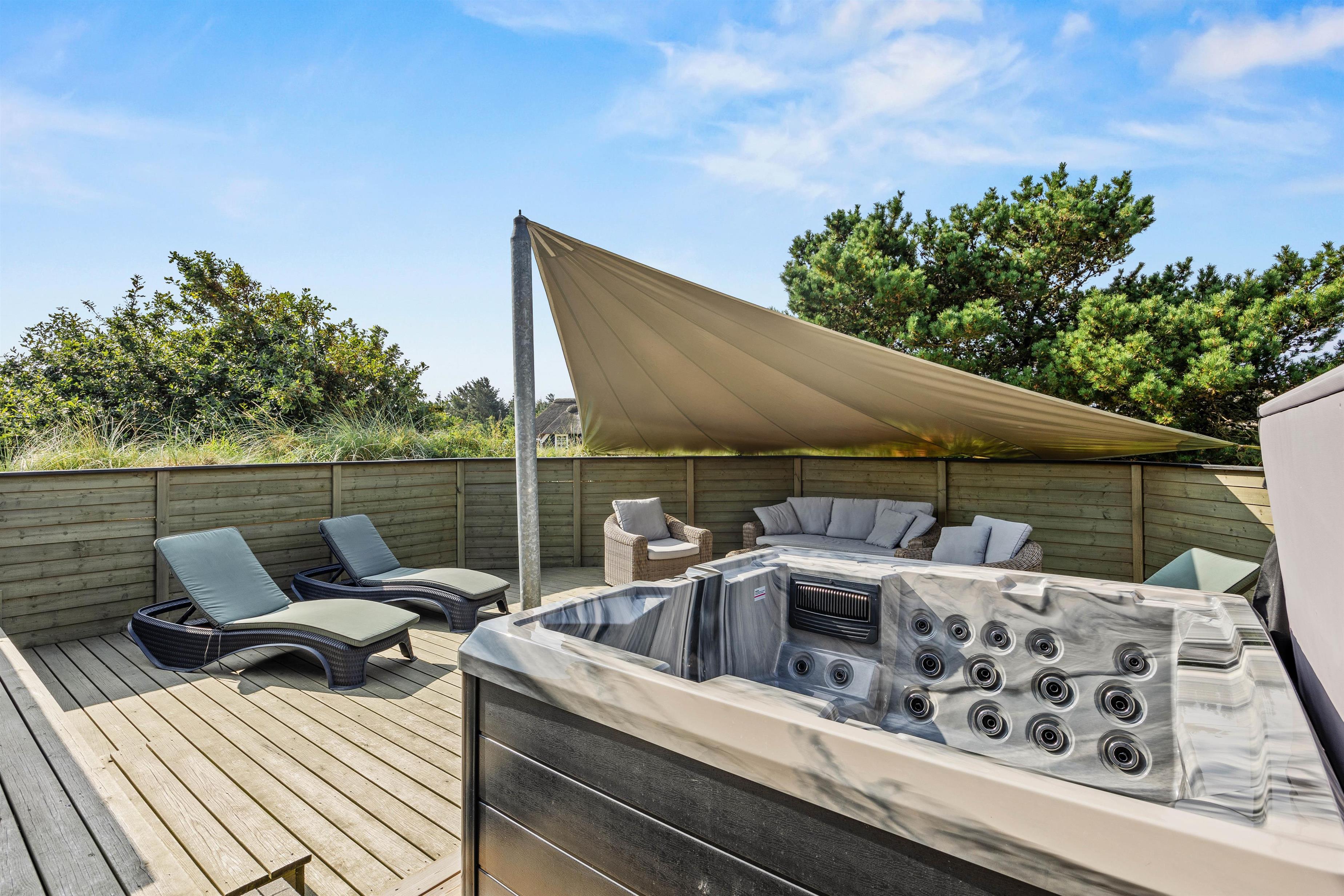 Til huset hører en dejlig terrasse, hvor wellness og velvære igen kommer i fokus med det lækre udendørs spabad og lounge-møbler. Læn jer tilbage i liggestolene, mens børnene bader, eller hop i det varme boblebad på en stjerneklar aften og nyd udsigten og roen.