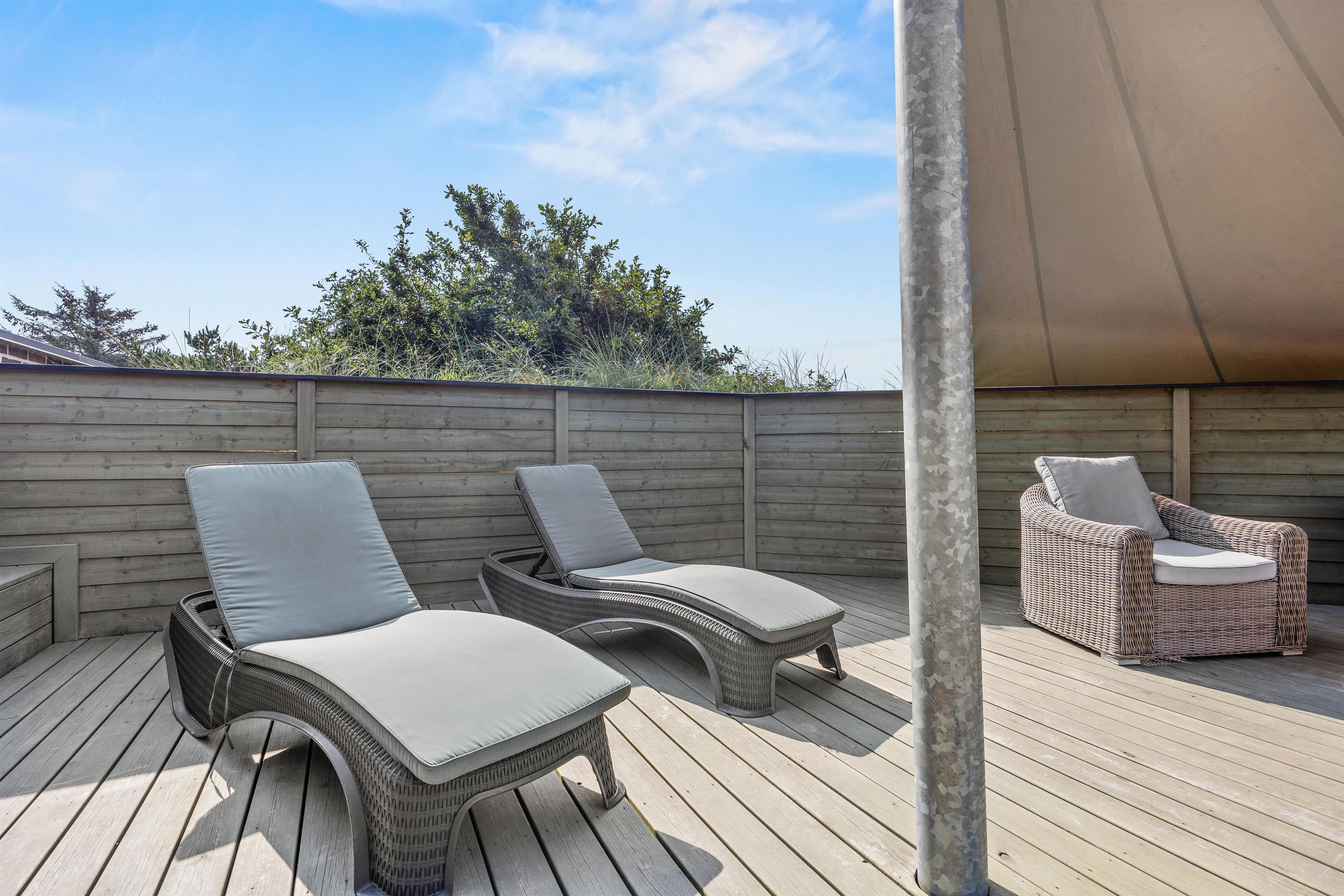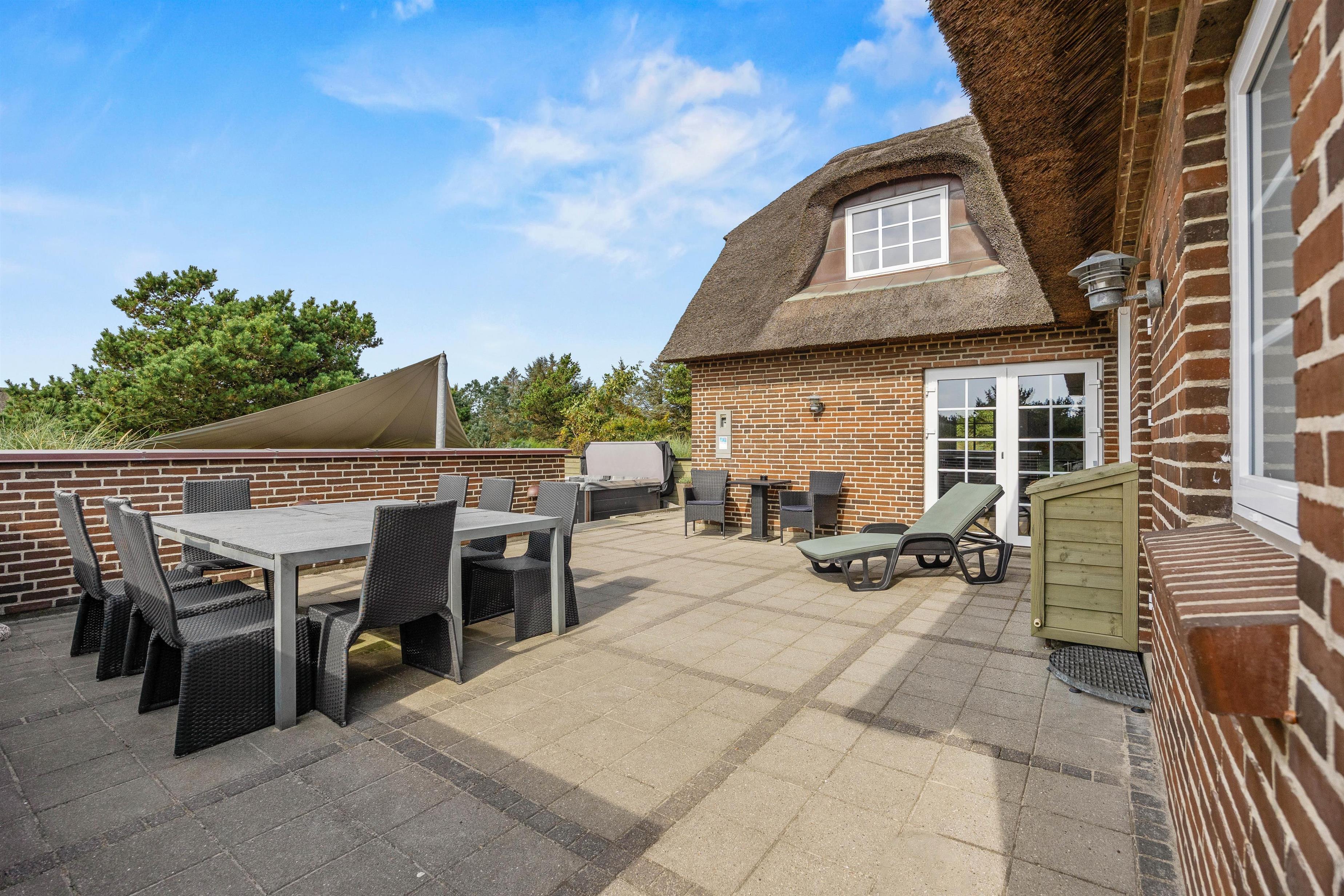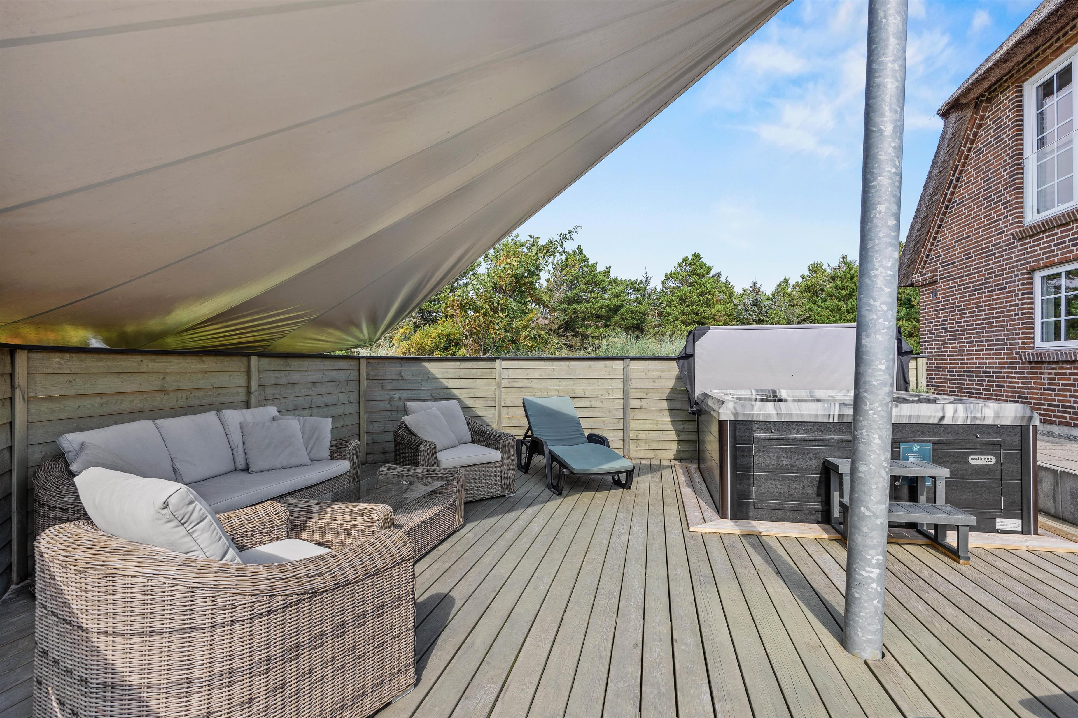 Til huset hører en dejlig terrasse, hvor wellness og velvære igen kommer i fokus med det lækre udendørs spabad og lounge-møbler. Læn jer tilbage i liggestolene, mens børnene bader, eller hop i det varme boblebad på en stjerneklar aften og nyd udsigten og roen.