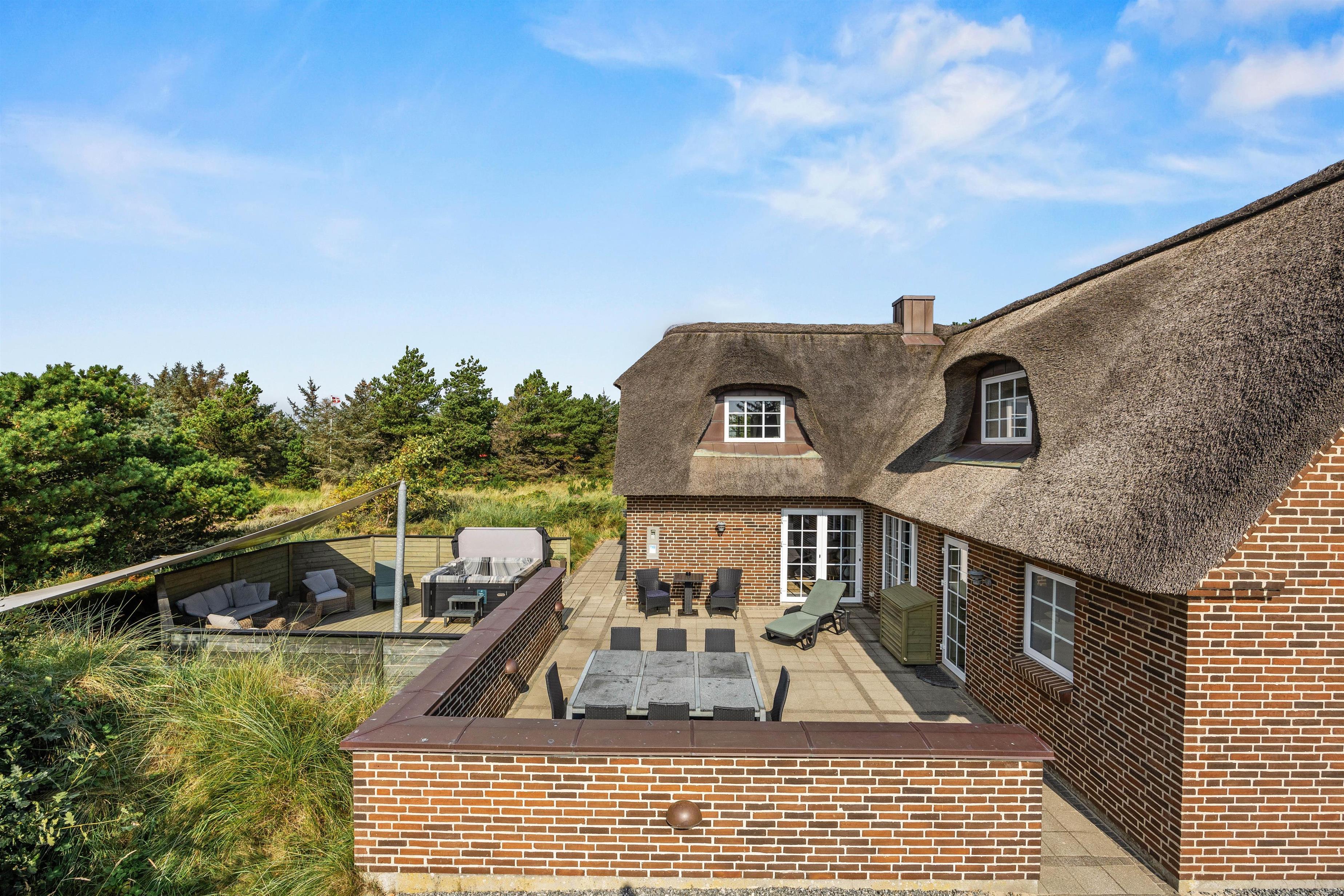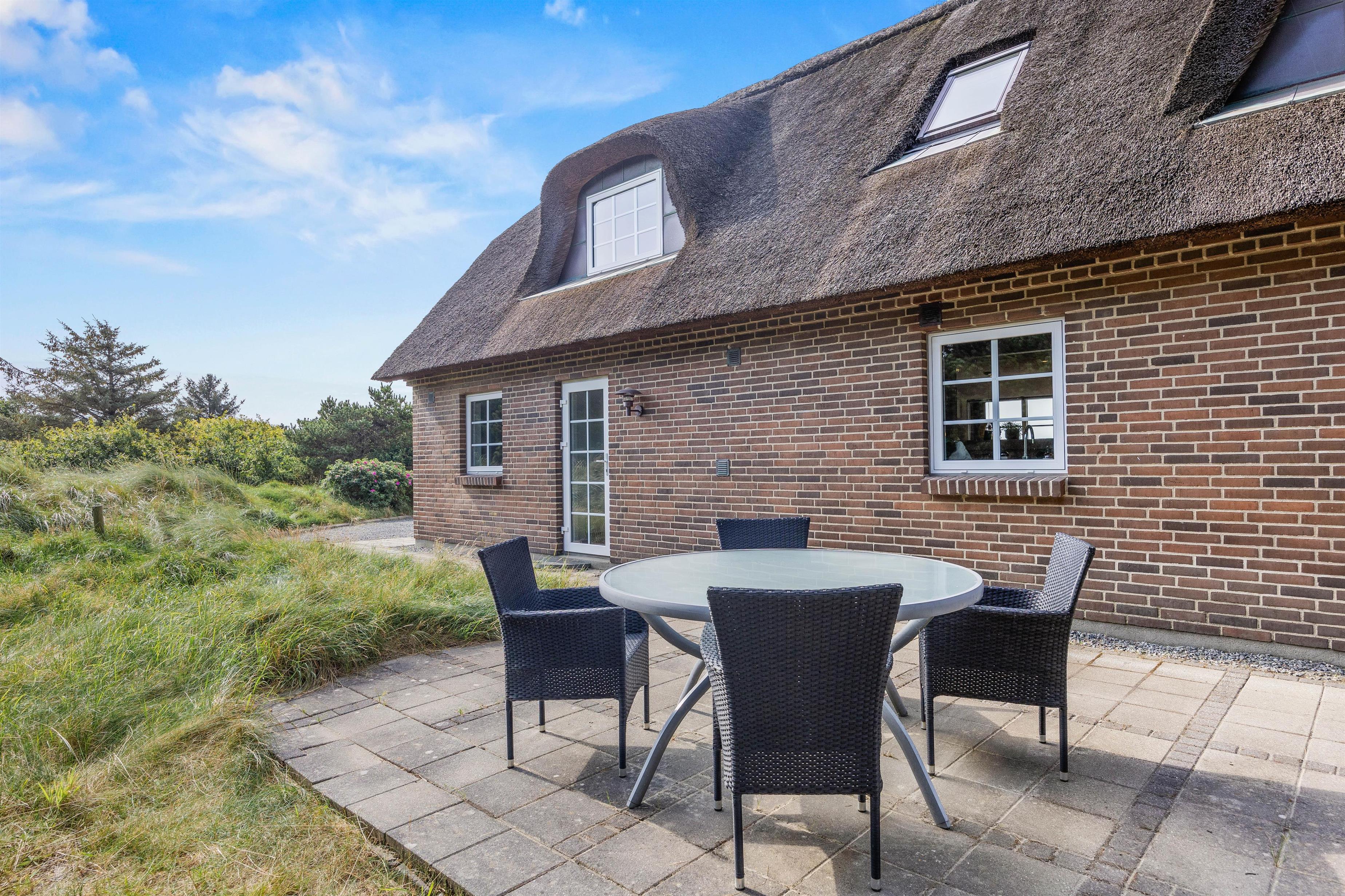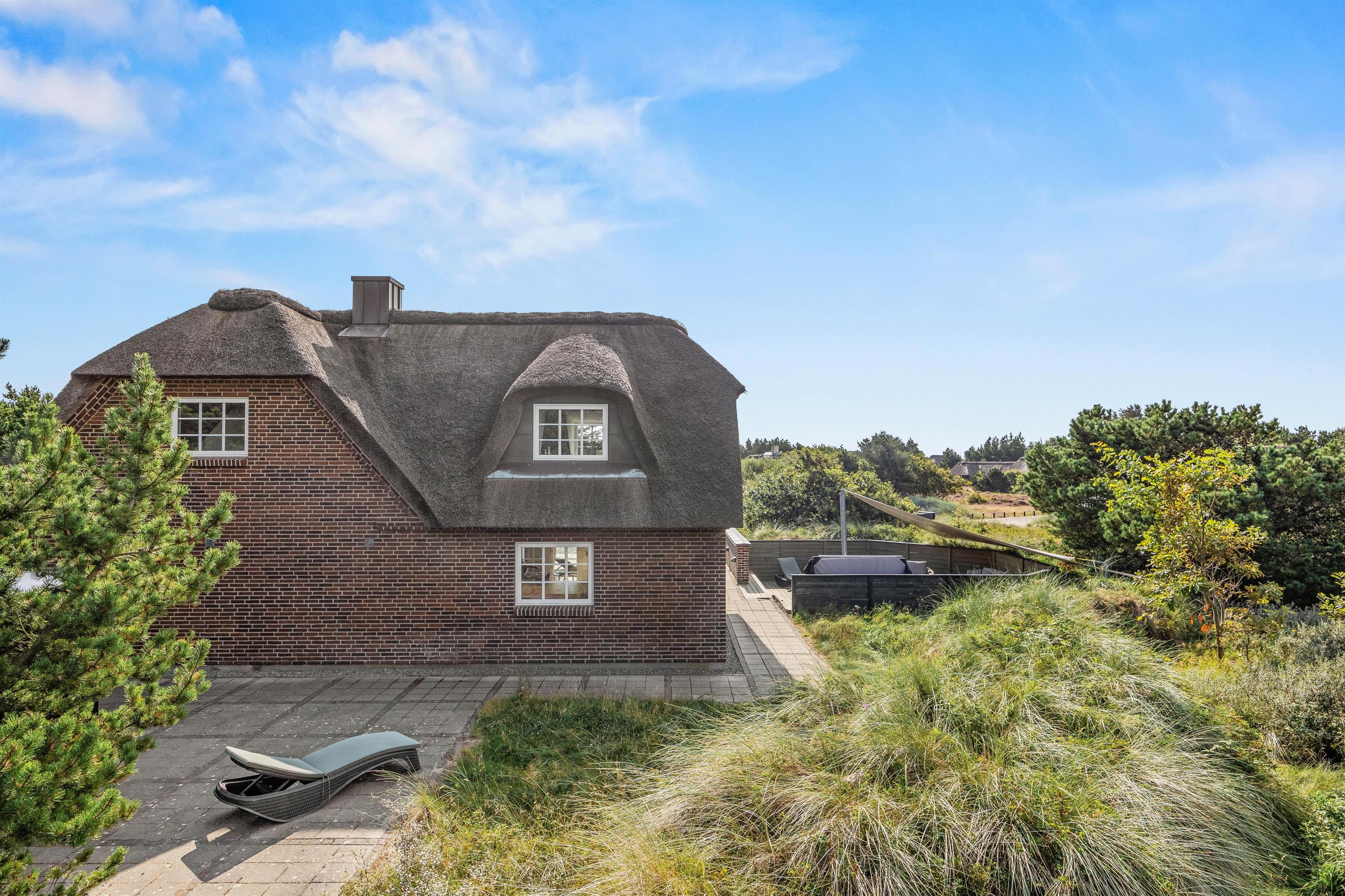 Det hyggelige murstenshus med stråtag er blevet renoveret i 2018, og det kan tydeligt ses på husets indretning, som er stilfuld og kvalitetsbevidst med flot møblement. De i alt 226 kvadratmeter fordeler sig på to etager, hvor I med op til 10 personer finder god plads - et oplagt valg til den næste familieferie.