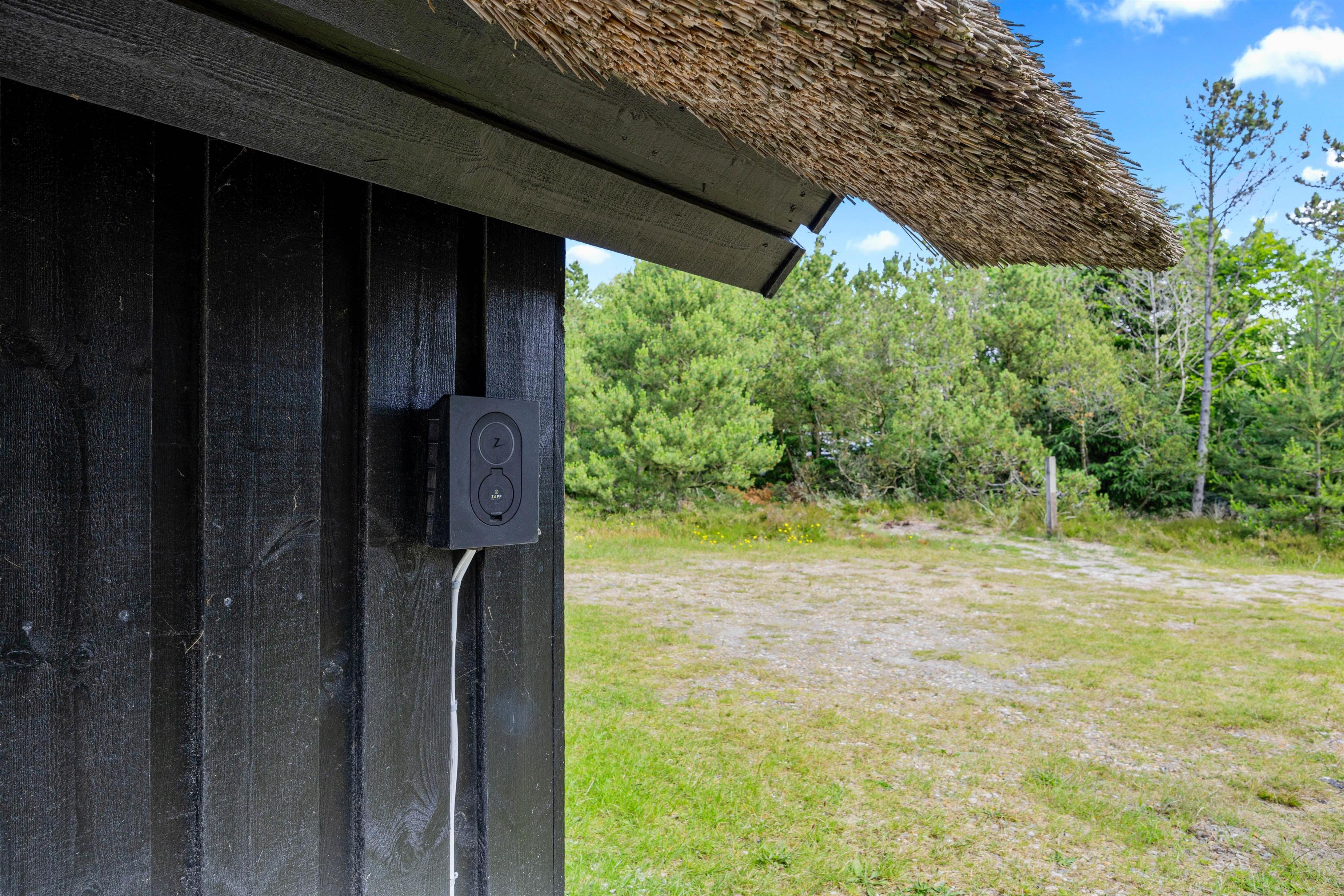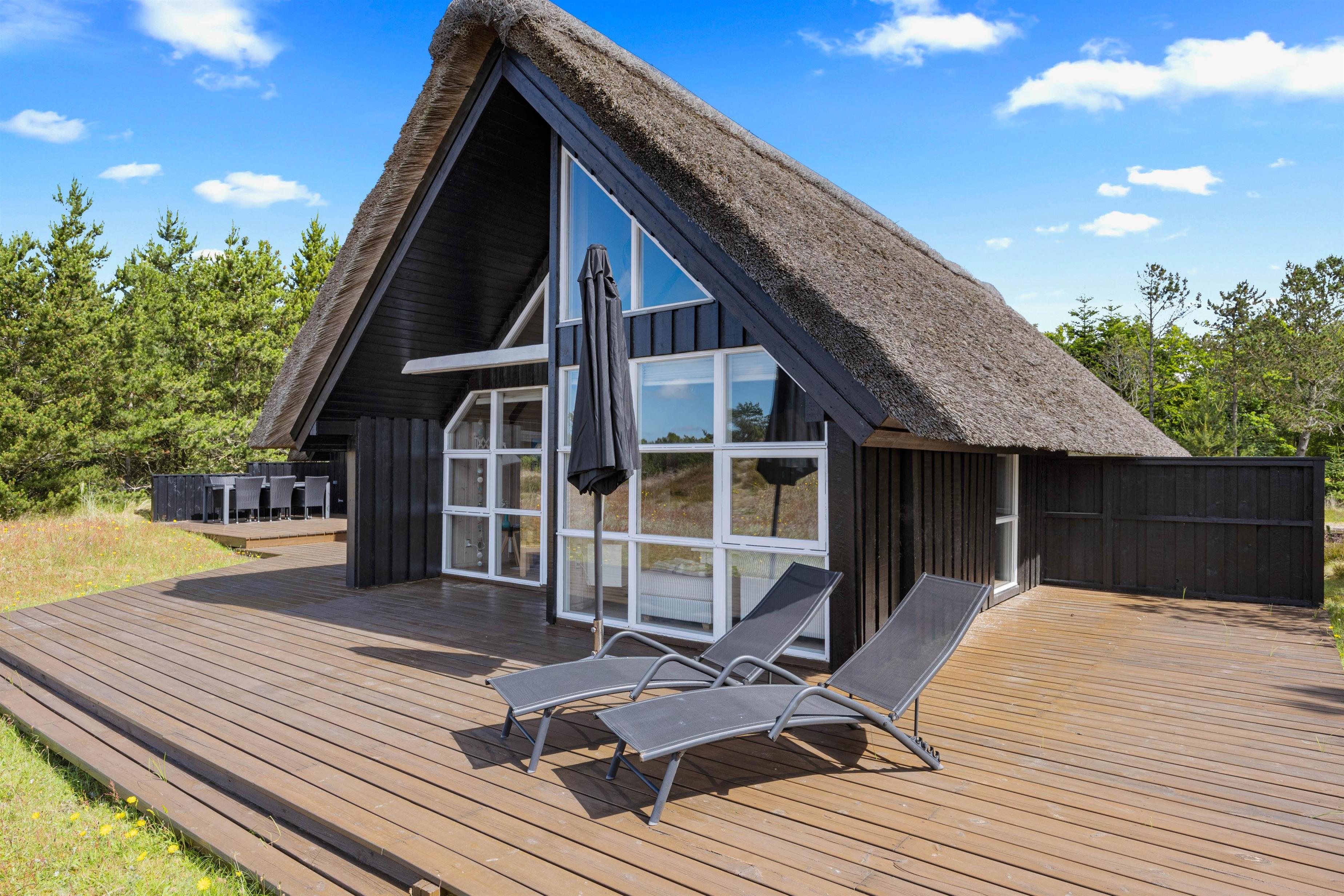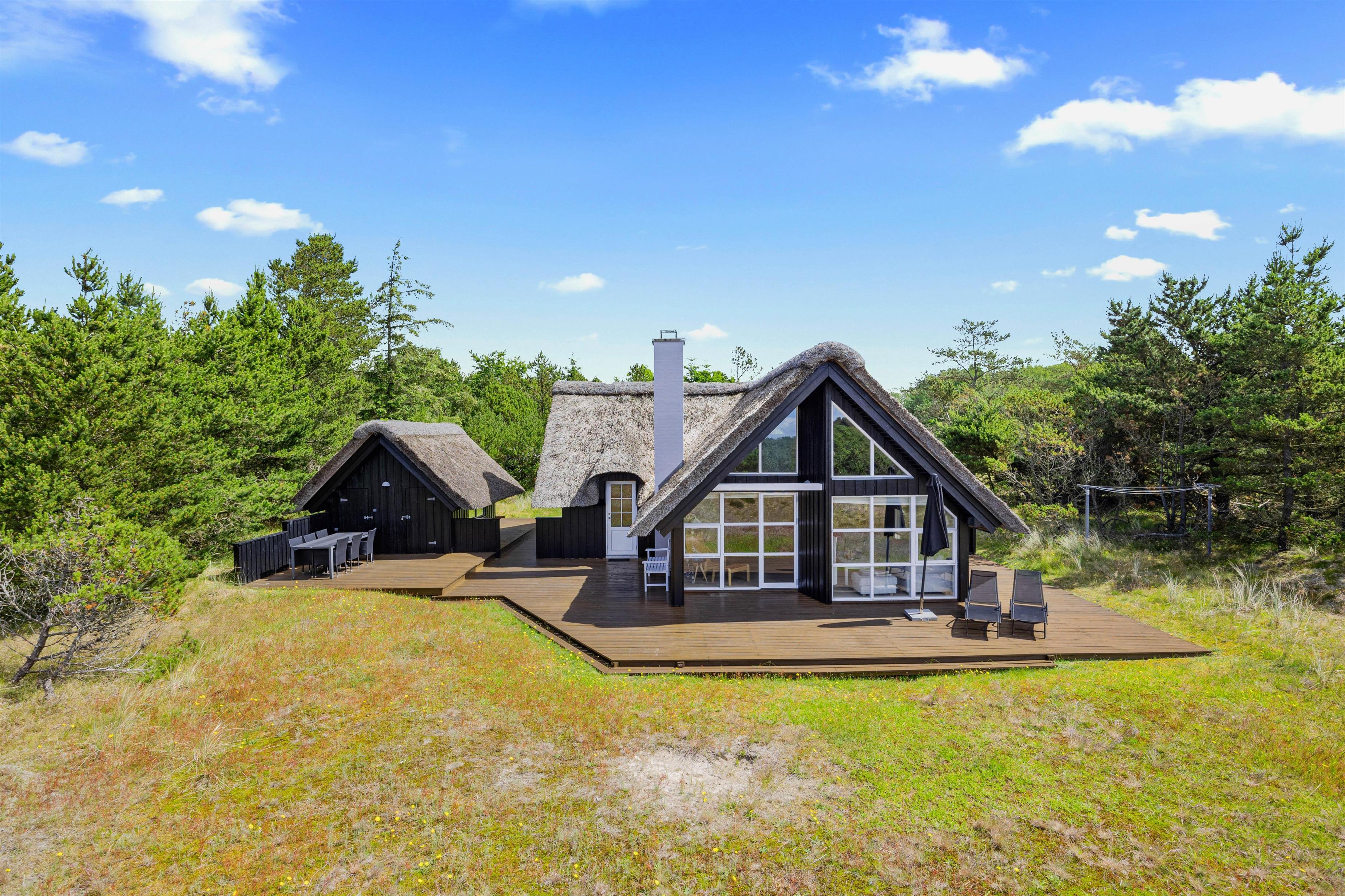 Det stråtækte sommerhus på Bjergbovej 27 er komfortabelt og hyggeligt indrettet med højt til loftet og fritlagte bjælker. Den lyse og rummelige indretning byder bl.a. på et stort køkkenalrum med plads til hele familien. De mørke aftener kan nydes foran brændeovnen eller omkring det store spisebord med et brætspil eller en god kop kaffe.