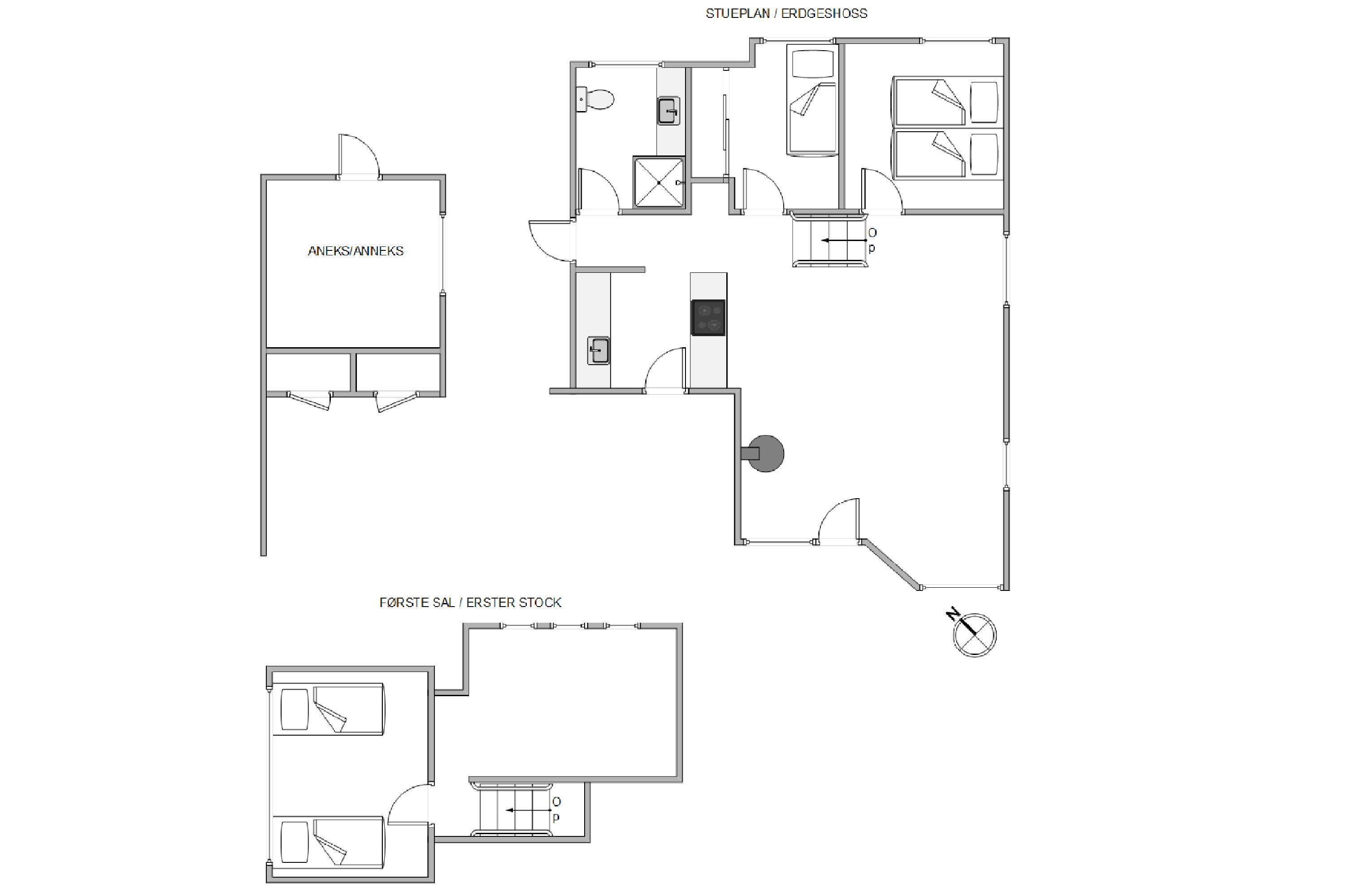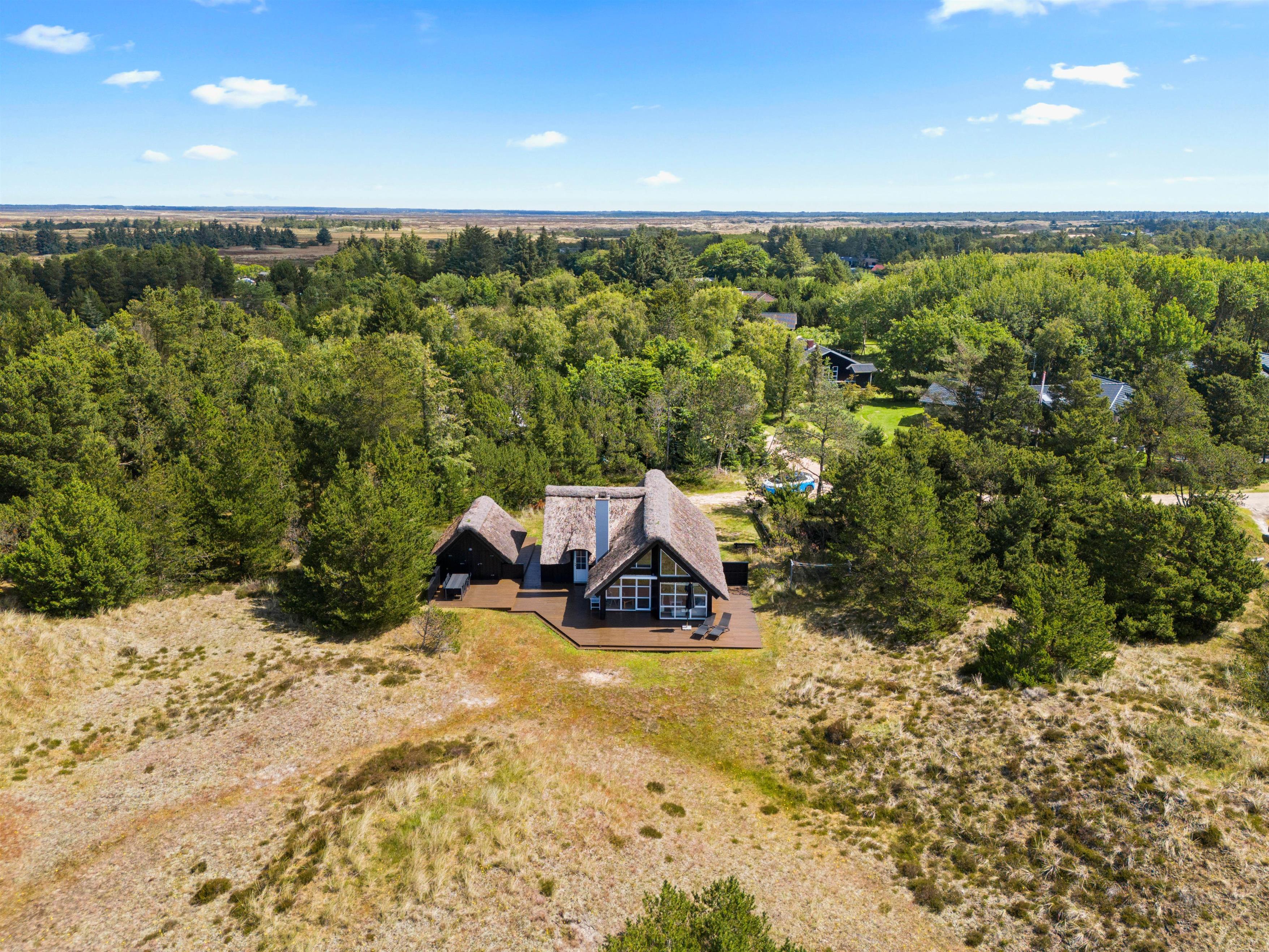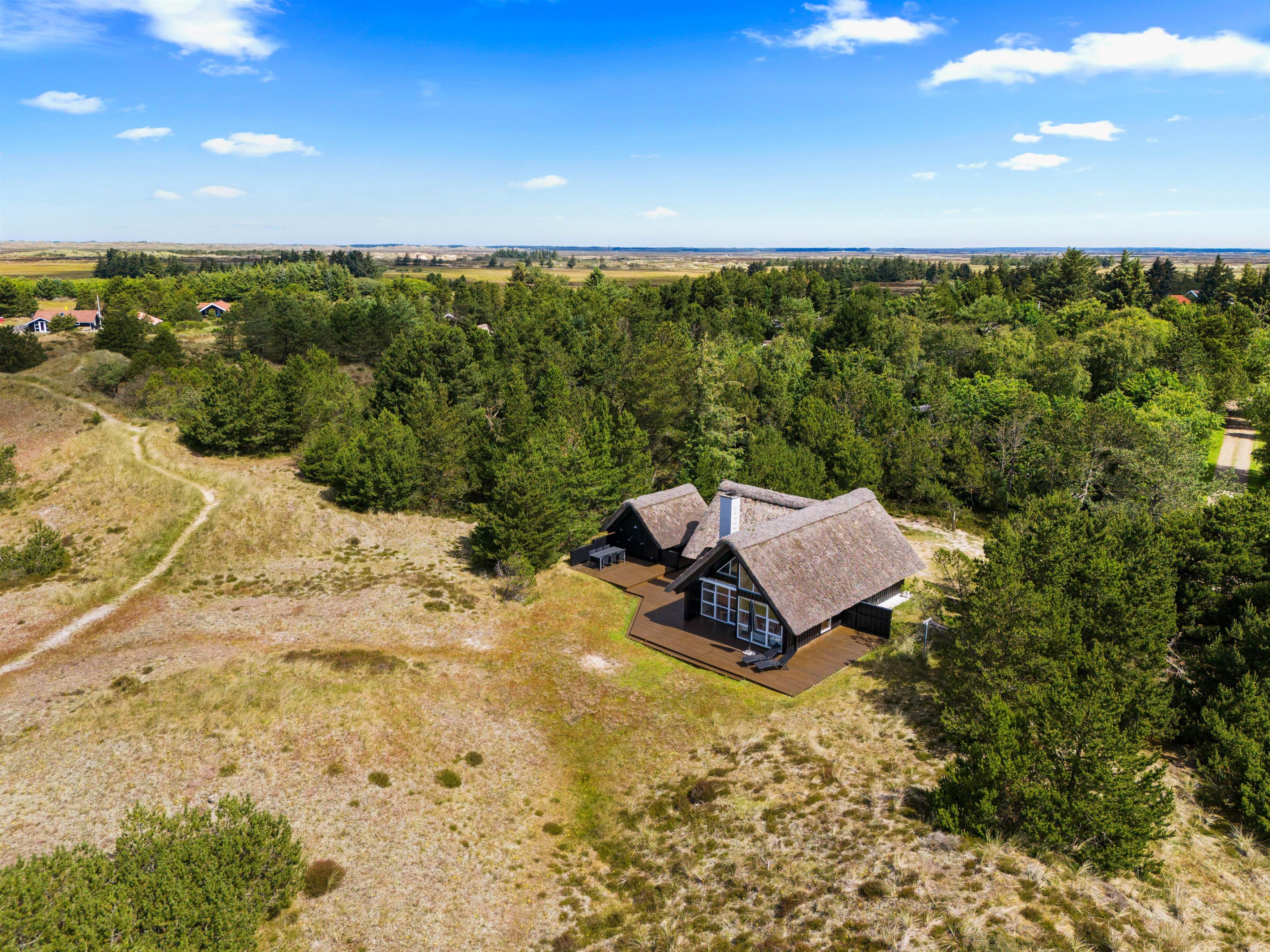 Det stråtækte sommerhus på Bjergbovej 27 er komfortabelt og hyggeligt indrettet med højt til loftet og fritlagte bjælker. Den lyse og rummelige indretning byder bl.a. på et stort køkkenalrum med plads til hele familien. De mørke aftener kan nydes foran brændeovnen eller omkring det store spisebord med et brætspil eller en god kop kaffe.