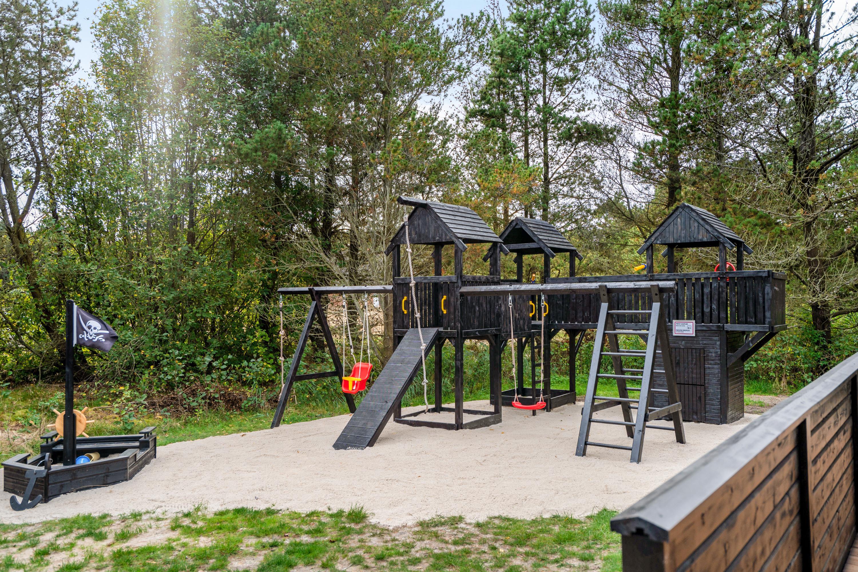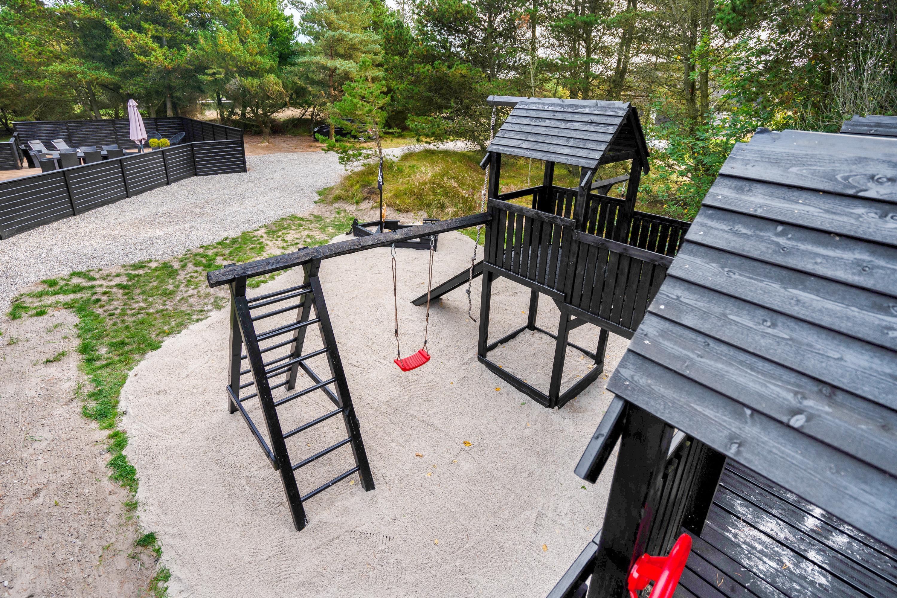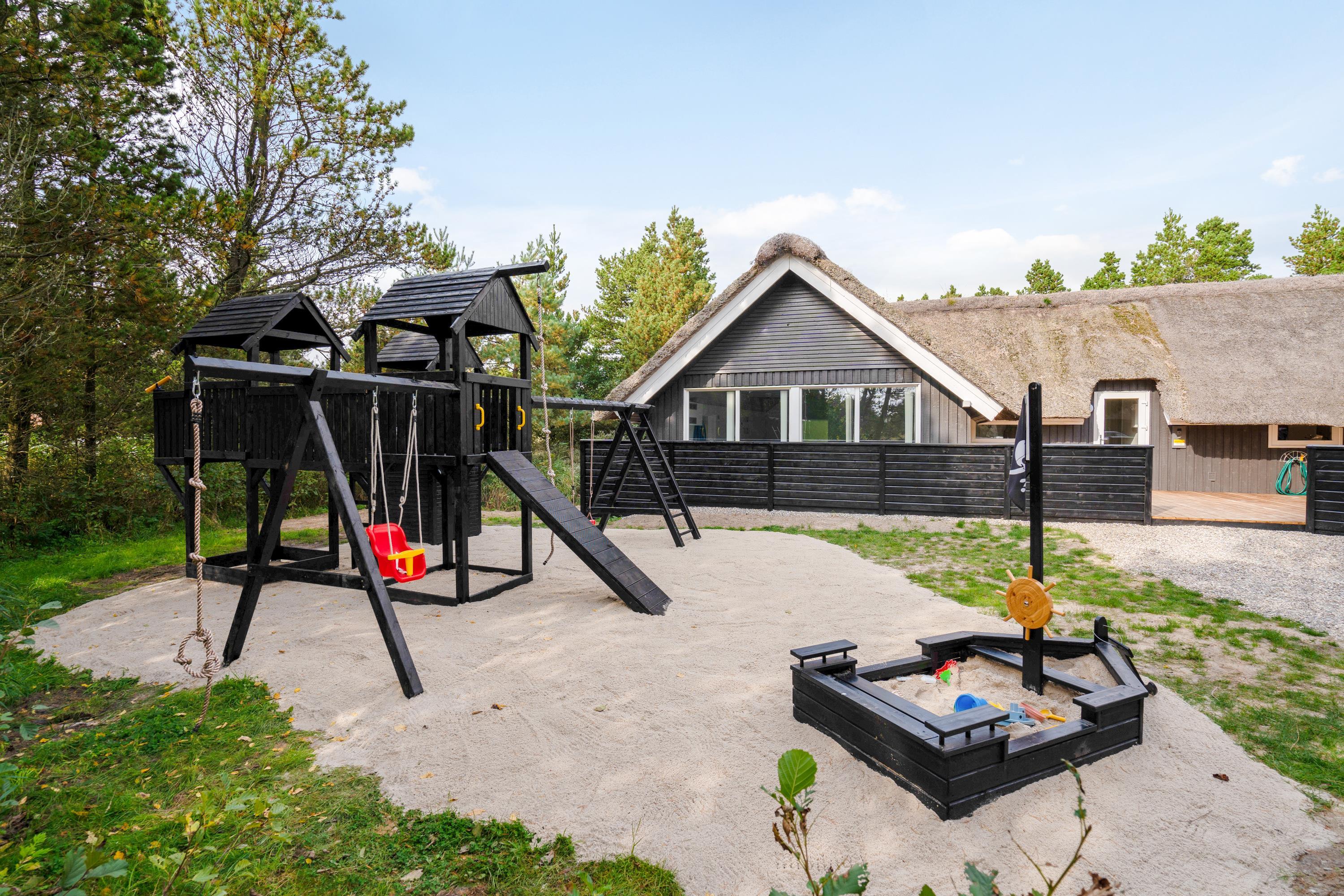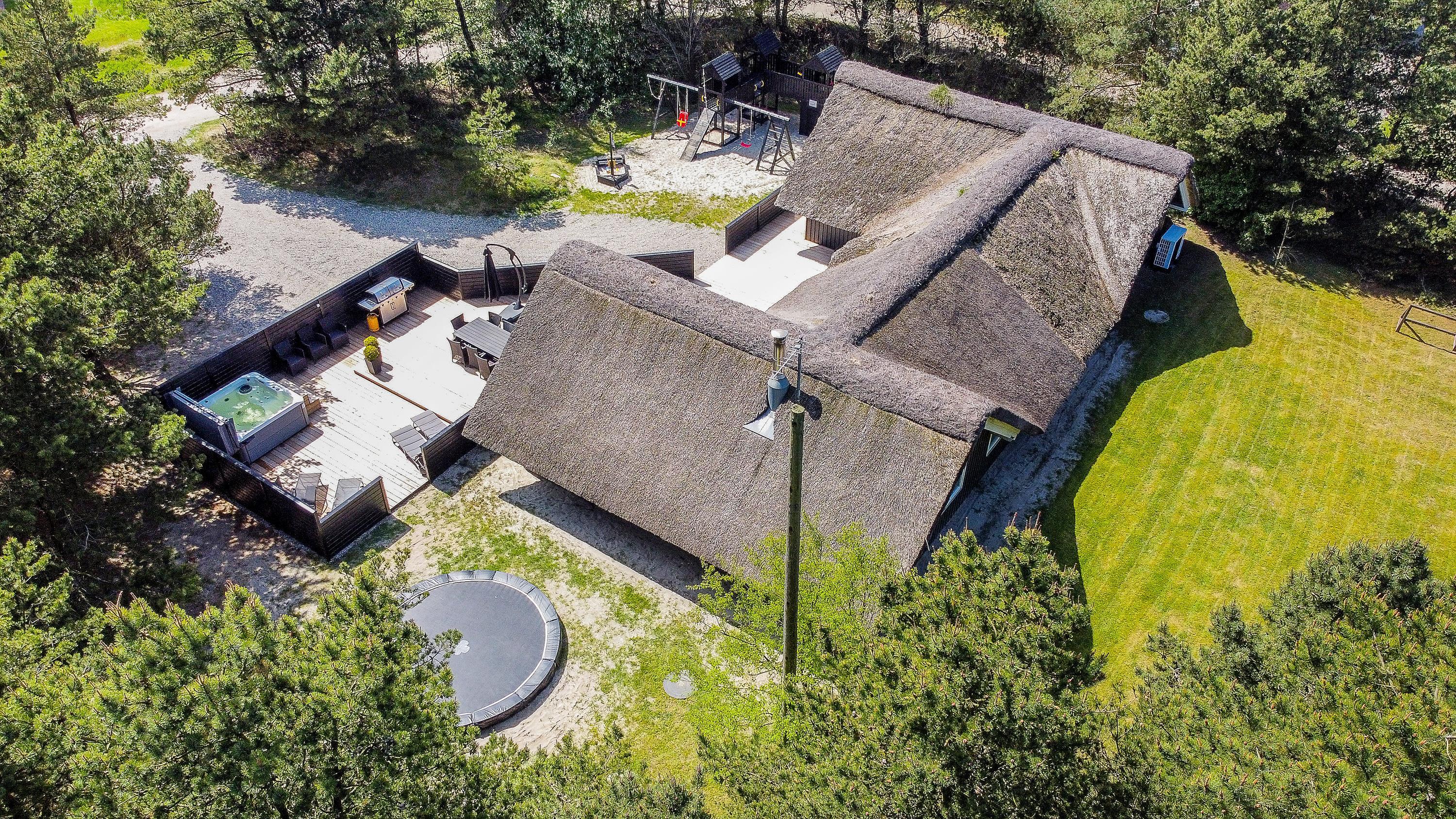 På den afskærmede terrasse står også et lækkert udespa, hvor I kan sætte jer til rette og slappe af i det varme vand – alt imens kan børnene give den gas i haven, hvor der er både gynge og sandkasse. Og med så meget plads i haven, hvorfor så ikke også få gang i en fodboldkamp?