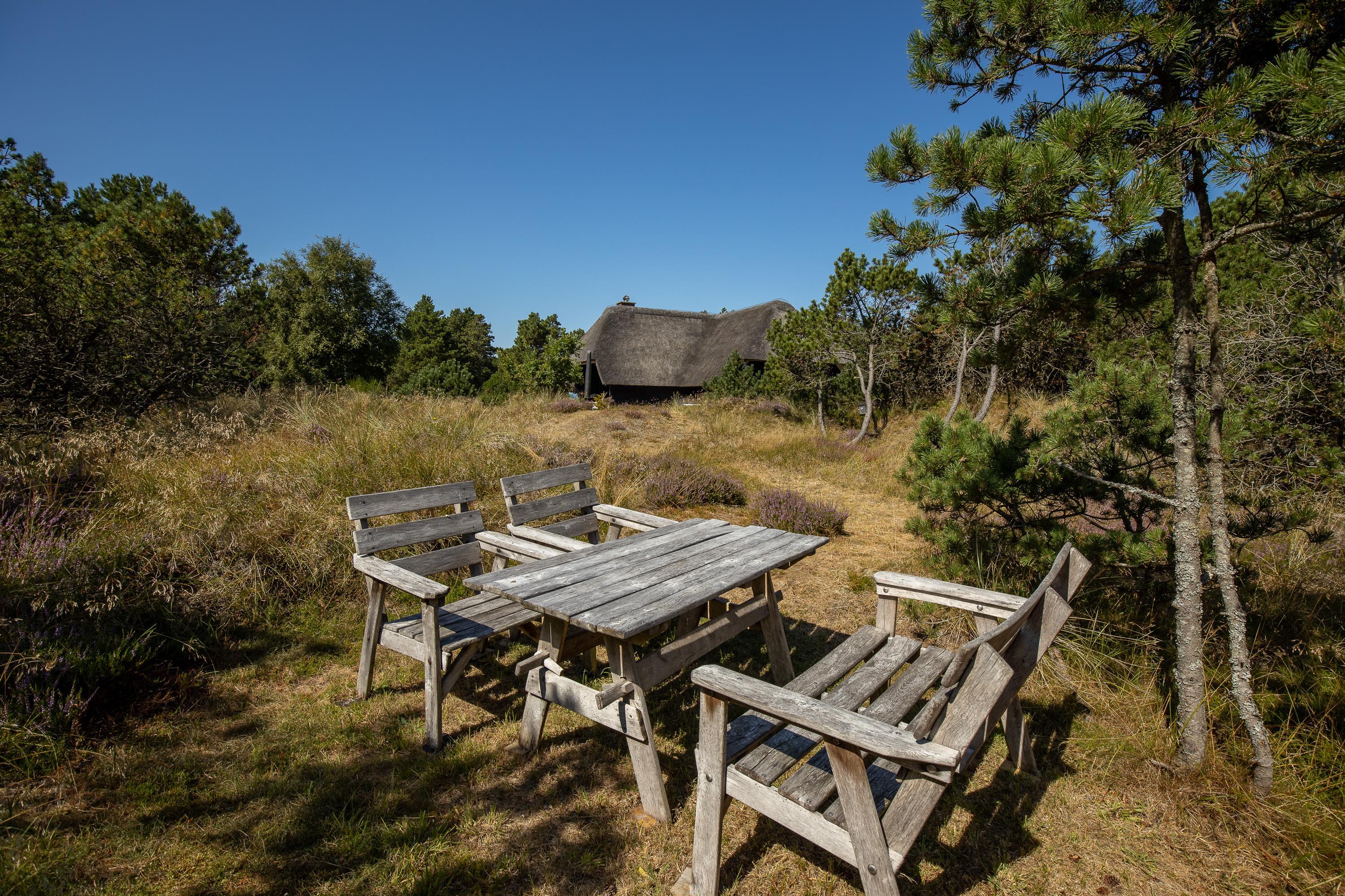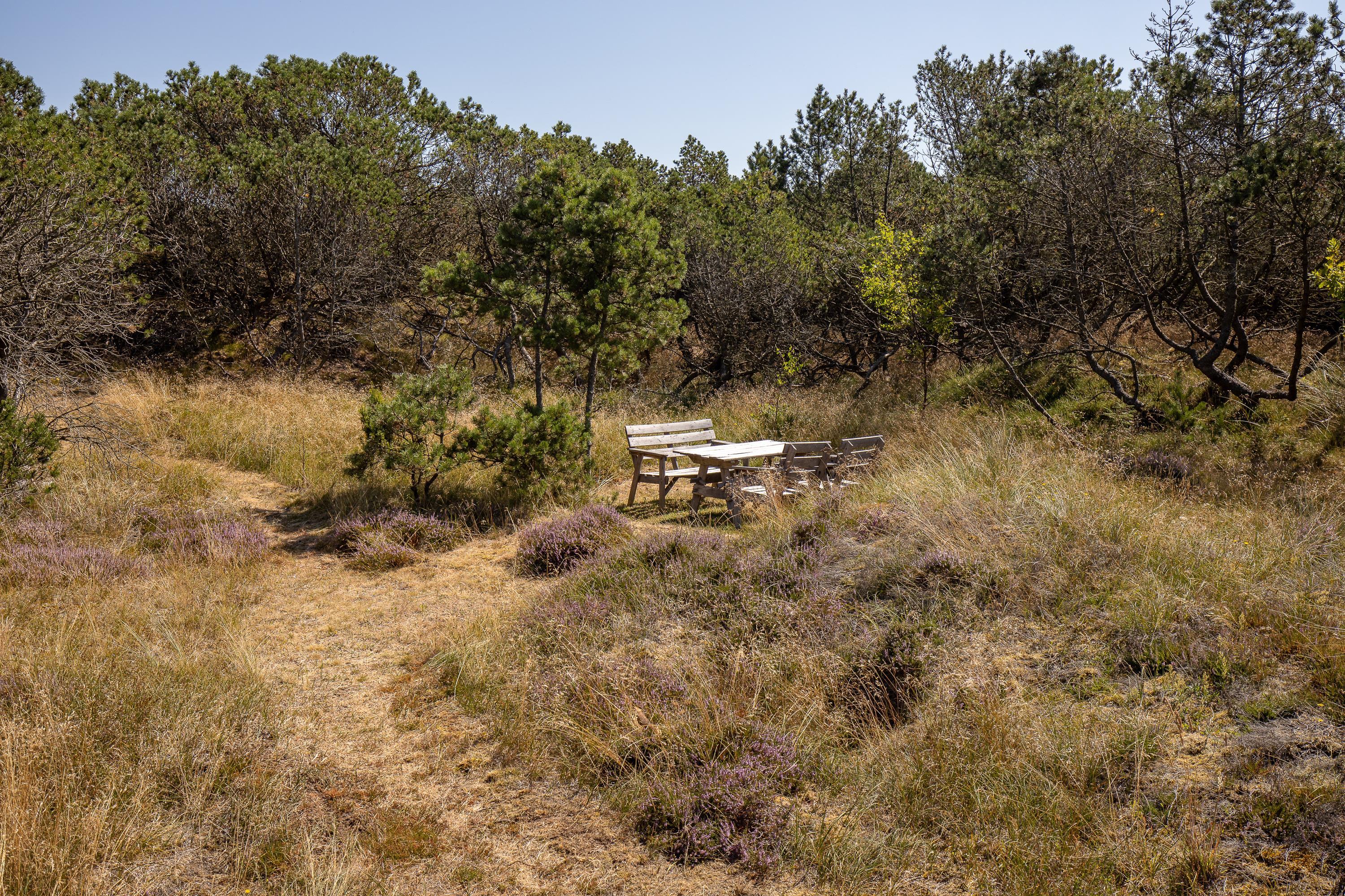 Skøn overdækket terrasse med udsigt til lynghede og fyrretræer