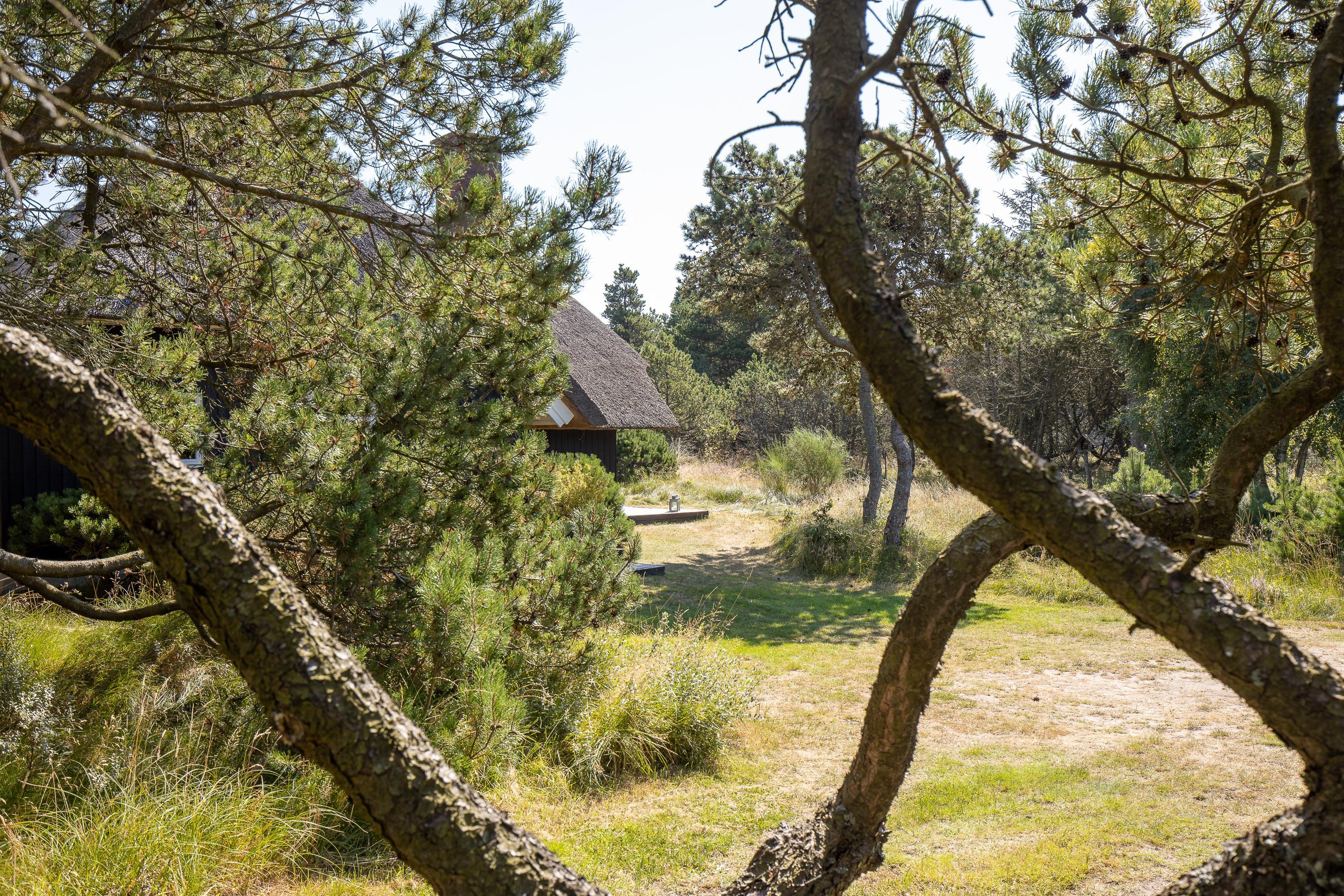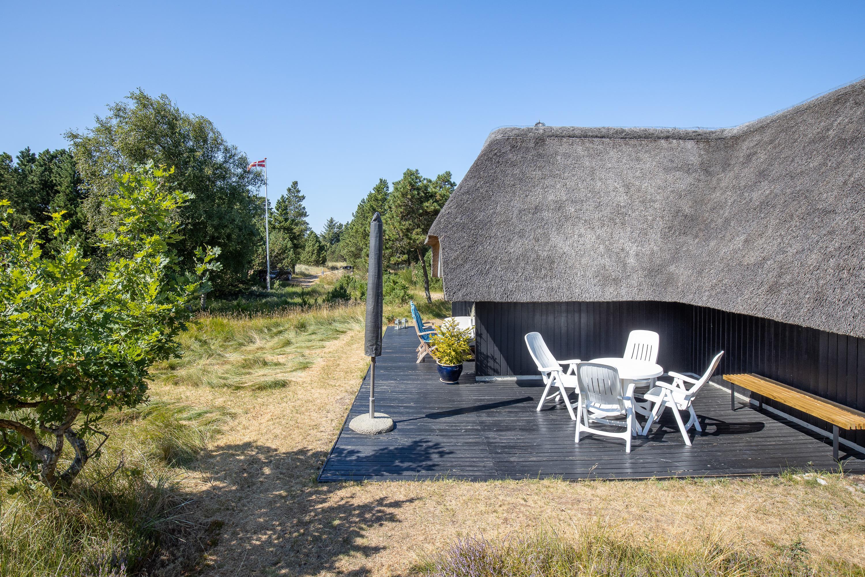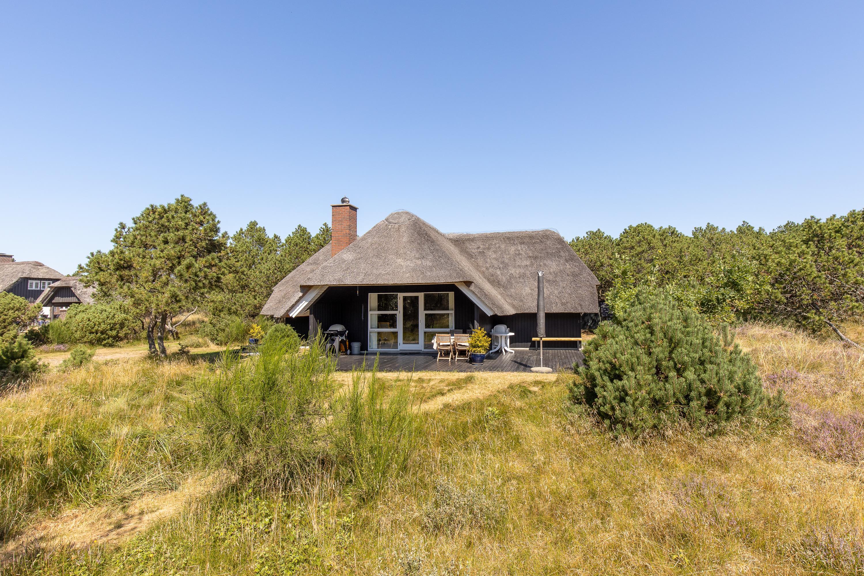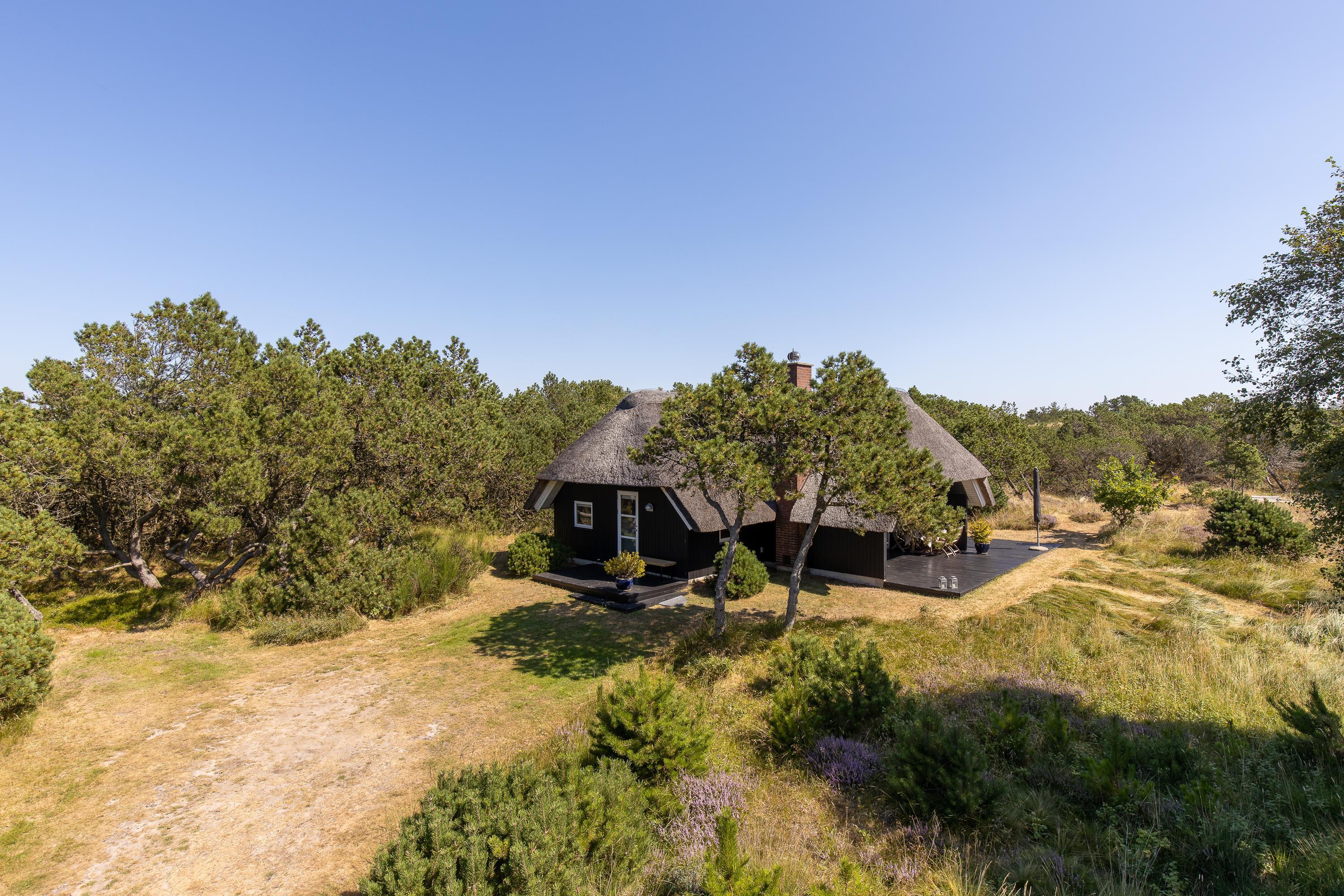 Gemt af vejen fra omverdenen er sommerhuset på Kallemærskvej 16 jeres helt private ferieparadies. Huset dukker sig og ligger dejligt i læ af lyngbeklædte klitter og knudrede fyrretræer. En del af den store træterrasse foran huset er overdækket, så du både kan finde læ for regn eller en varm middagssol. Tag en kande saft og en god bog med ned i ”haven”, og nyd naturen, duften af lyng og chancen for at møde Kallemærkshedes kongedyr – de smukke, stolte krondyr.