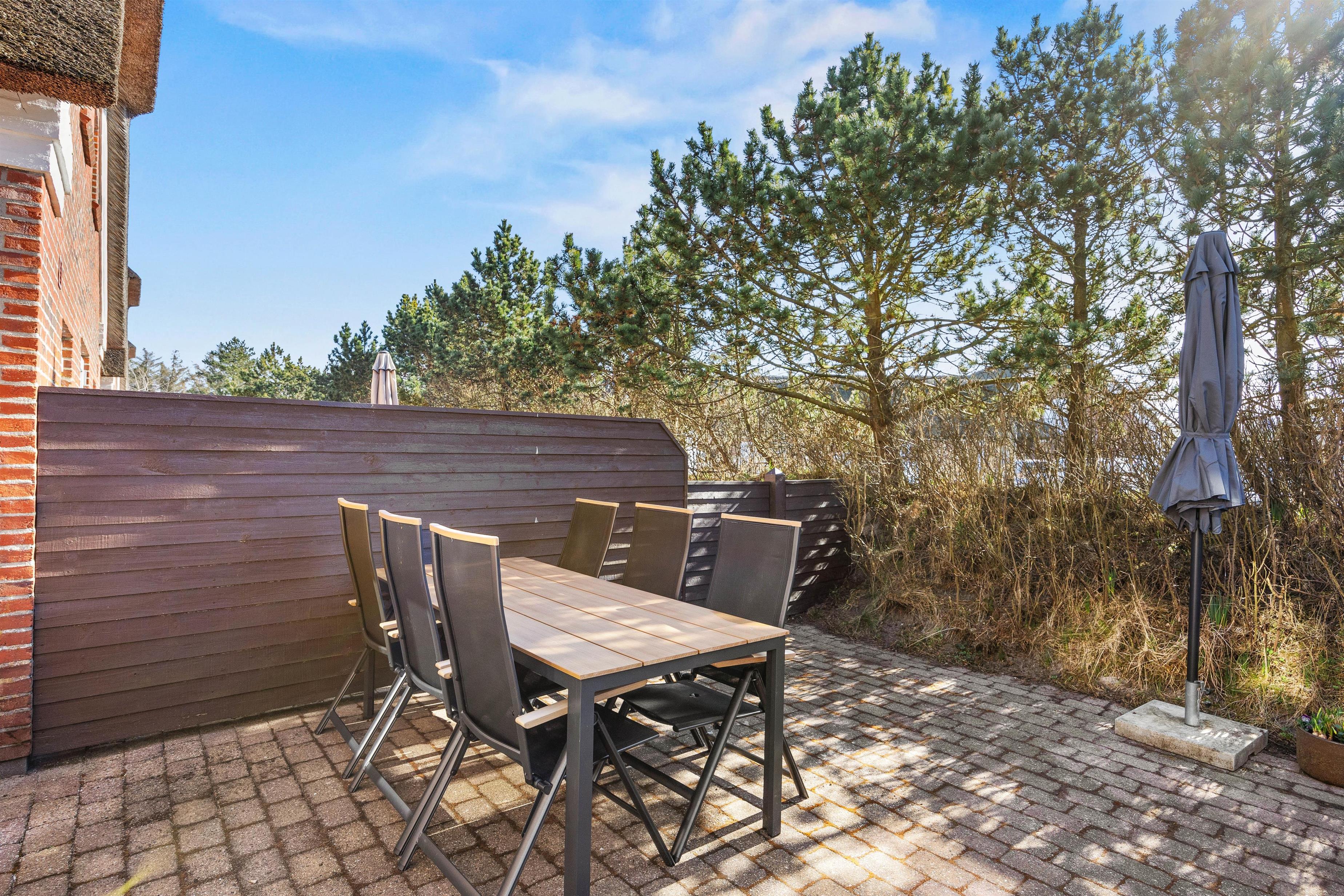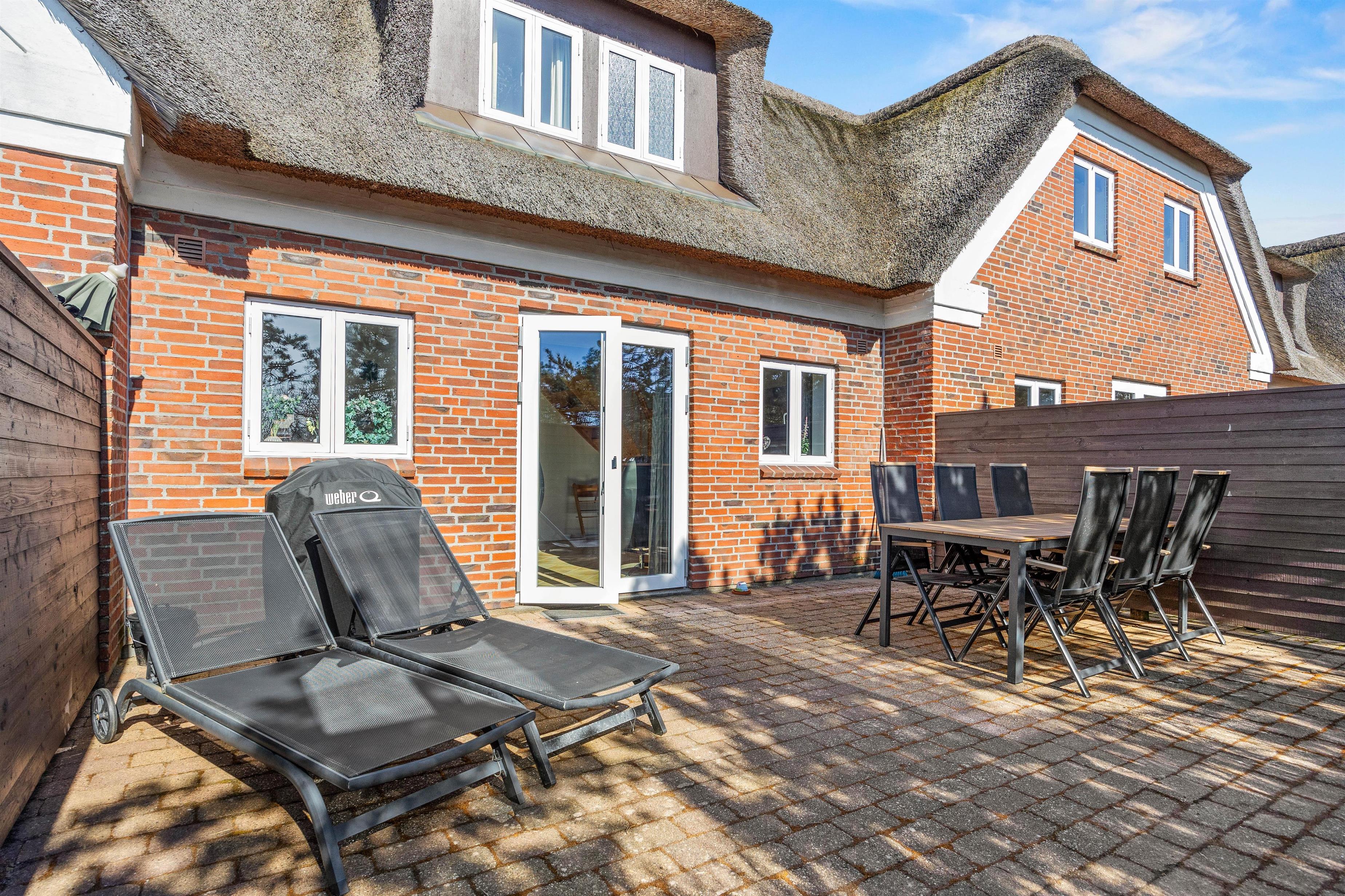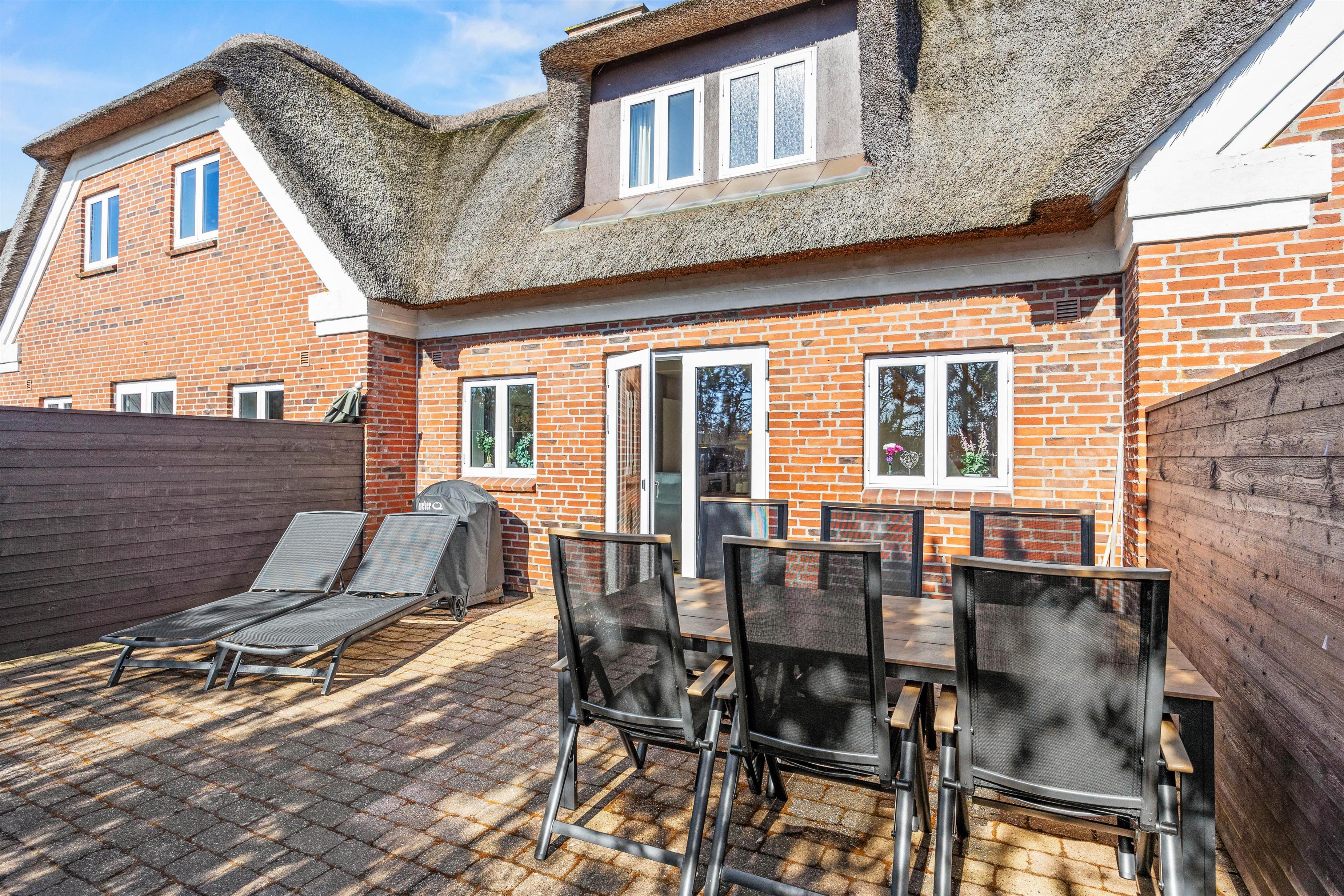 Udenfor får du en afskærmet og lukket terrasse, hvor du kan sidde i læ og skabe dine egne ferieritualer – kaffe i morgensolen, frokost i det fri eller en lang aften i havemøblerne, mens dagen runder af. Du har 1150 meter til stranden, så en tur til vandet altid ligger inden for rækkevidde, og kun 160 meter til indkøb, så du kan hente det, du mangler, uden at bruge tid på det. Netop kombinationen af stråtækt charme, gennemført komfort og smarte praktiske detaljer gør dette feriehus i Blåvand til et sted, hvor du kan glæde dig til den pause, du har fortjent.