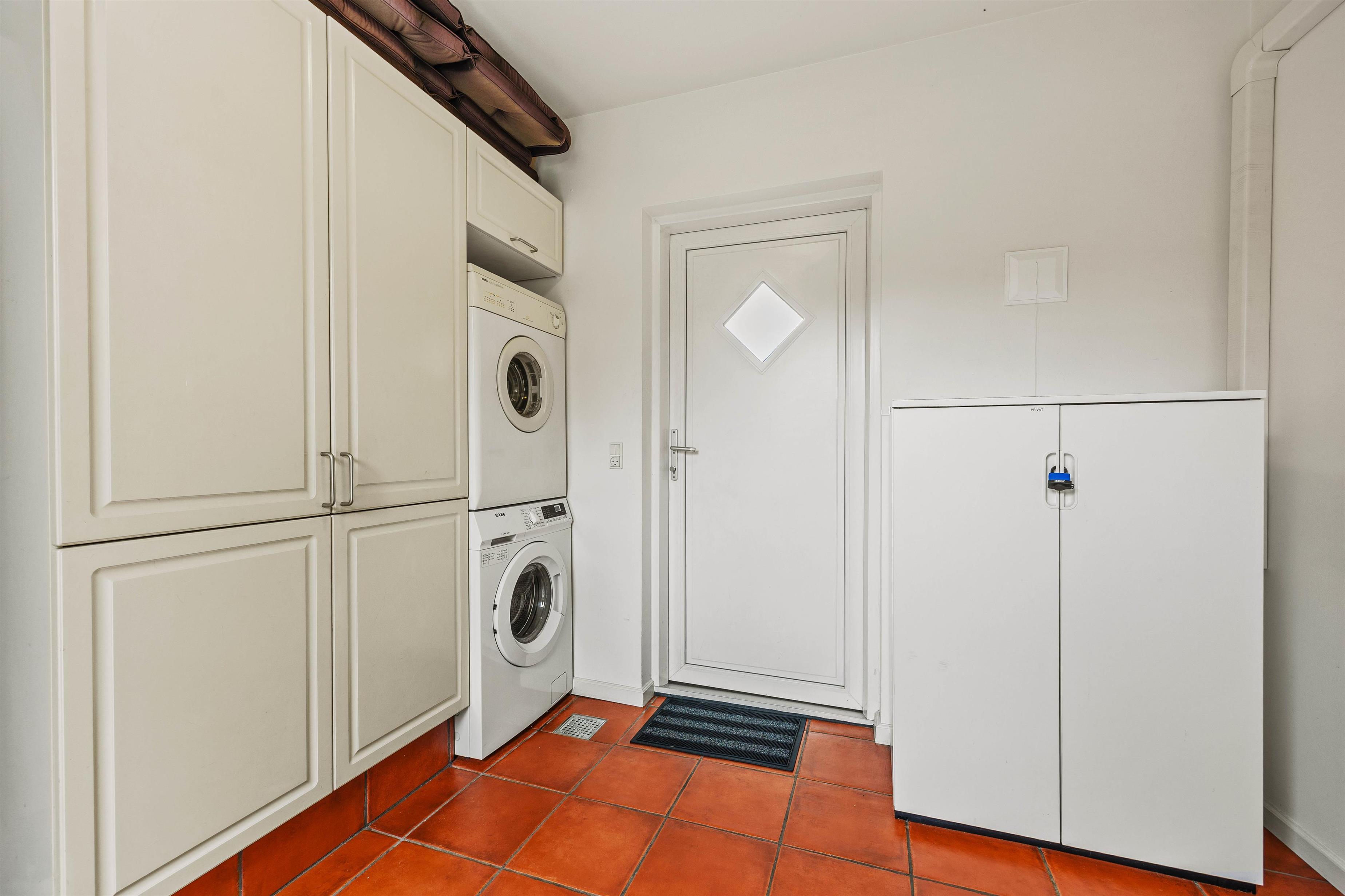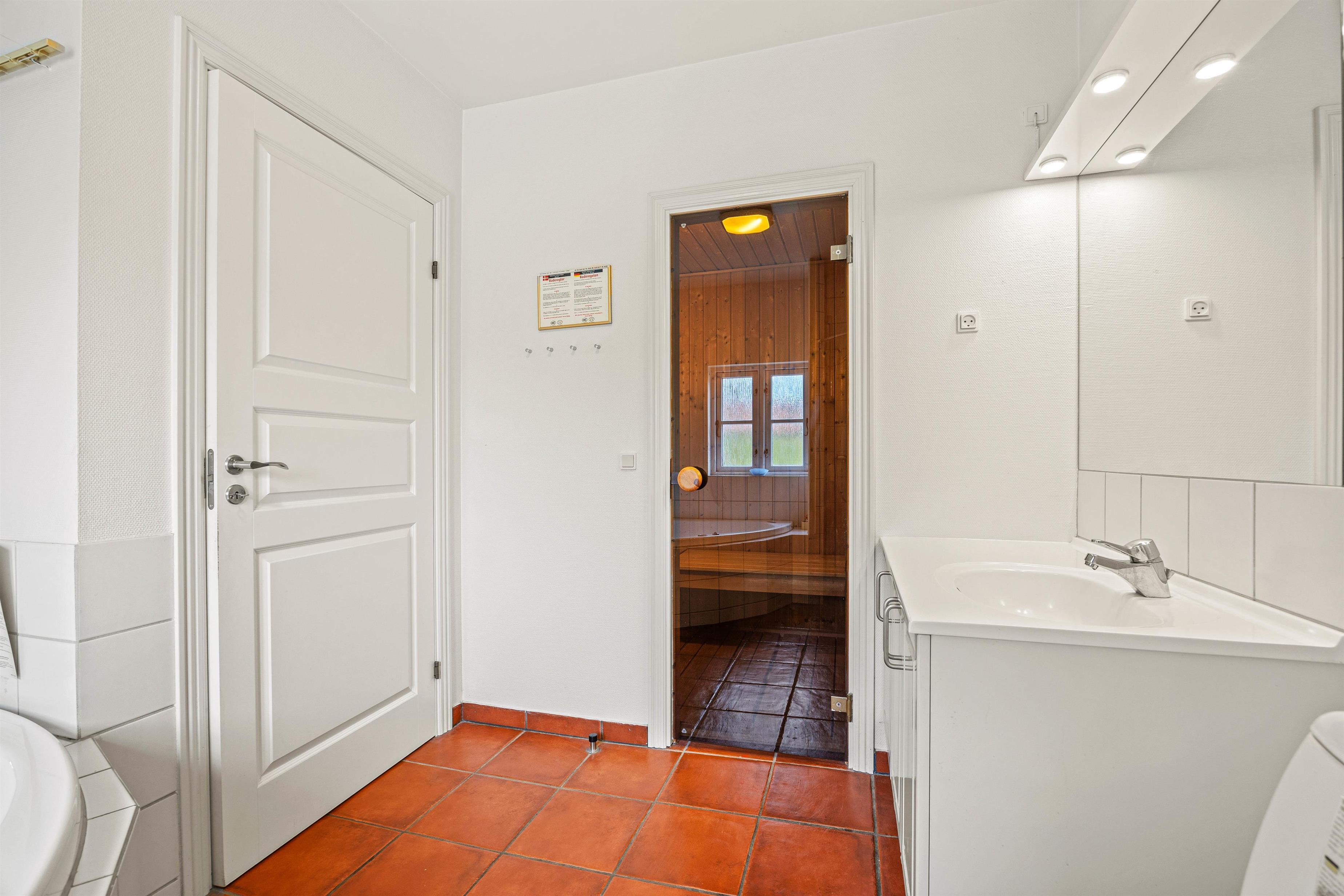 Badeværelset med gulvvarme sørger for, at I ikke fryser om fødderne, og sommerhuset rummer også en vaskemaskine og tørretumbler, så I kan få vasket feriegarderoben undervejs.