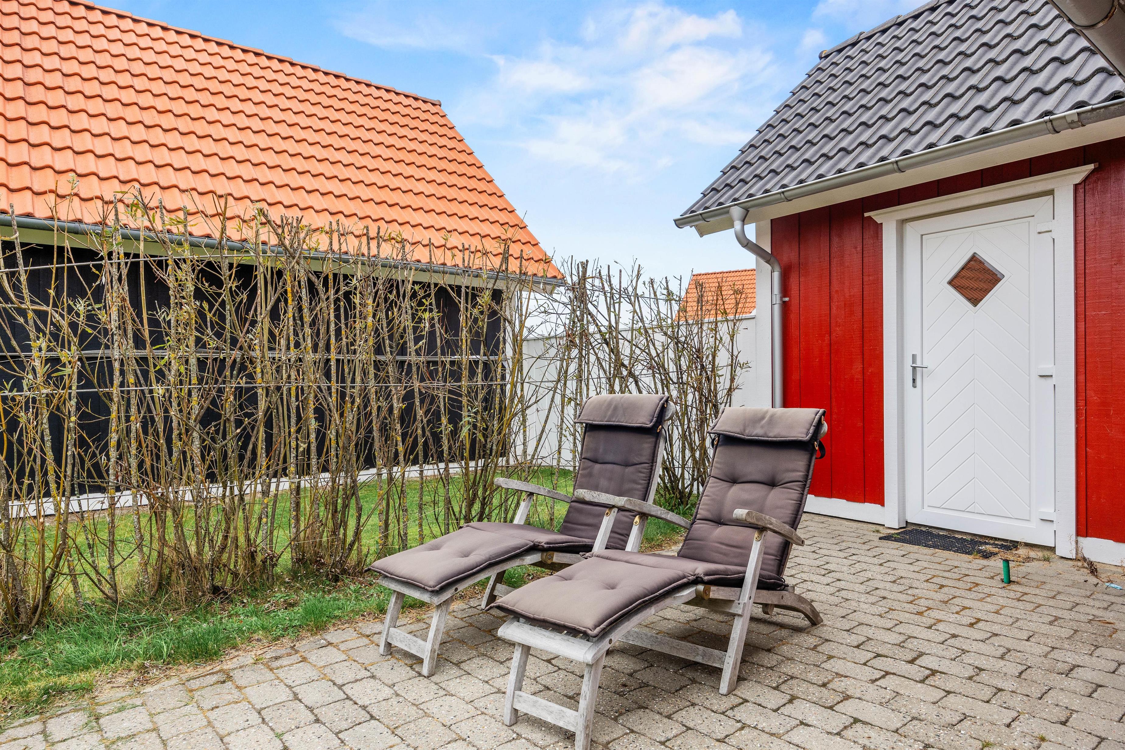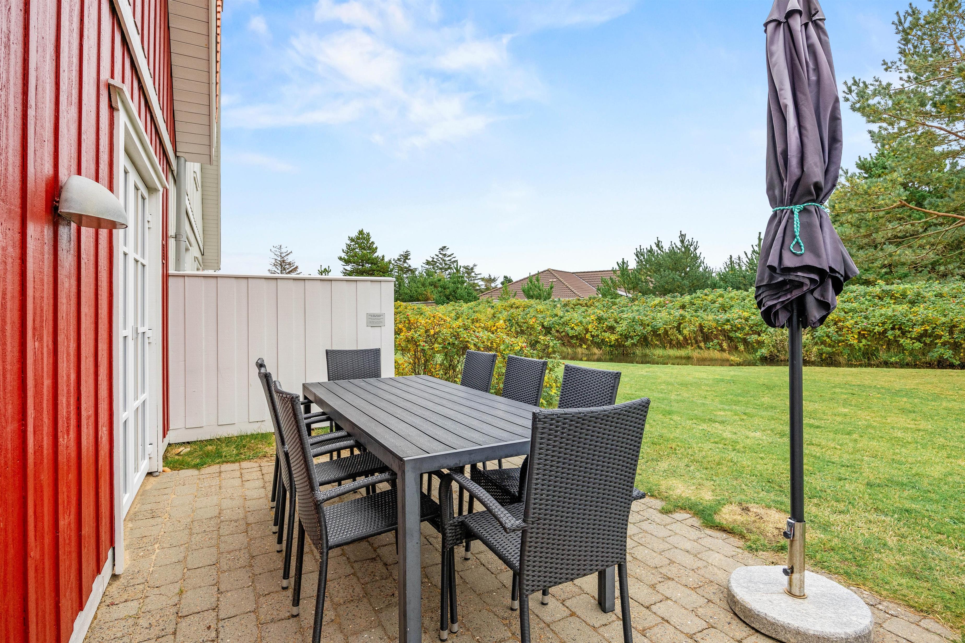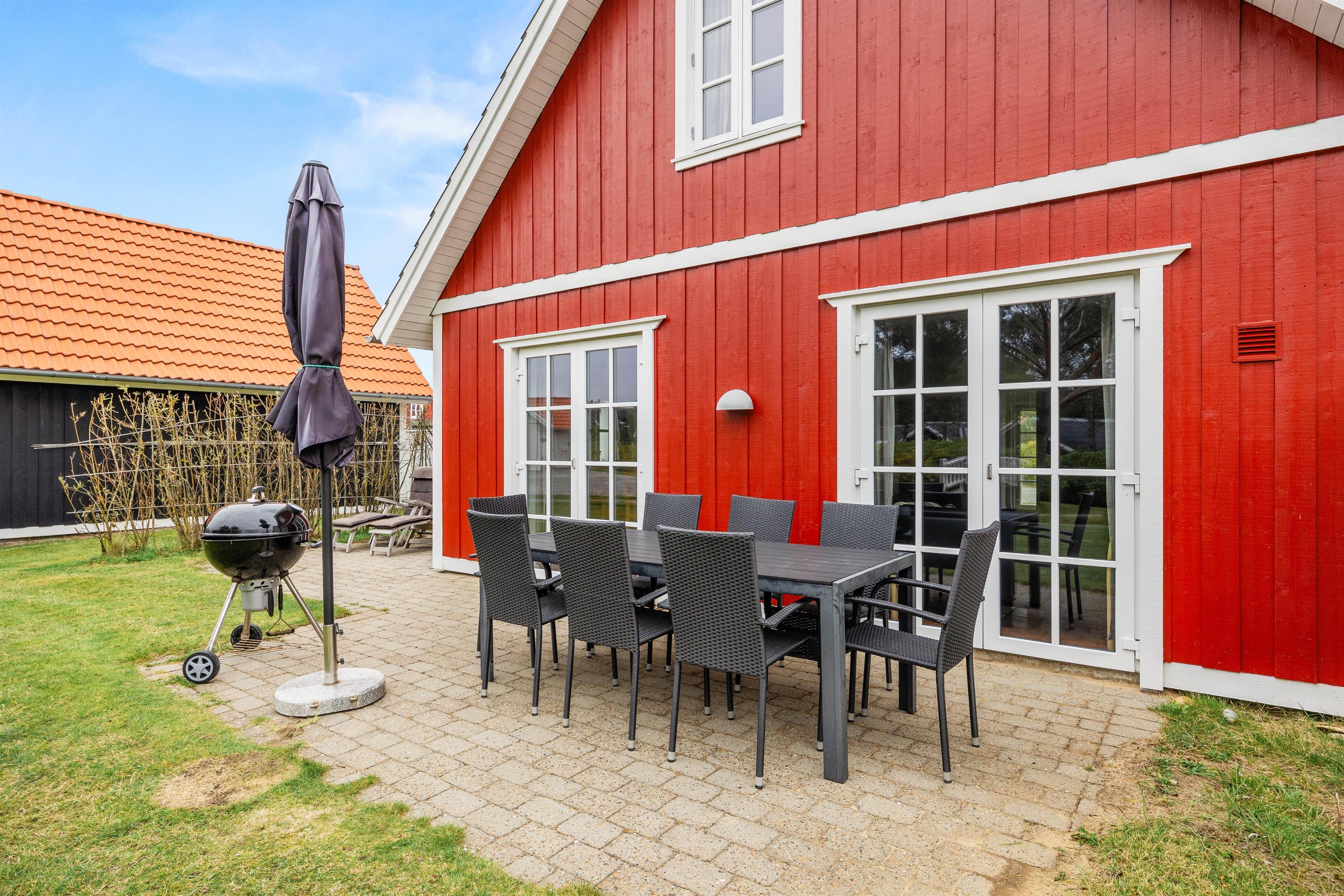 Når I bare har lyst til at slappe af ved huset, byder den åbne terrasse udenfor på havemøbler og en grill, hvor I kan nyde hyggestunder med familie og venner over god mad. Hold dog et vågent øje med eventuelle børn i forbindelse med vandløbet i området.
