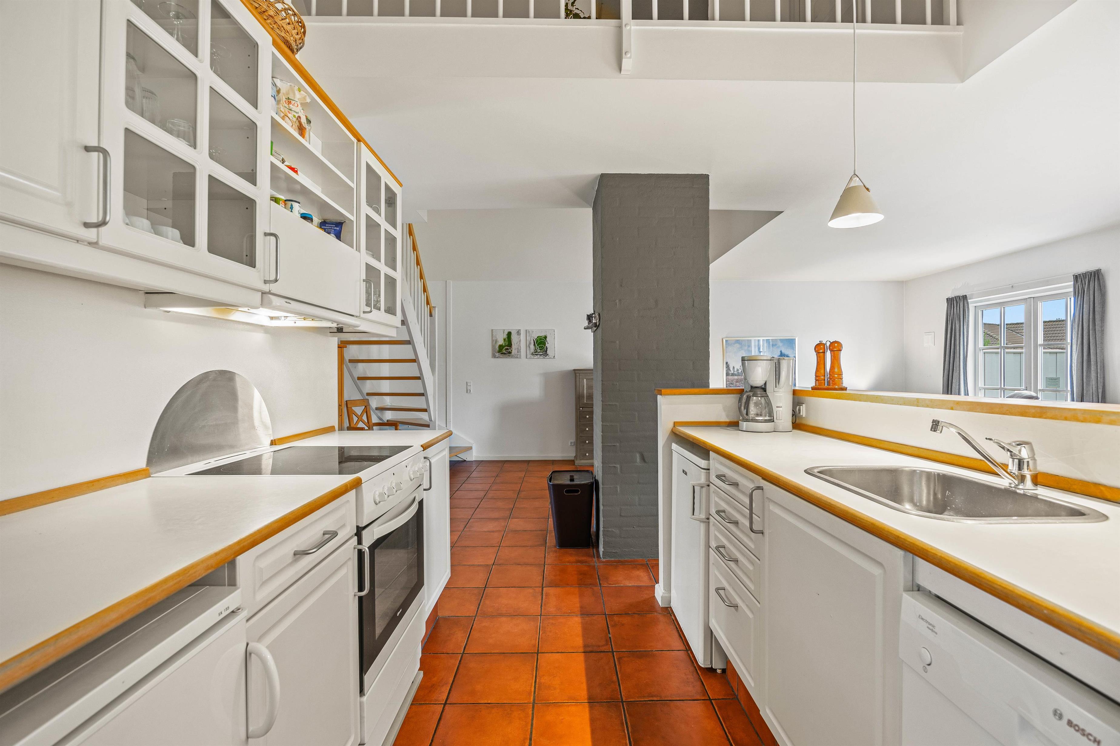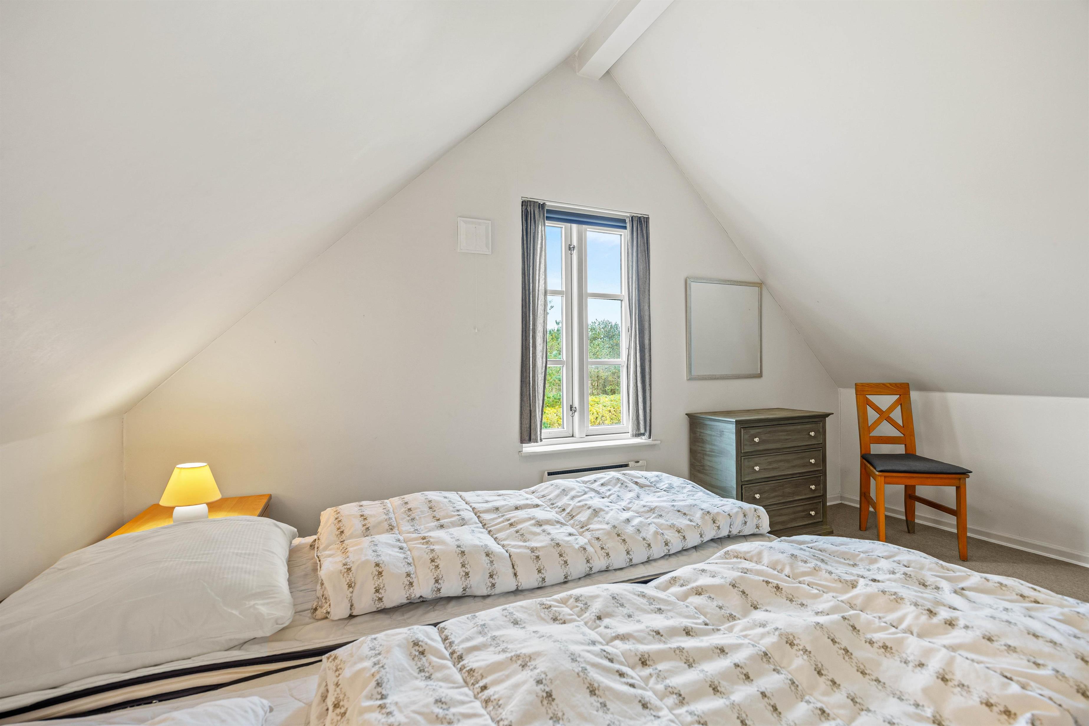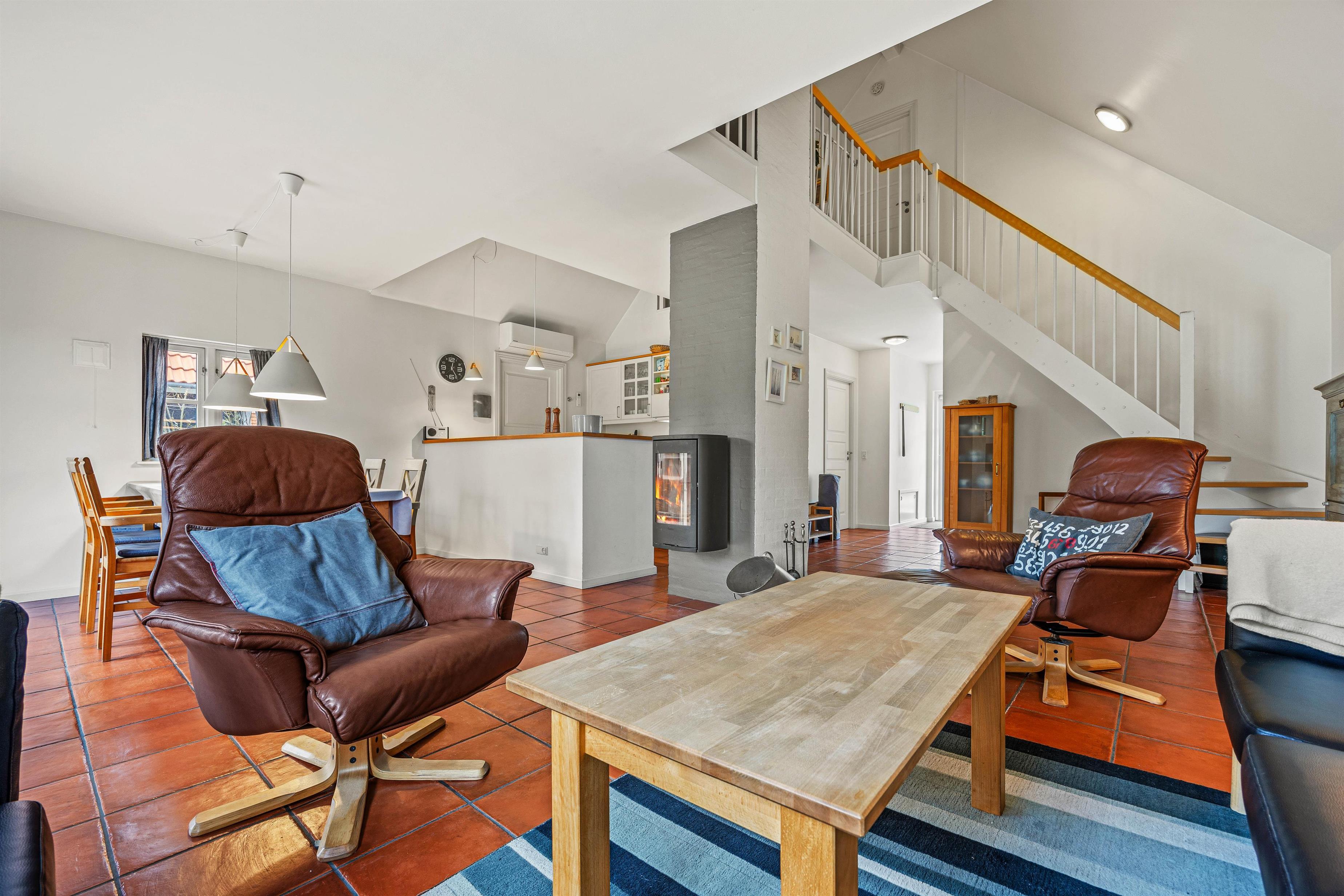 Køkkenet ligger i åben forbindelse med stuen, hvor en effektiv brændeovn sørger for varme og god stemning på kolde dage, og de 3 hyggeligt indrettede soveværelser, hvoraf ét ligger i stueplan, er udstyret med komfortable dobbeltsenge, der sikrer jer en god nats søvn. Stueetagen er forbundet med førstesalen med en brugervenlig trappe med gode trin og et solidt gelænder.