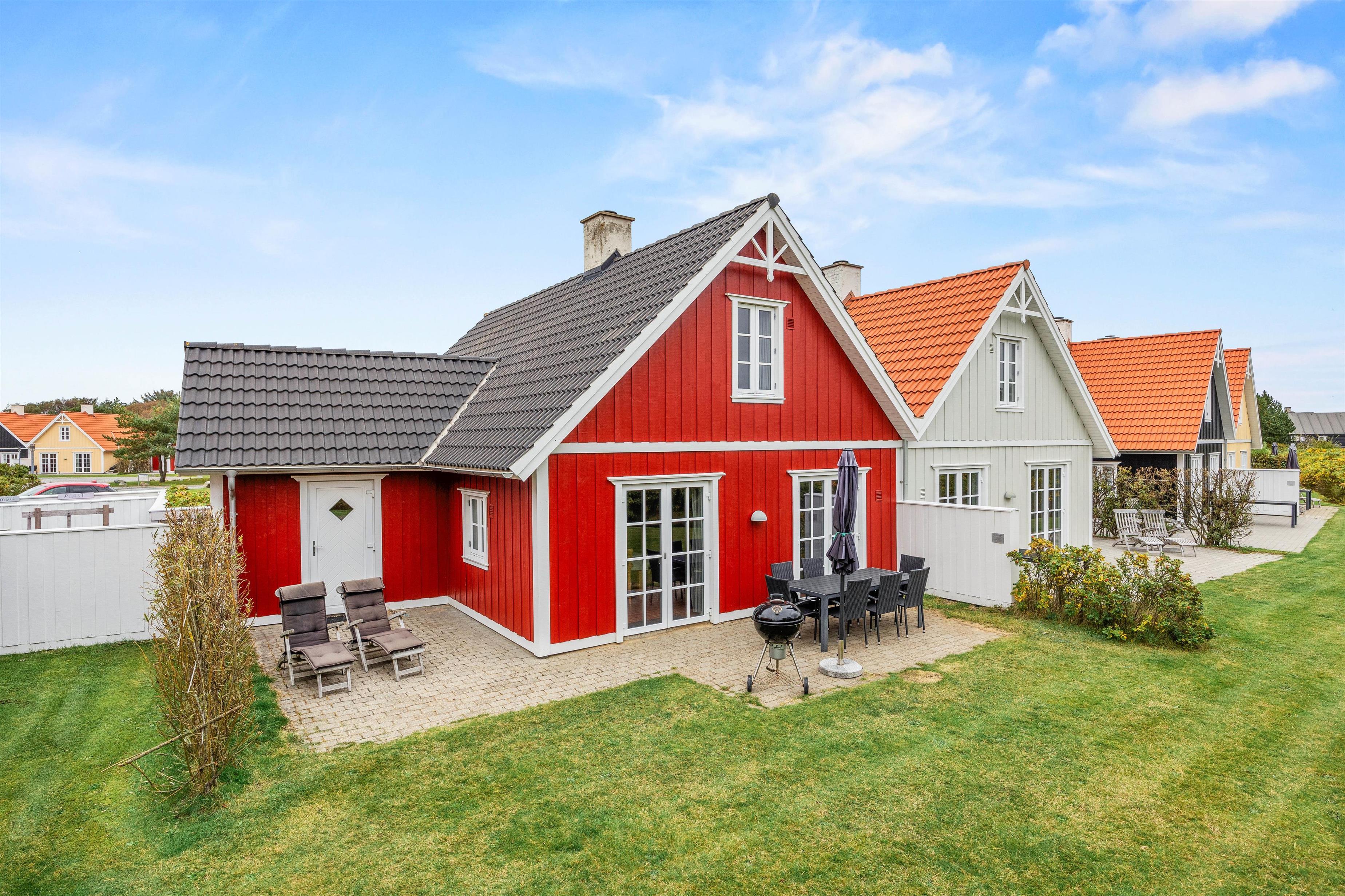 Det flotte rød- og hvidmalede træhus i to plan ligger kun ca. 800 meter fra stranden og ca. 100 meter fra indkøbsmuligheder, tæt ved et vandløb med små broer over – området kaldes derfor også ”Lille Venedig”. Sommerhuset i Blåvand rummer alt, hvad 6 personer behøver til en hyggelig ferie, og også menneskets bedste ven kan her komme med på tur, for i huset må I medbringe 1 hund.