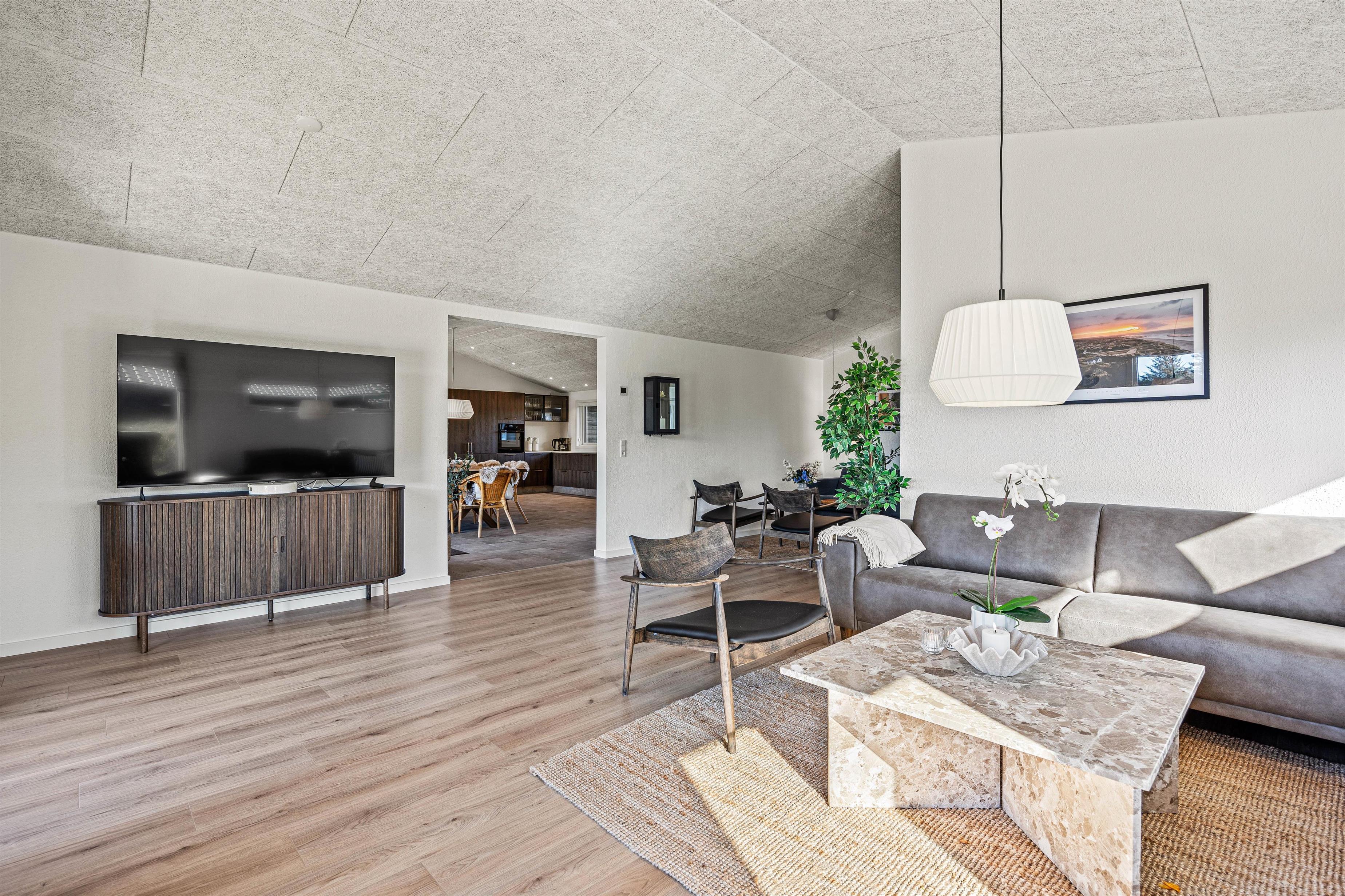Køkkenet, med en 90-liters fryser og en praktisk opvaskemaskine, er perfekt til at tilberede delikate måltider med familien. Den komfortable opholdsstue med gulvvarme byder på hyggelige stunder, mens avanceret teknologi, som en effektiv luft-vand-varmepumpe, sikrer en miljøvenlig oplevelse og et godt indeklima uanset årstiden.