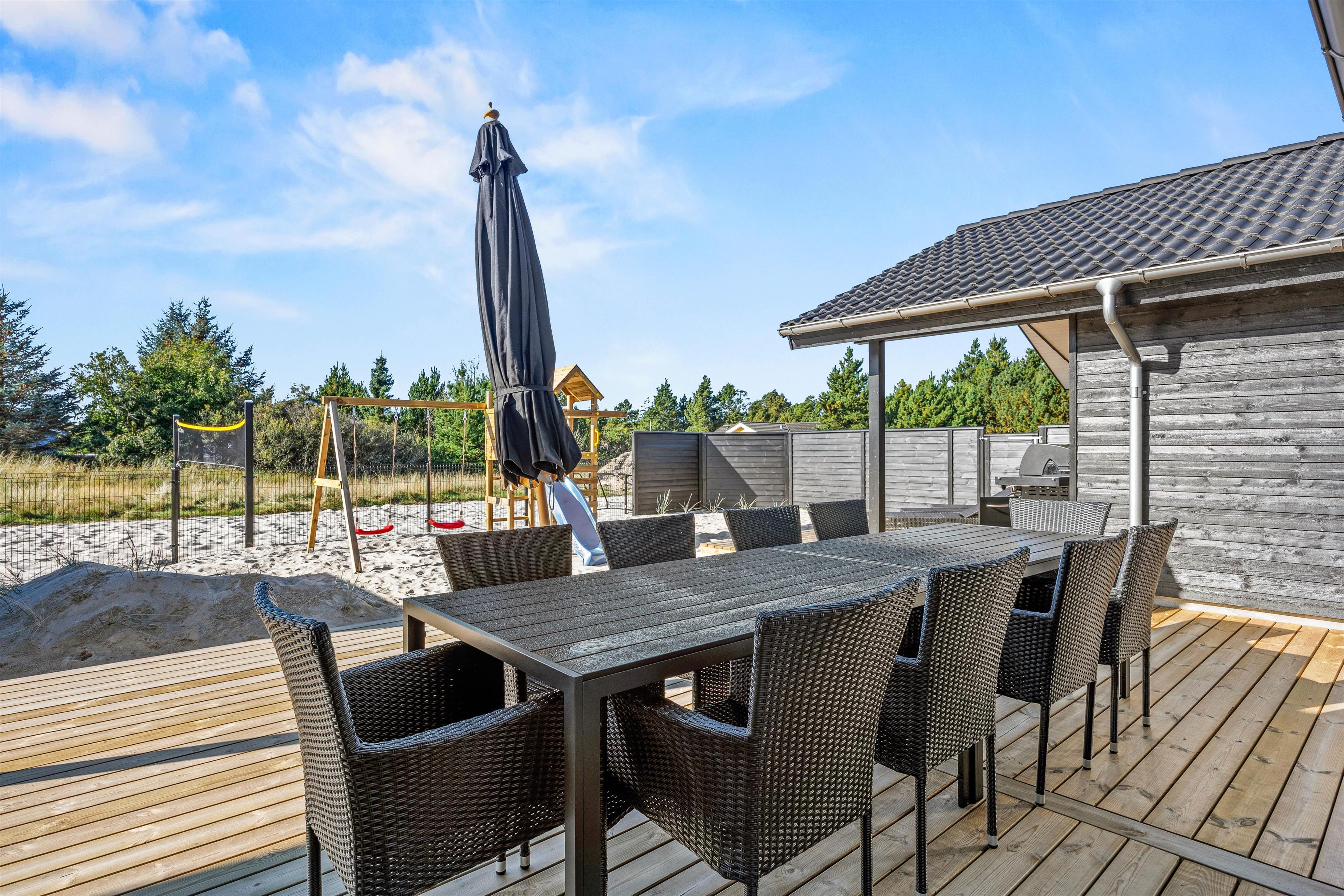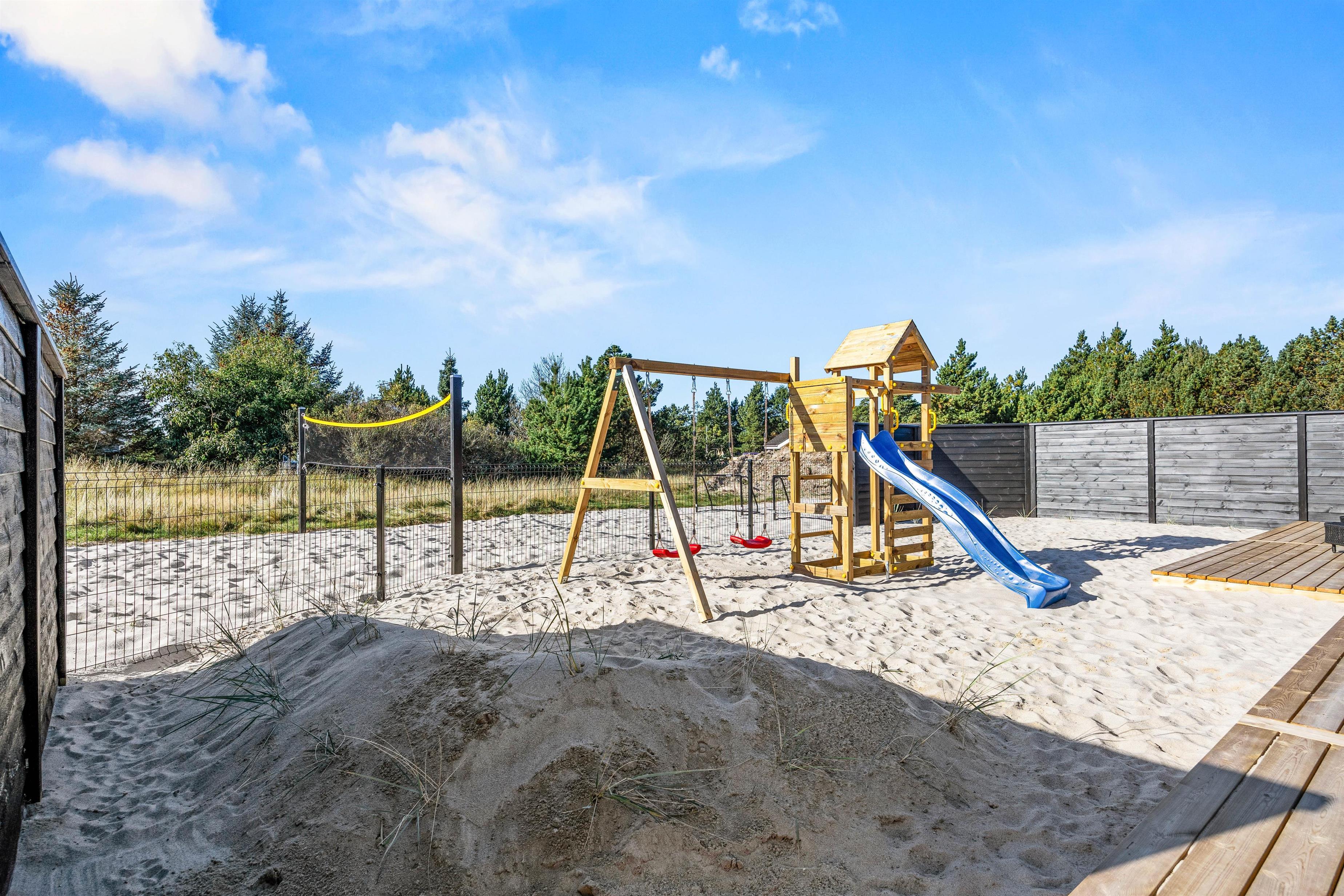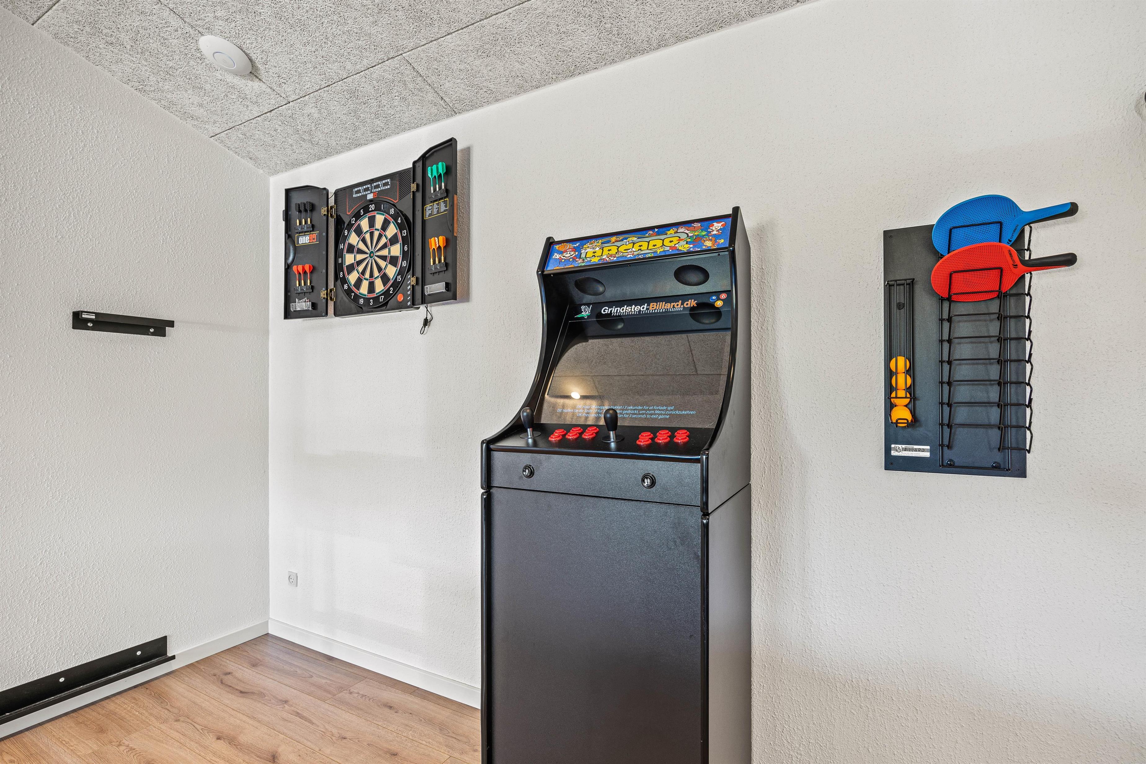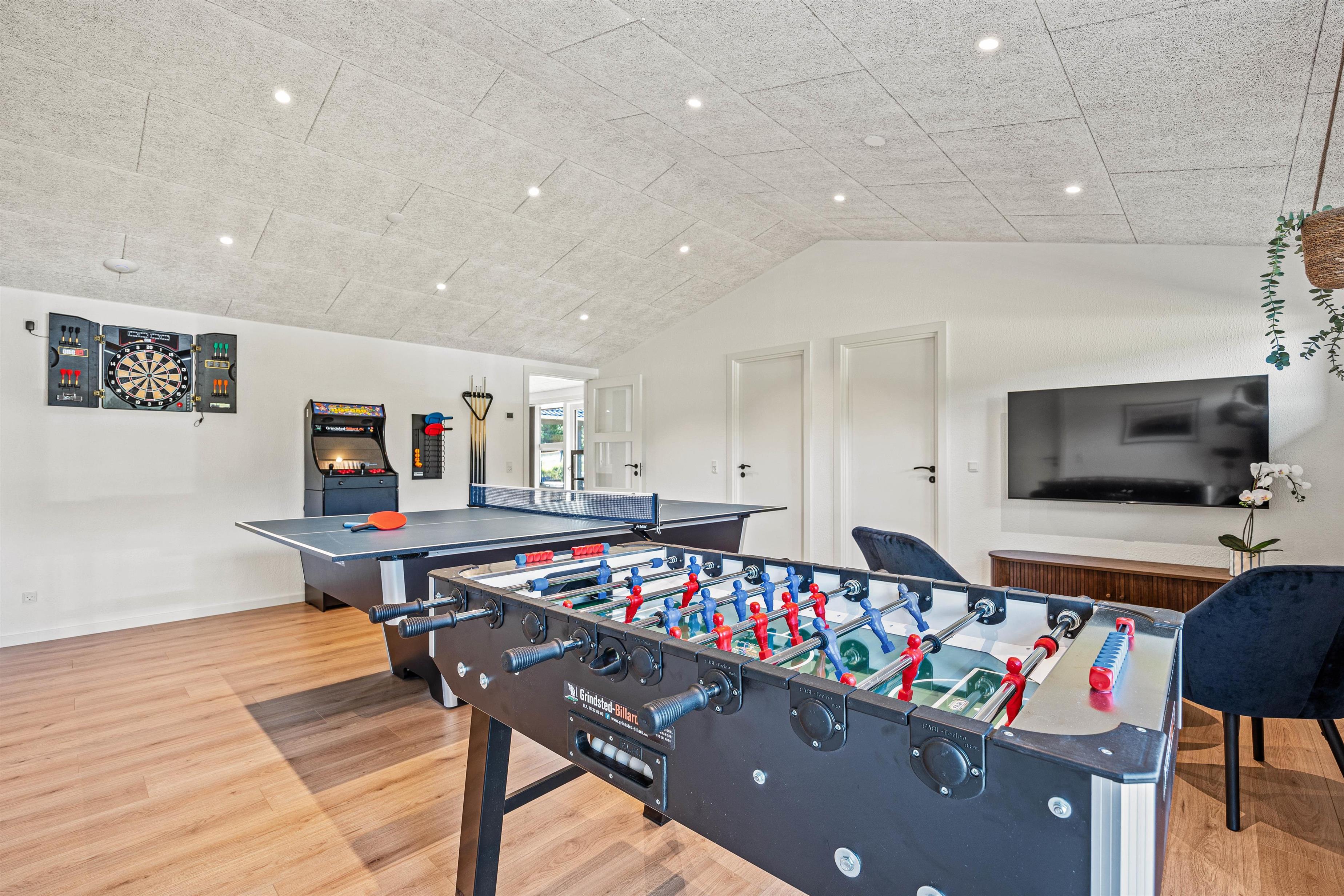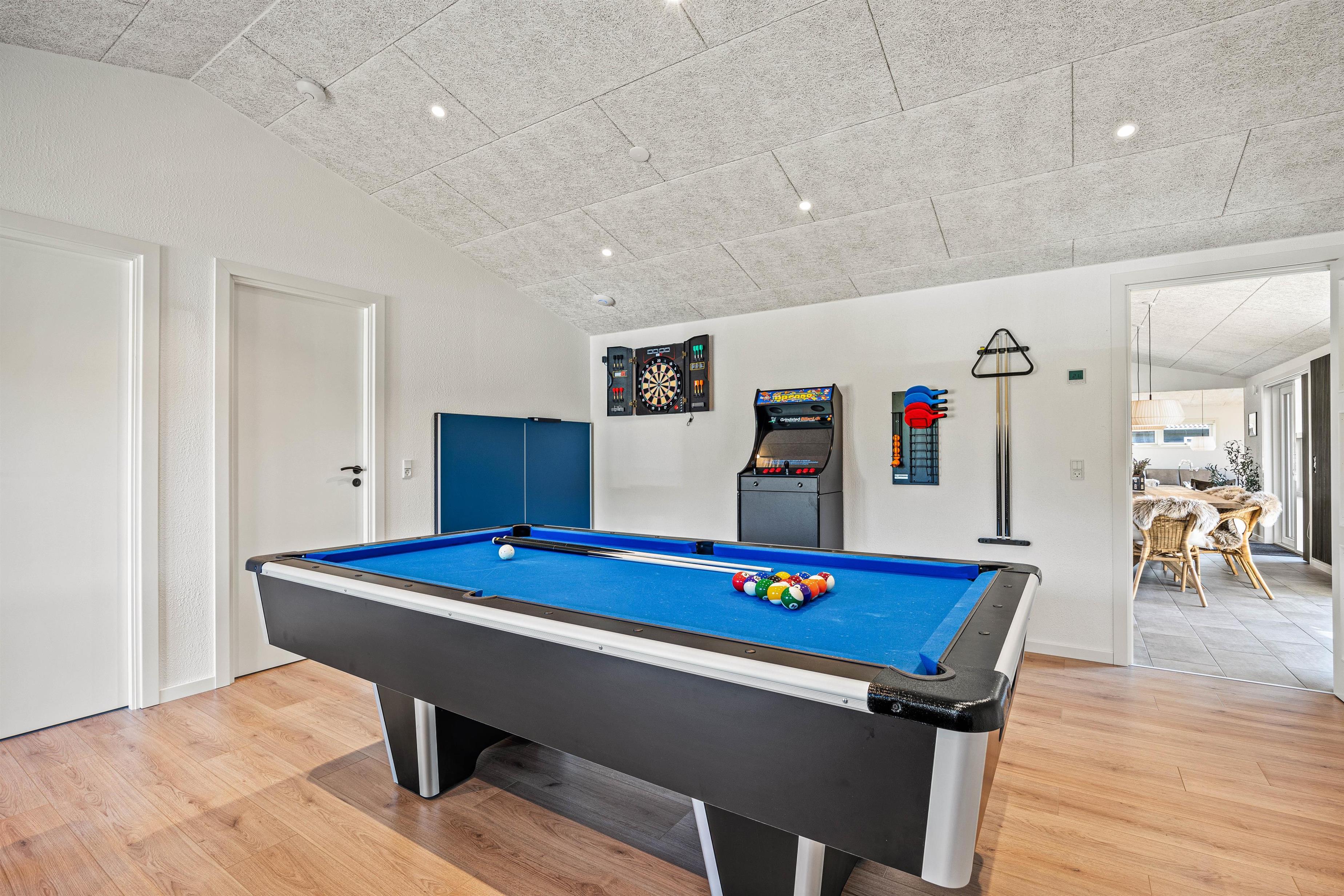 Feriebeboelsen i Blåvand giver plads til en bred vifte af aktiviteter, der tiltaler både store og små. Prøv dine evner af med en omgang poolbillard eller bordtennis og skab spændende og sjove stunder med dine nærmeste. Den store grund på 2093 kvadratmeter inkluderer også en gynge og en sandkasse, hvor børnene kan udfolde sig, mens du slapper af på den overdækkede terrasse og nyder den friske luft, måske over et glas vin eller en kop øl.