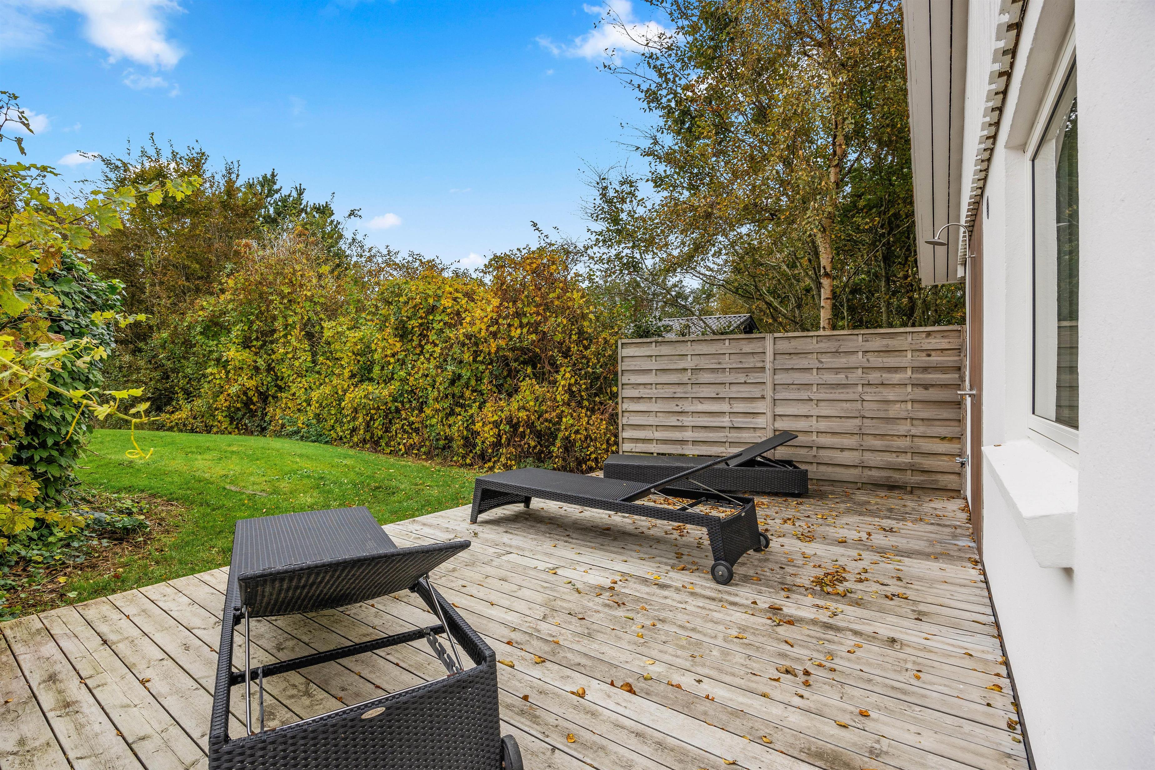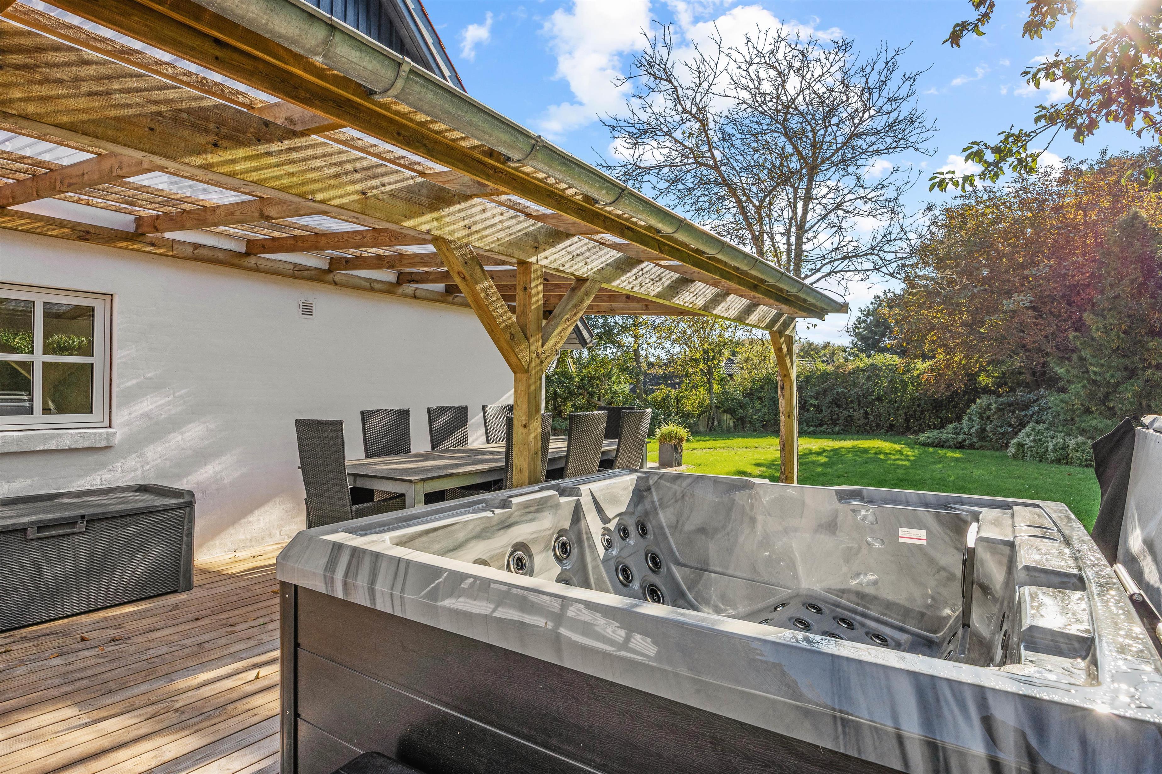 Under den overdækkede del af terrassen kan du sidde i havemøblerne og fordybe dig i den gode bog, du så længe har villet læse, også selvom der skulle komme en byge, og når du får lyst til lidt wellness, kan du hoppe i den udendørs jacuzzi eller få en forfriskende skylle under udendørsbruseren.