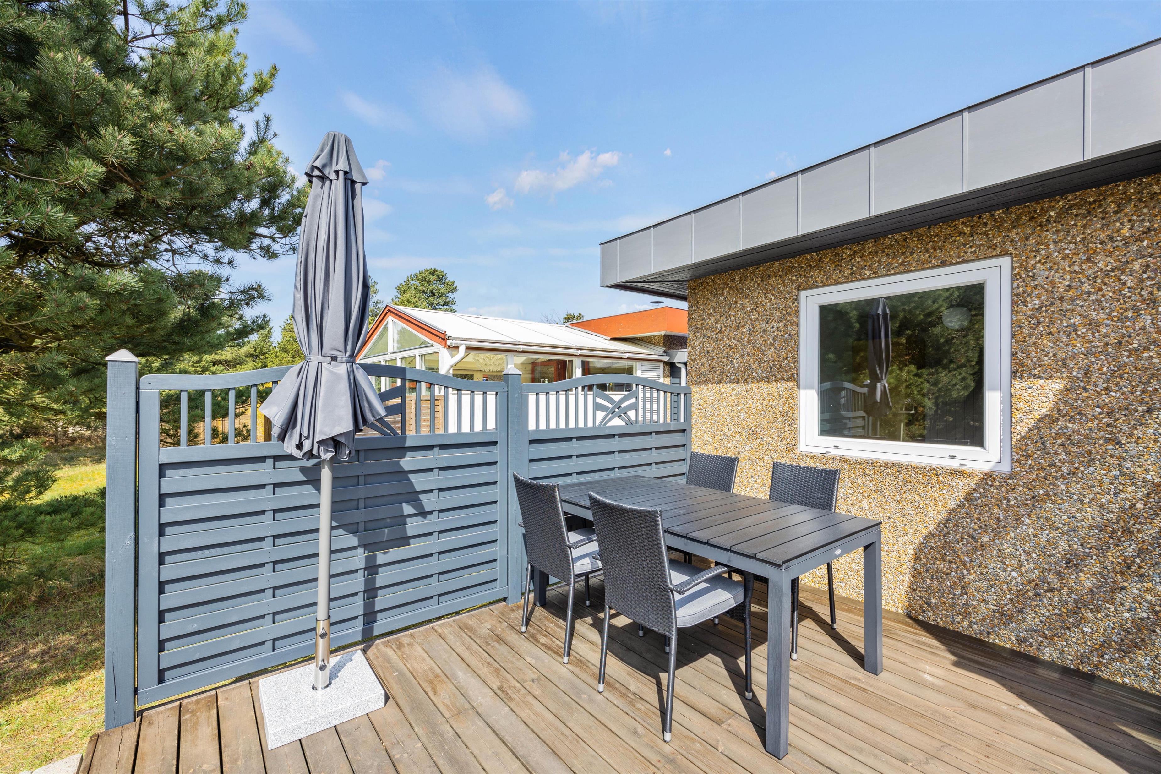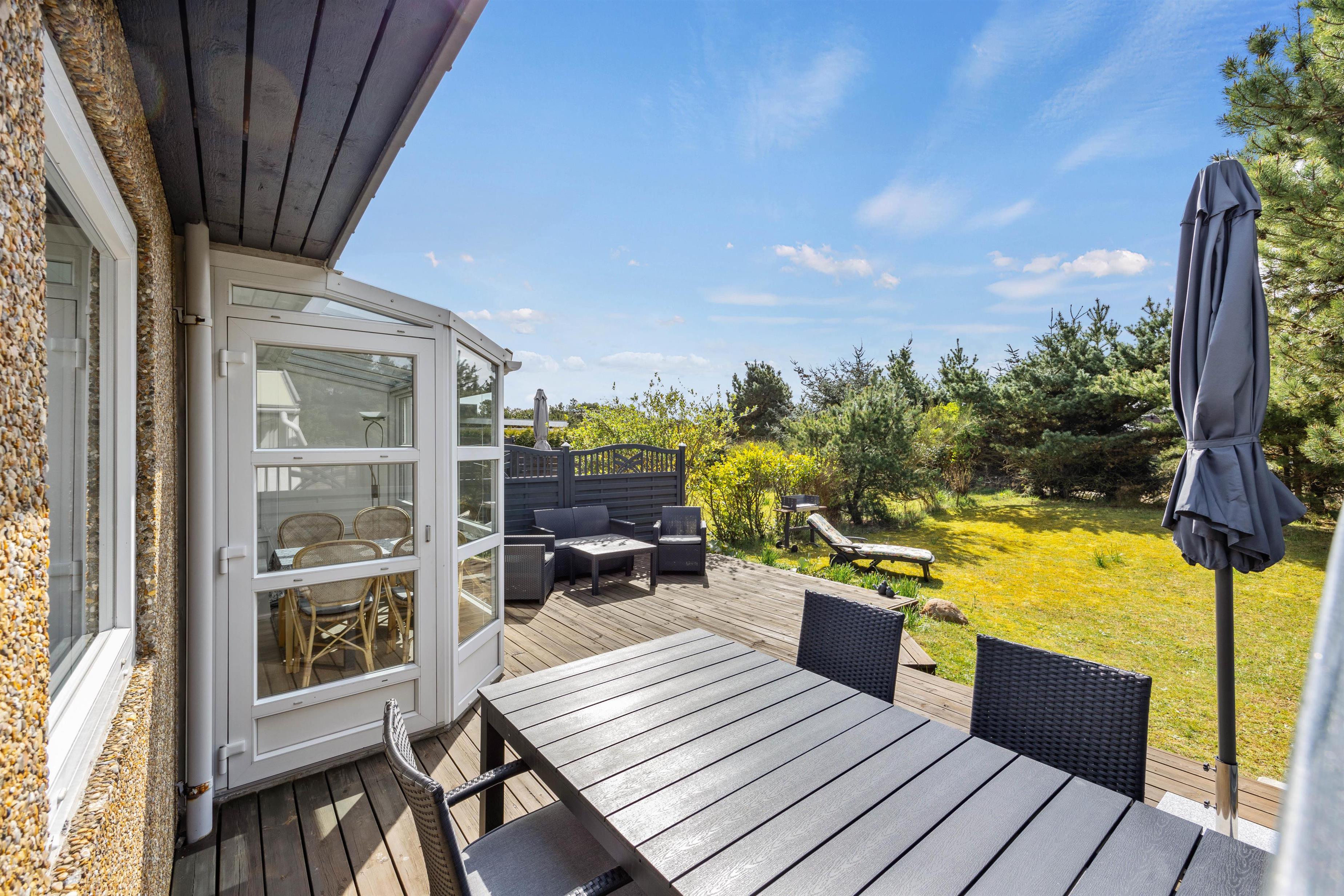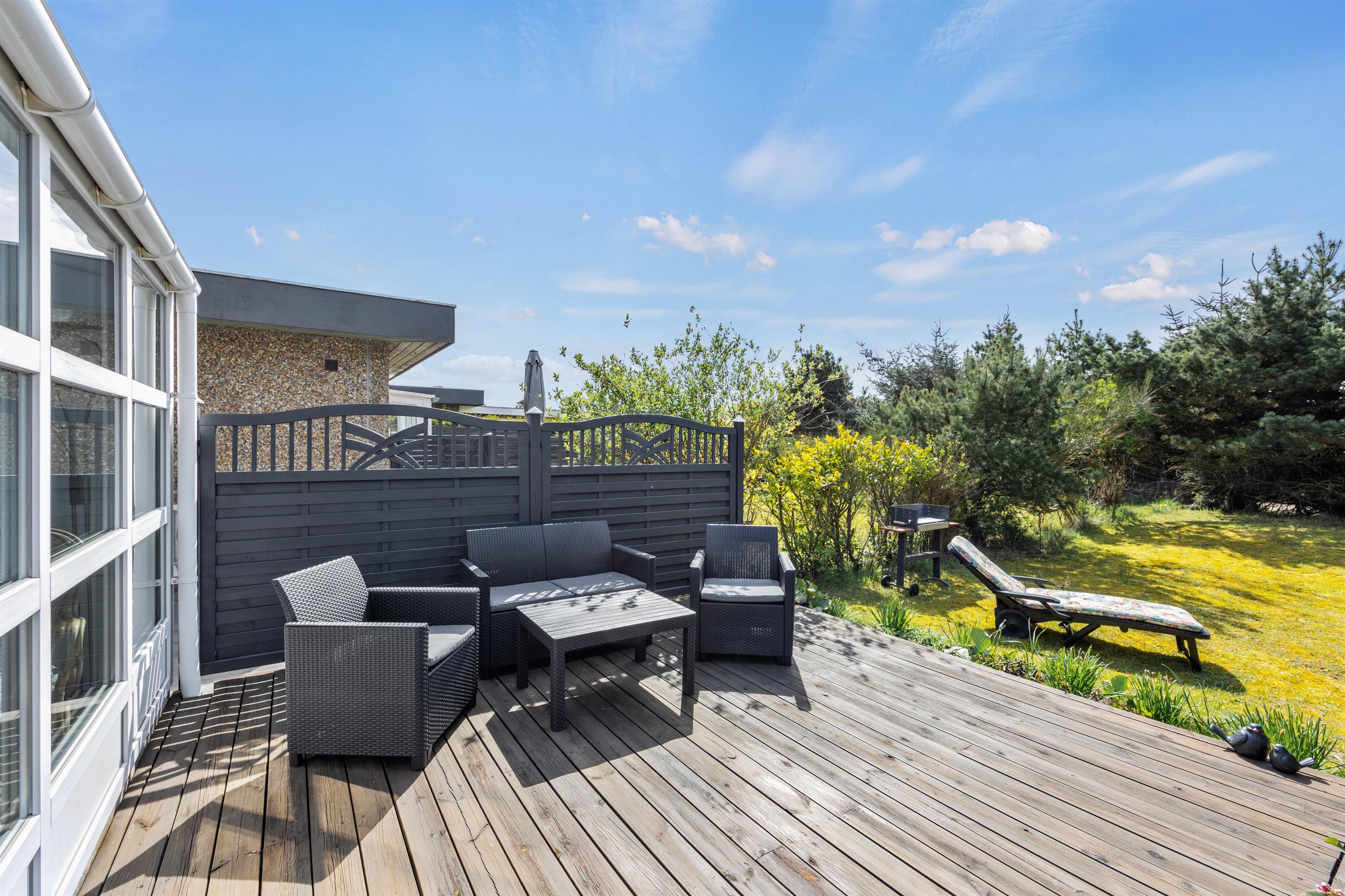 Selvom feriehuset er beliggende et stenkast fra Blåvands bymidte, har I her dejlig ro og fred. Den ugenerede plænegrund råder over en hyggelig terrasse med gode havemøbler og et loungesæt, en parasol og en grill, hvor I kan tilberede og nyde nogle lækre måltider i den lune aftensol. Herfra har I også fuldt udsyn til den fine have, hvor I roligt kan lade børnene tumle rundt, mens I planlægger morgendagens udflugter rundt om havebordet.