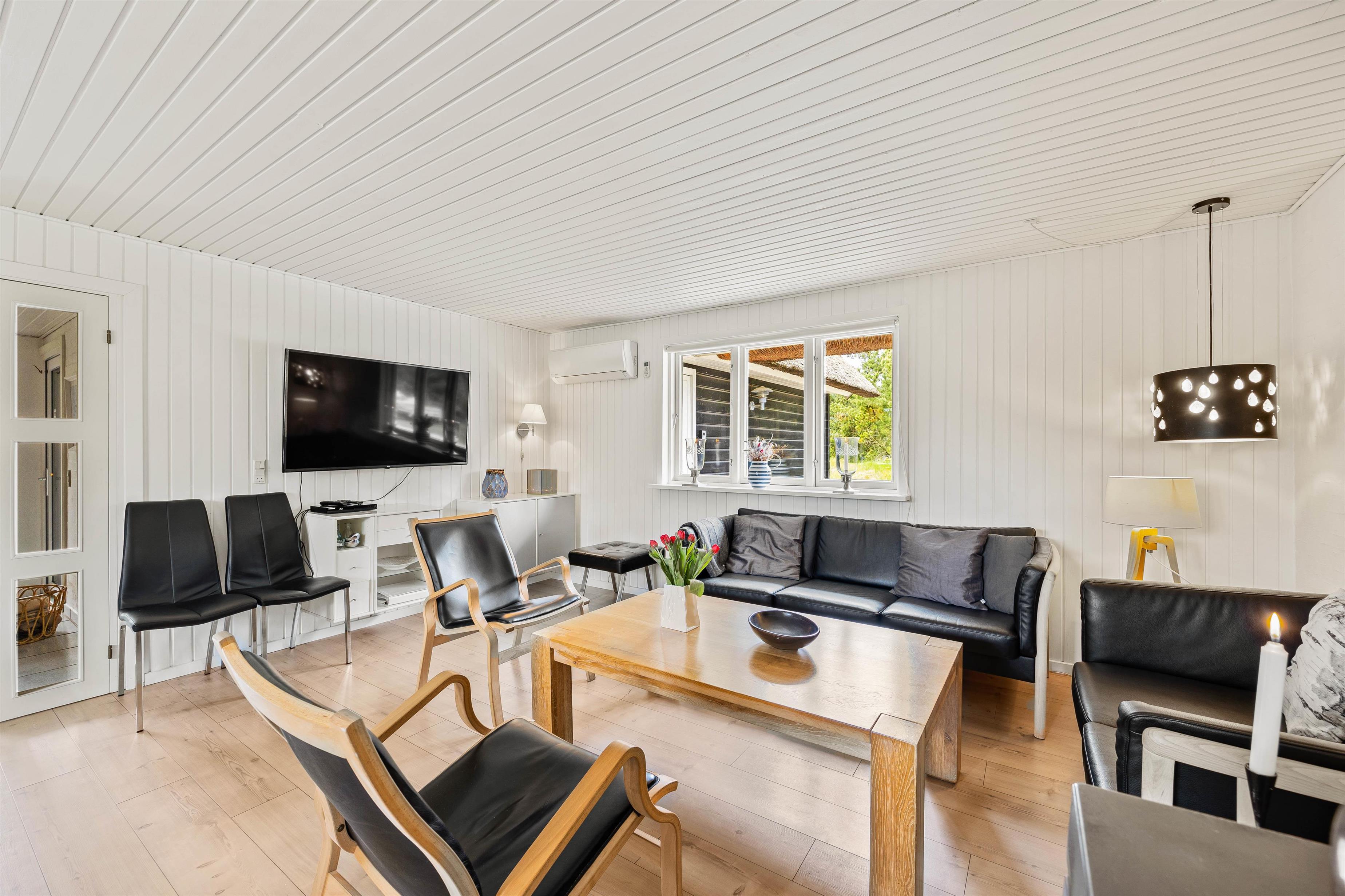 Sommerhuset til 14 personer er lyst og indbydende indrettet. Køkkenet ligger i åben forbindelse til spiseplads og den hyggelige, lille tv-stue. Her kan I hygge jer med et spil kort eller en god film, mens brændeovnen knitrer i baggrunden og sætter prikken over i’et til feriestemningen. Sommerhuset har også en energibesparende varmepumpe, som I kan benytte til at holde temperaturen i rummet behagelig
