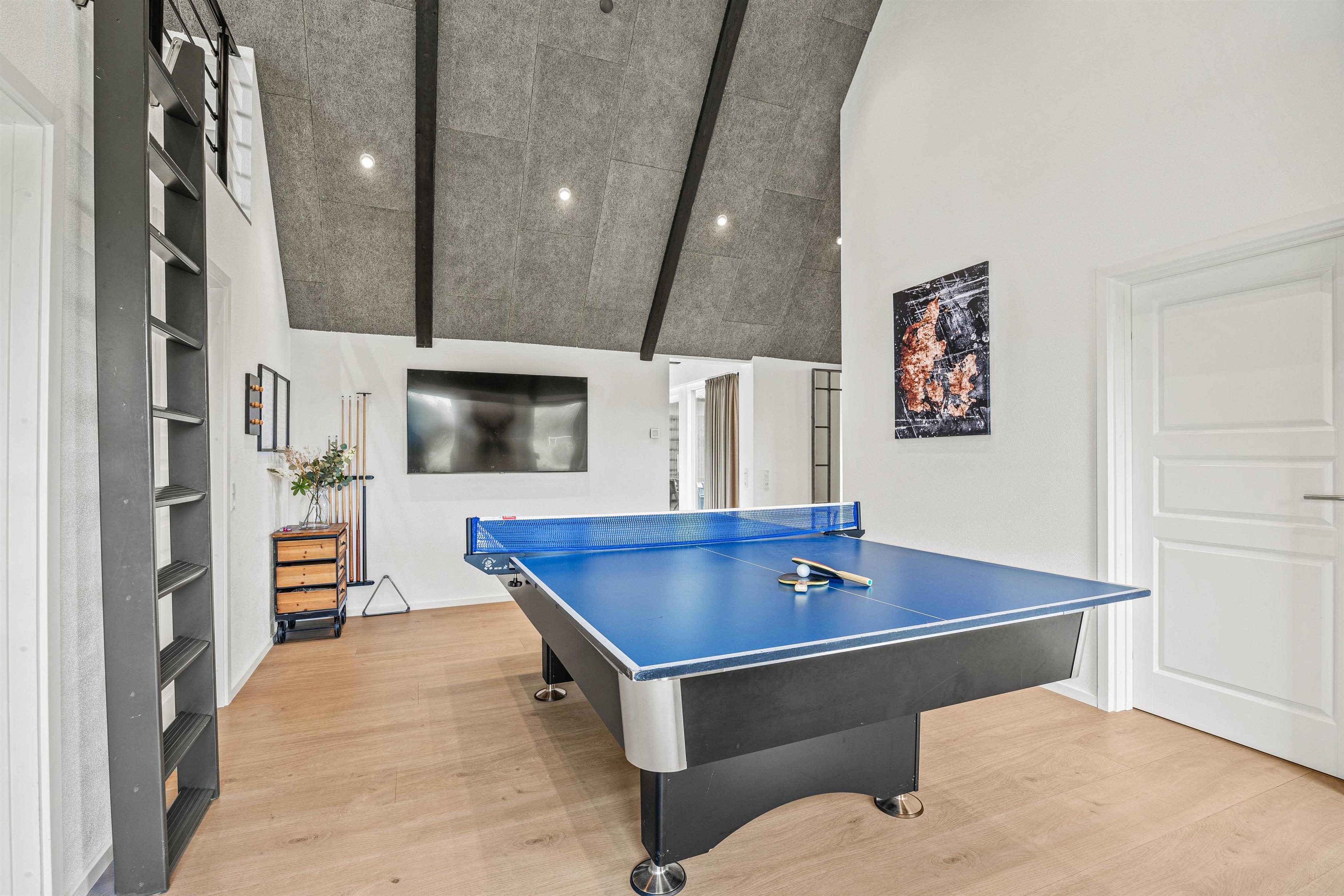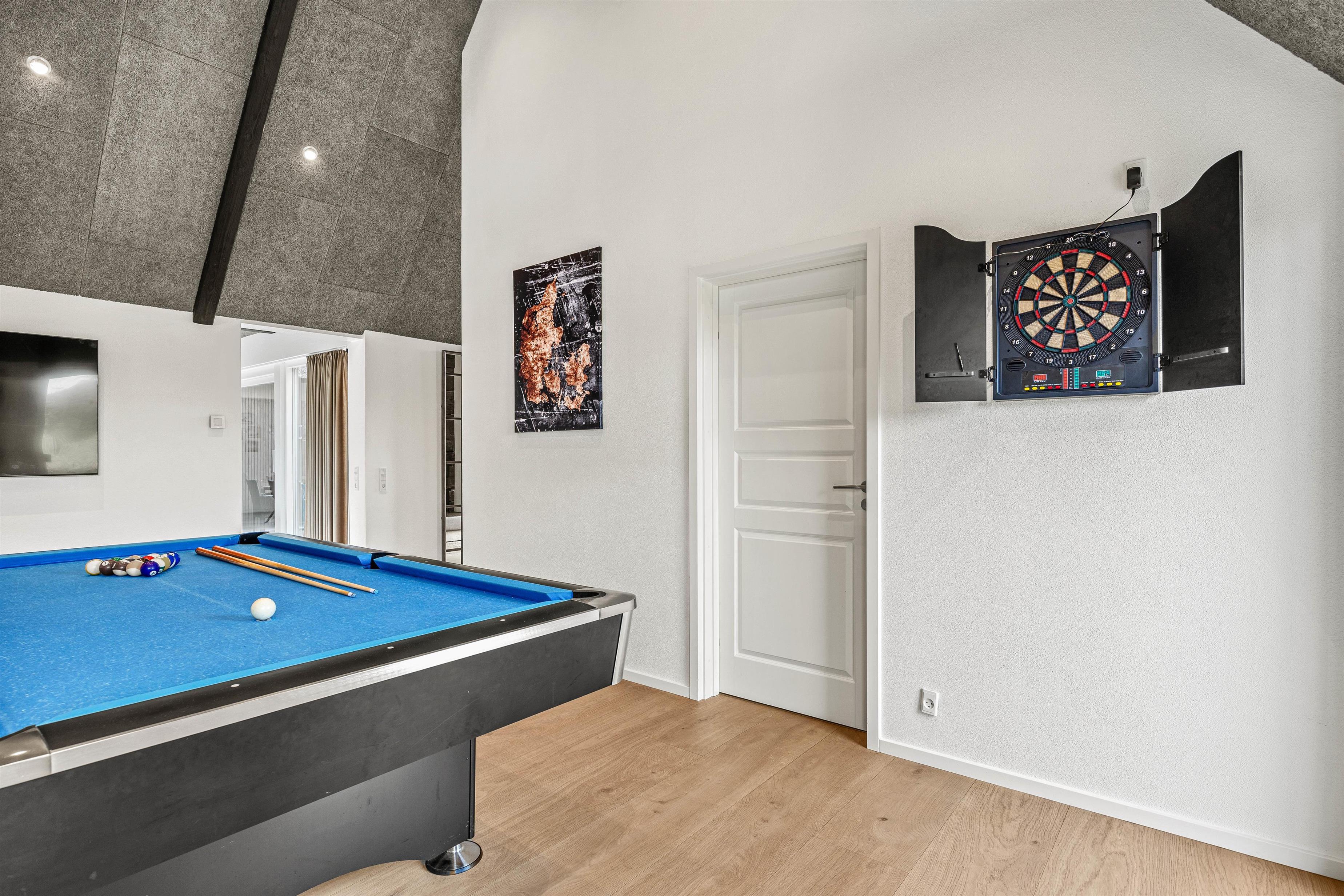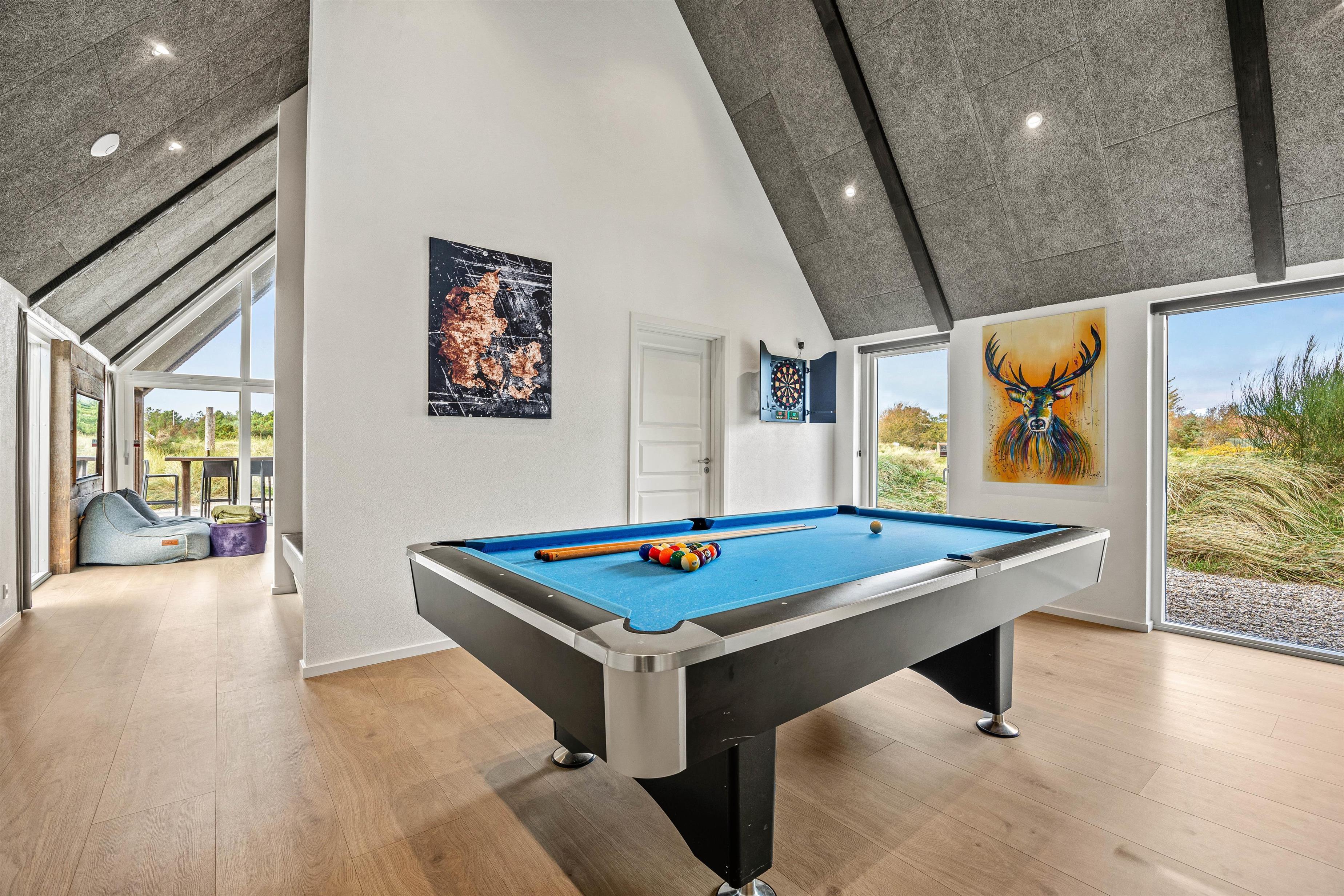 Sommerhuset på Sønder-Vasevej 2B byder på alt det udstyr, som I har brug for på en ferie og mere til. I det store opholdsrum er der højt til loftet, og de flotte kvalitetsmøbler indbyder til afslapning og fælles hygge. Ved siden af opholdsrummet ligger det store og lyse aktivitetsrum, hvor I kan afholde små turneringer i både billard og bordtennis.