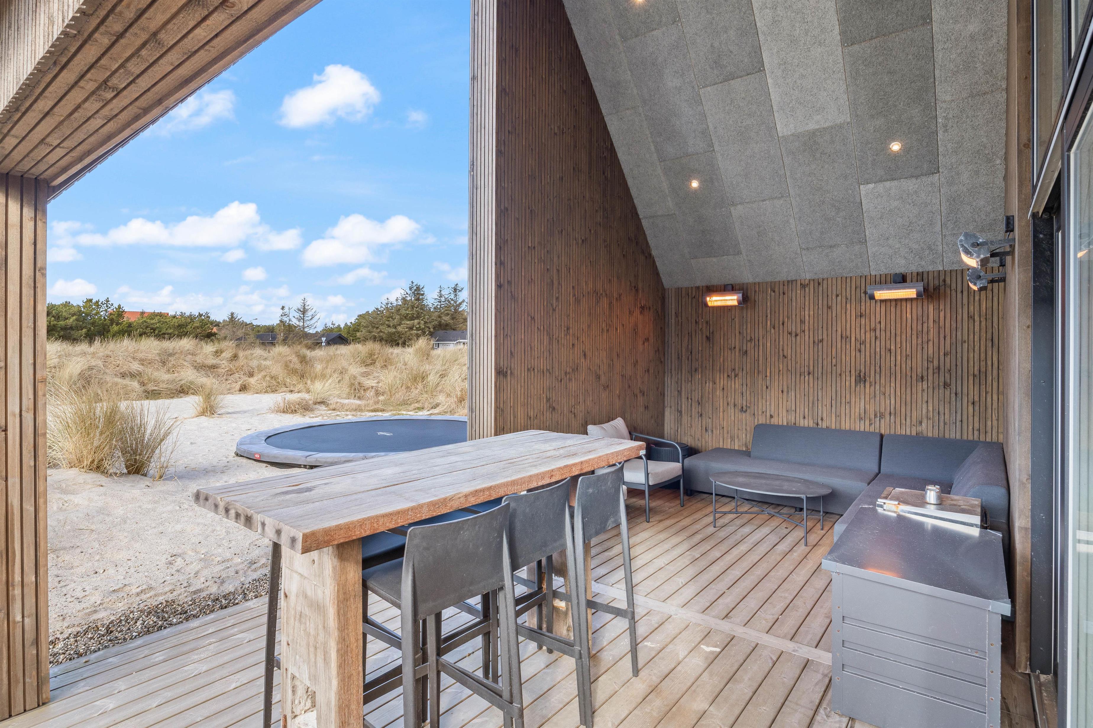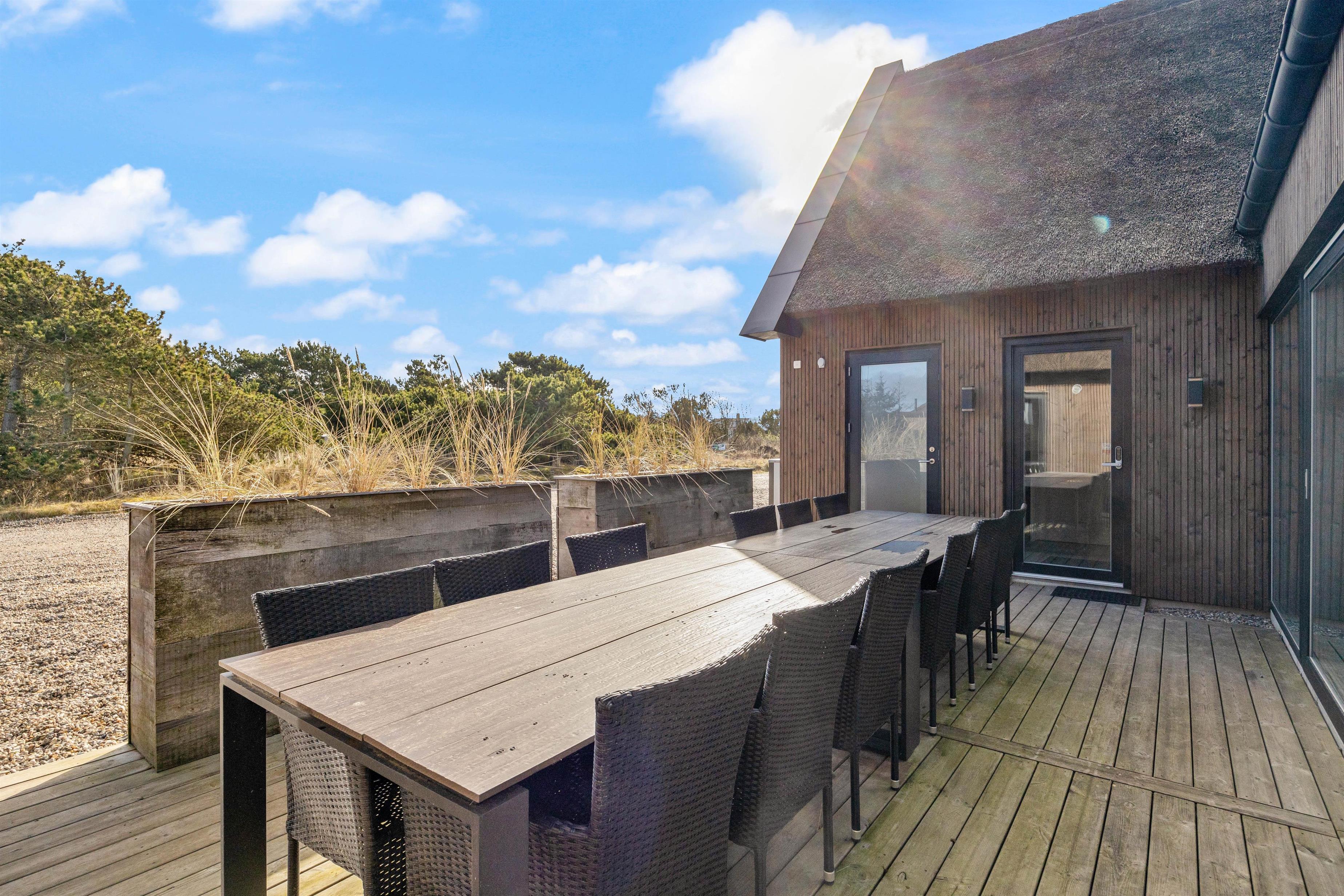 Fra opholdsstuen har I adgang til den rummelige, overdækkede terrasse, hvor I kan sidde i læ for Vestenvinden og på de kølige dag få varmen fra strålevarmerne. Fra køkkenet er der adgang til den åbne og delvis afskærmede terrasse, hvor I kan nyde en dejlig middag kreeret af feriens grillmester. Skulle I have lyst til en middagslur, eller er vejret til solbadning, er der naturligvis solvogne og parasol til jeres rådighed.