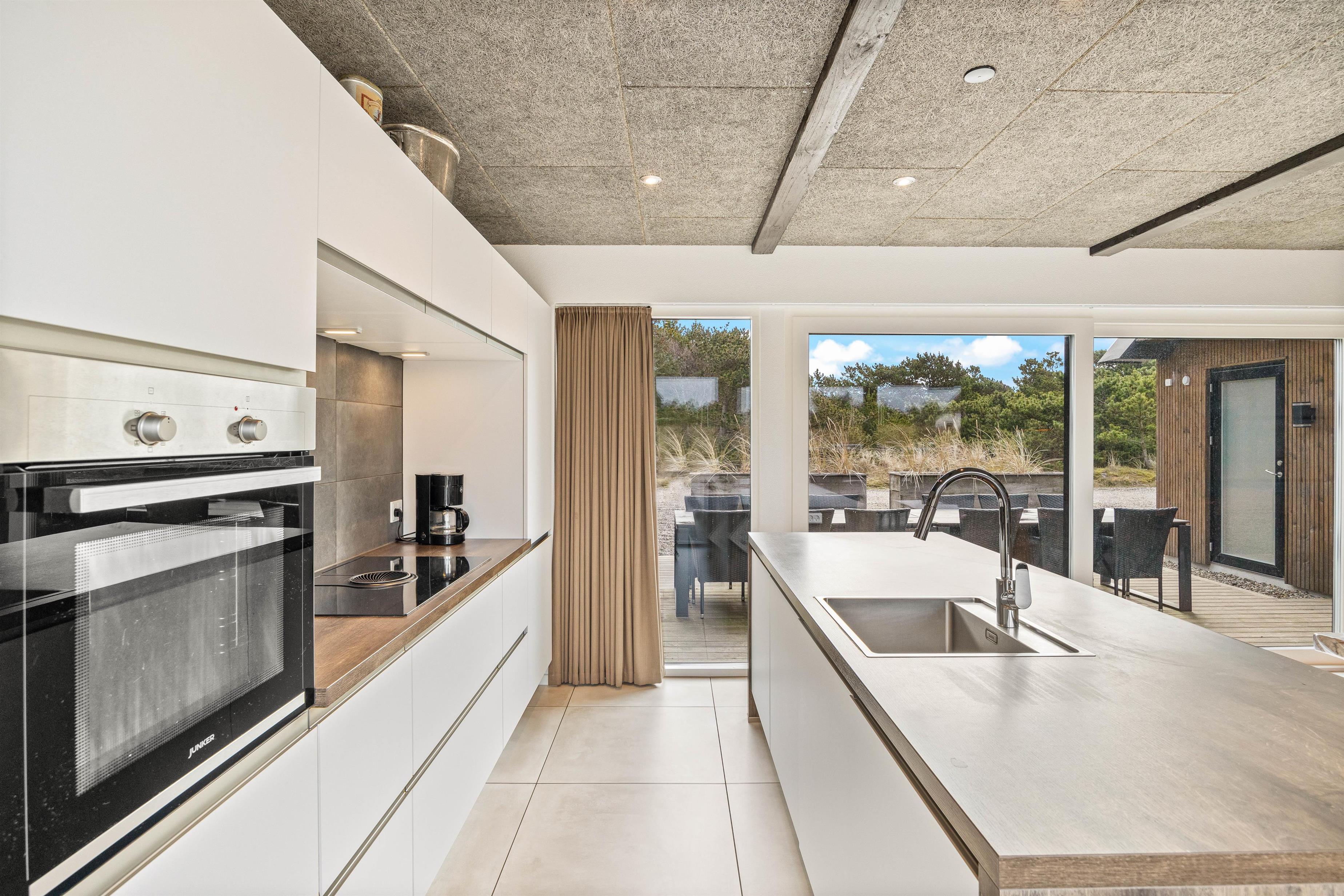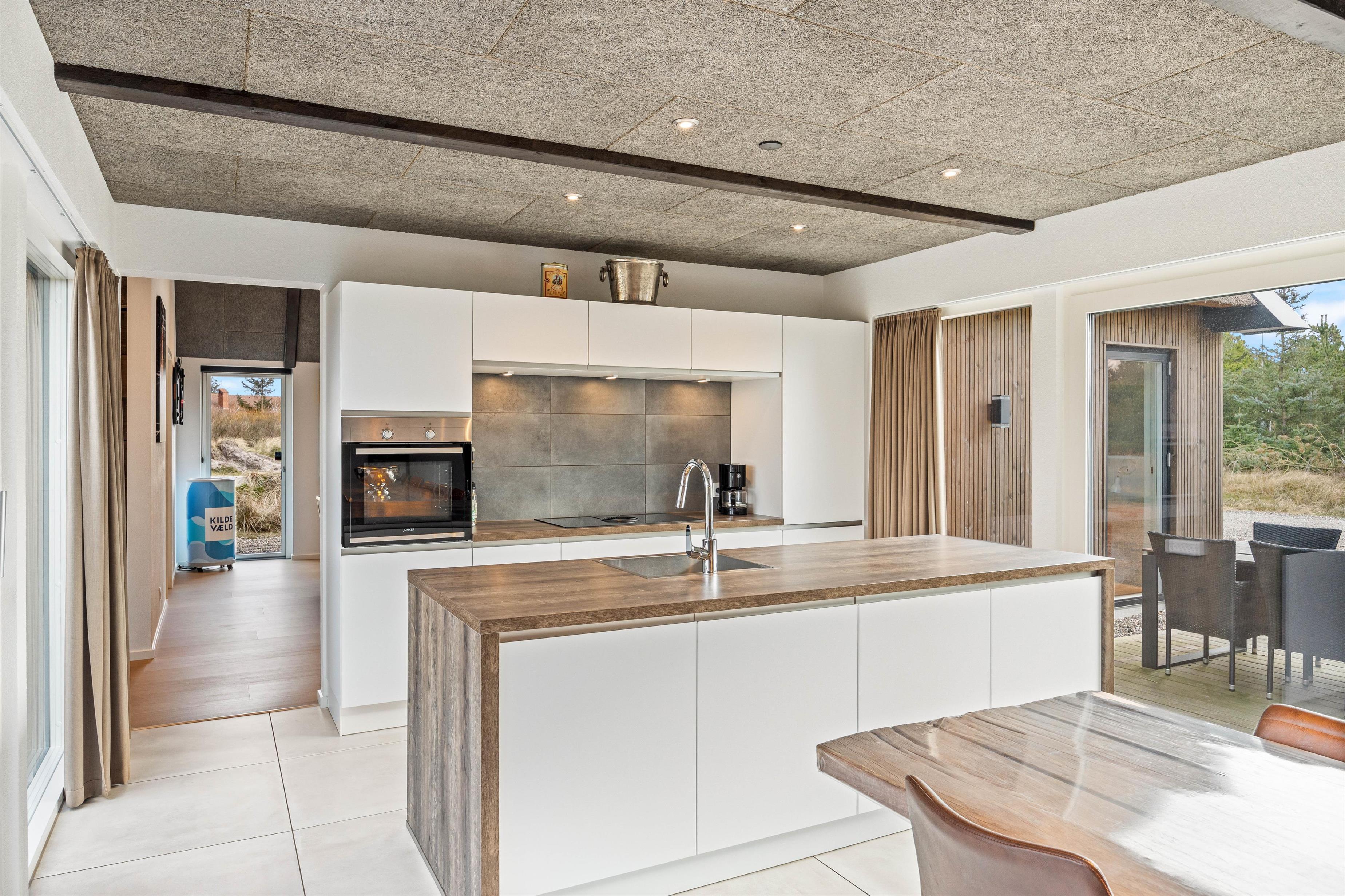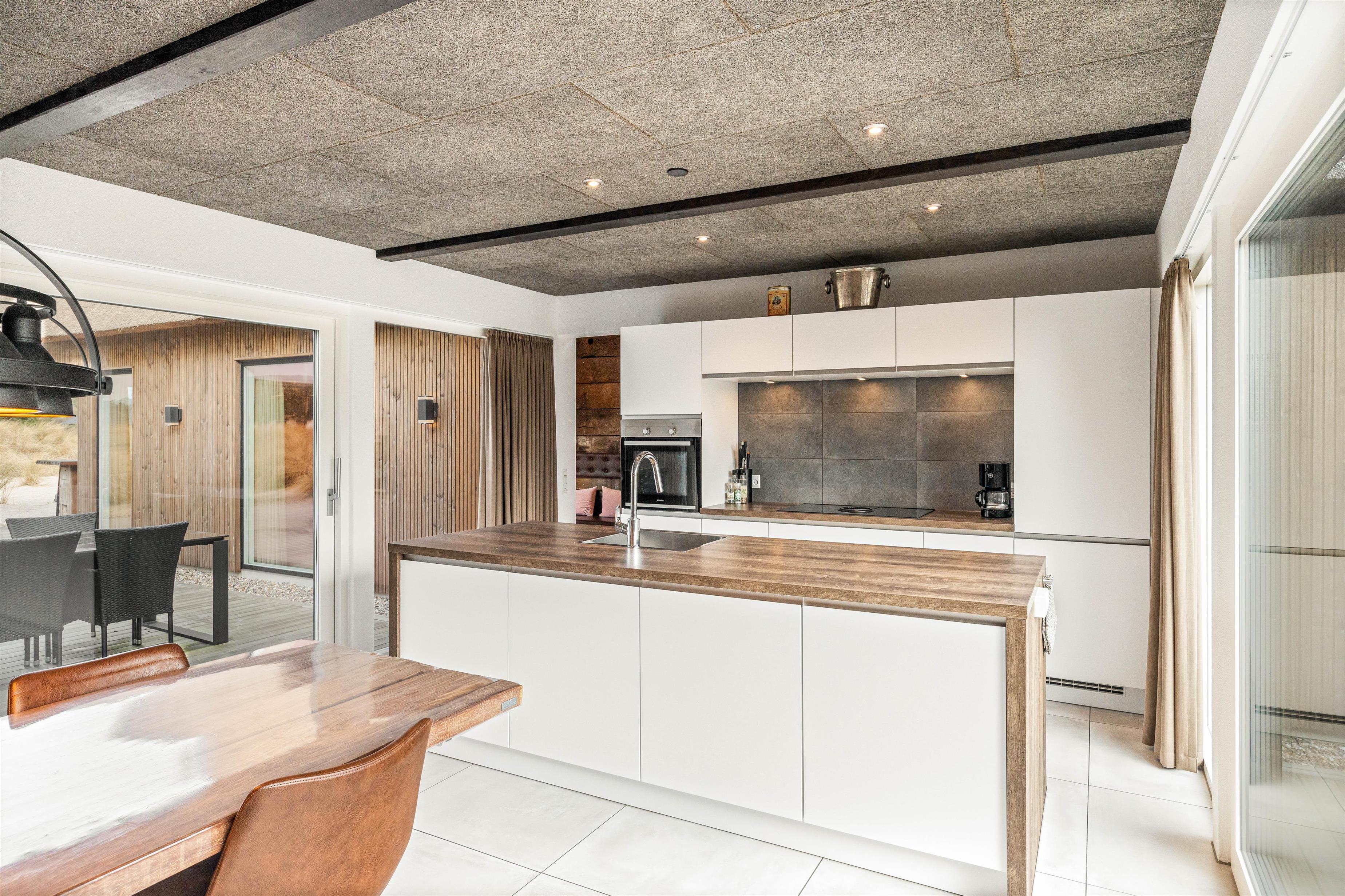 I det lyse og rummelige køkken med kogeø og moderne udstyr kan I være sammen om madlavningen og bagefter nyde den gode mad ved det store spisebord. I kan også nyde udsigten til den vajende marehalm gennem de store vinduespartier i køkkenet, hvor der også er udgang til den dejlige terrasse.