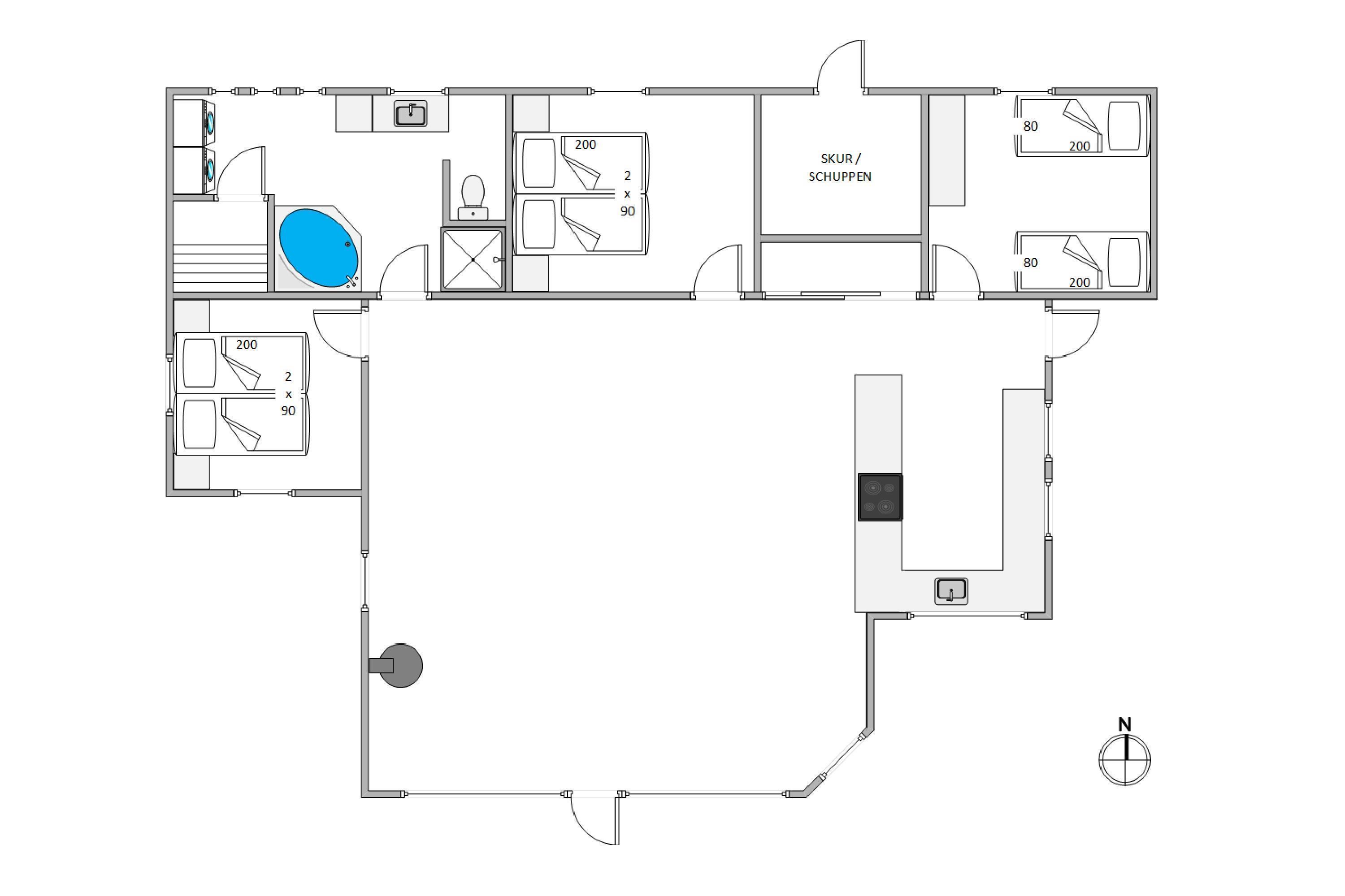 Det åbne opholdsrum med integreret køkken sætter rammerne for en ferie i samværets tegn, og med opvaskemaskine, vaskemaskine og tørretumbler i huset får I endnu mere tid til at nyde tiden sammen, mens hverdagens hjælpere tager sig af de huslige pligter.