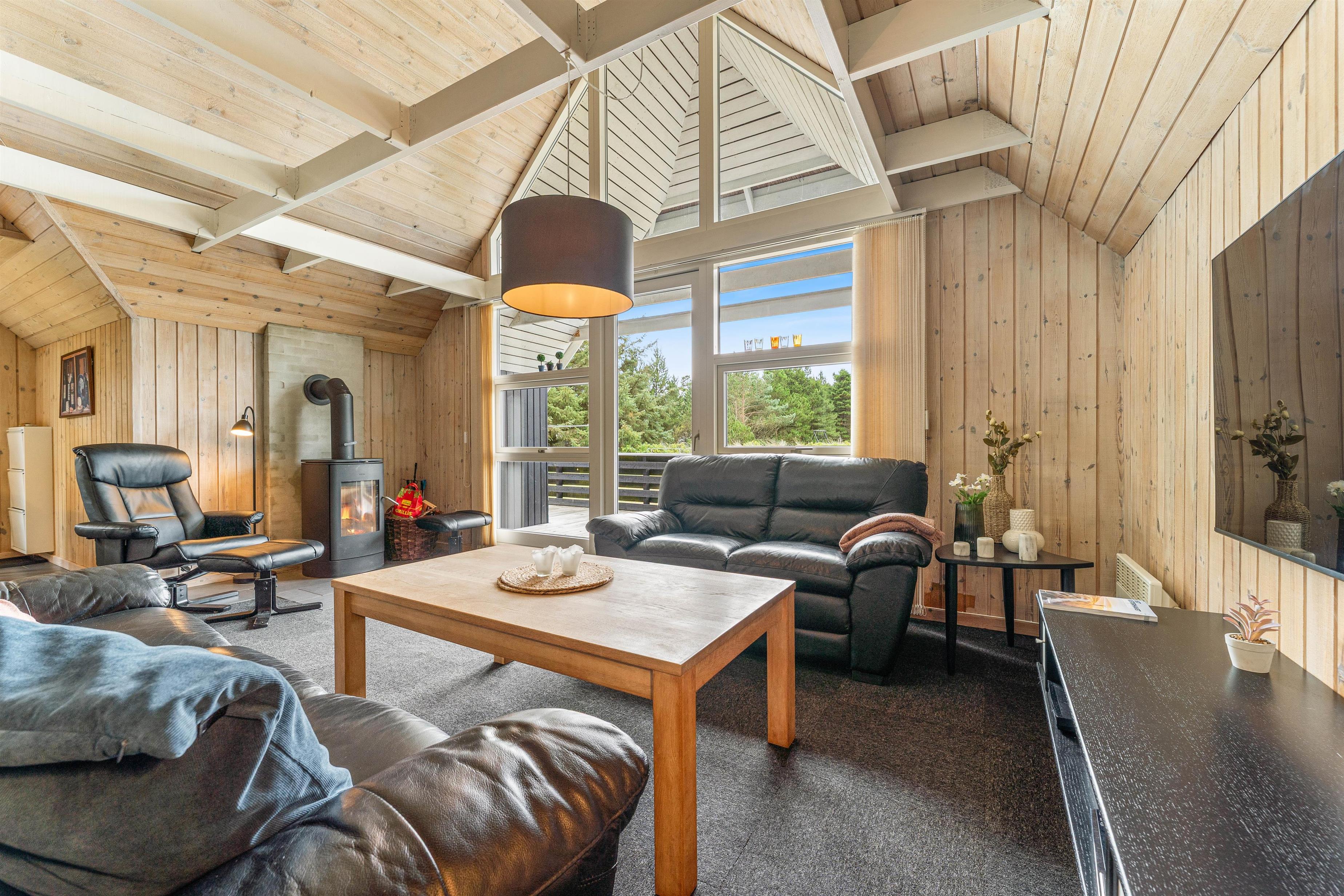 Dette klassiske feriehus, som ligger smukt mellem træer og lyngheden, er indbegrebet af dejlig hygge-ferie. Stuens store panoramavindue giver et dejligt lysindfald imens træpaneler og møbler sørger for en varm og hyggelig stemning. Efter en lang dag i den friske luft vil I nyde, at kunne slappe af foran brændeovnen og sammen lægge planer for morgendagens oplevelser. Her er en god internetforbindelse, så det er ingen problem at komme på nettet, når der skal lægges planer.