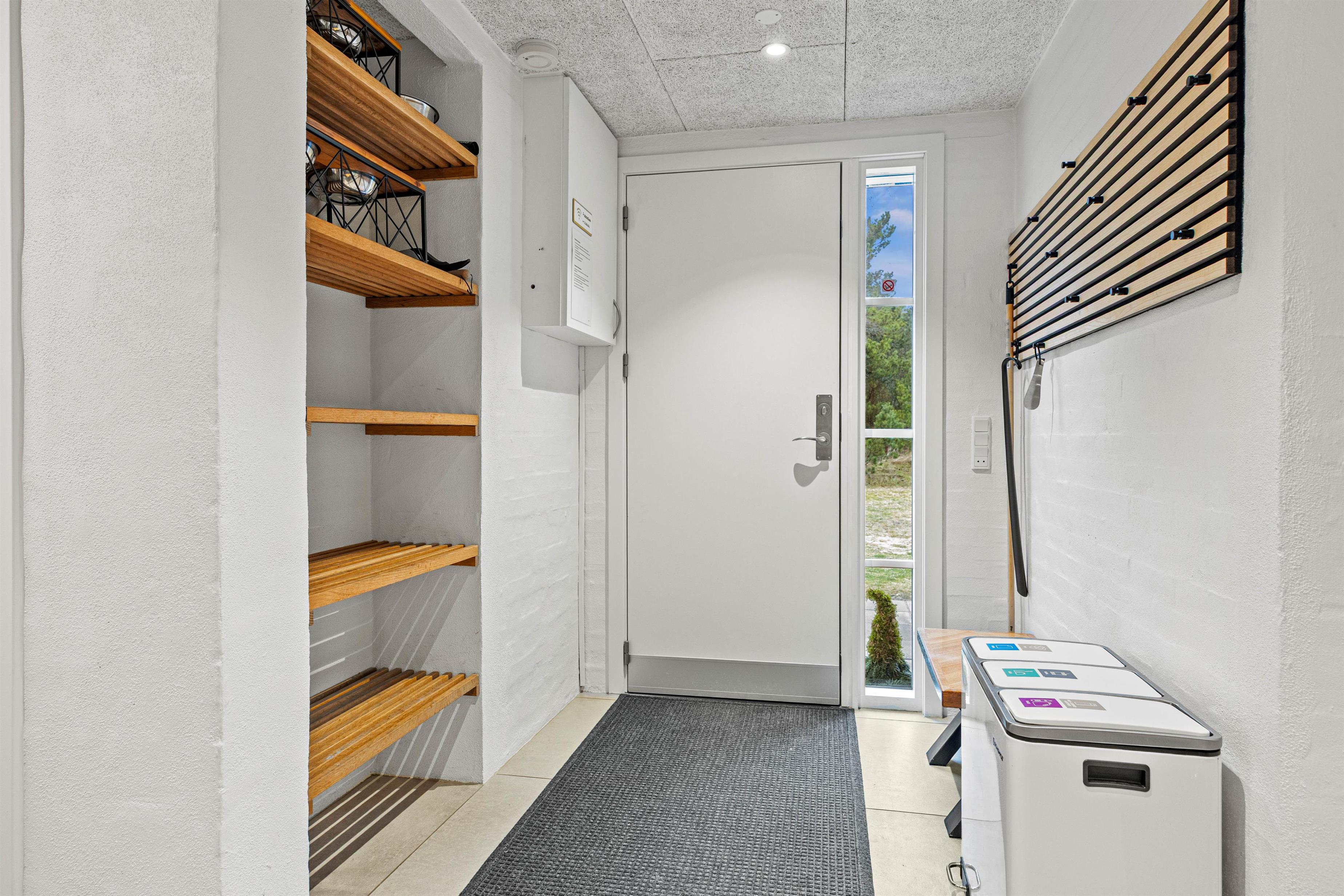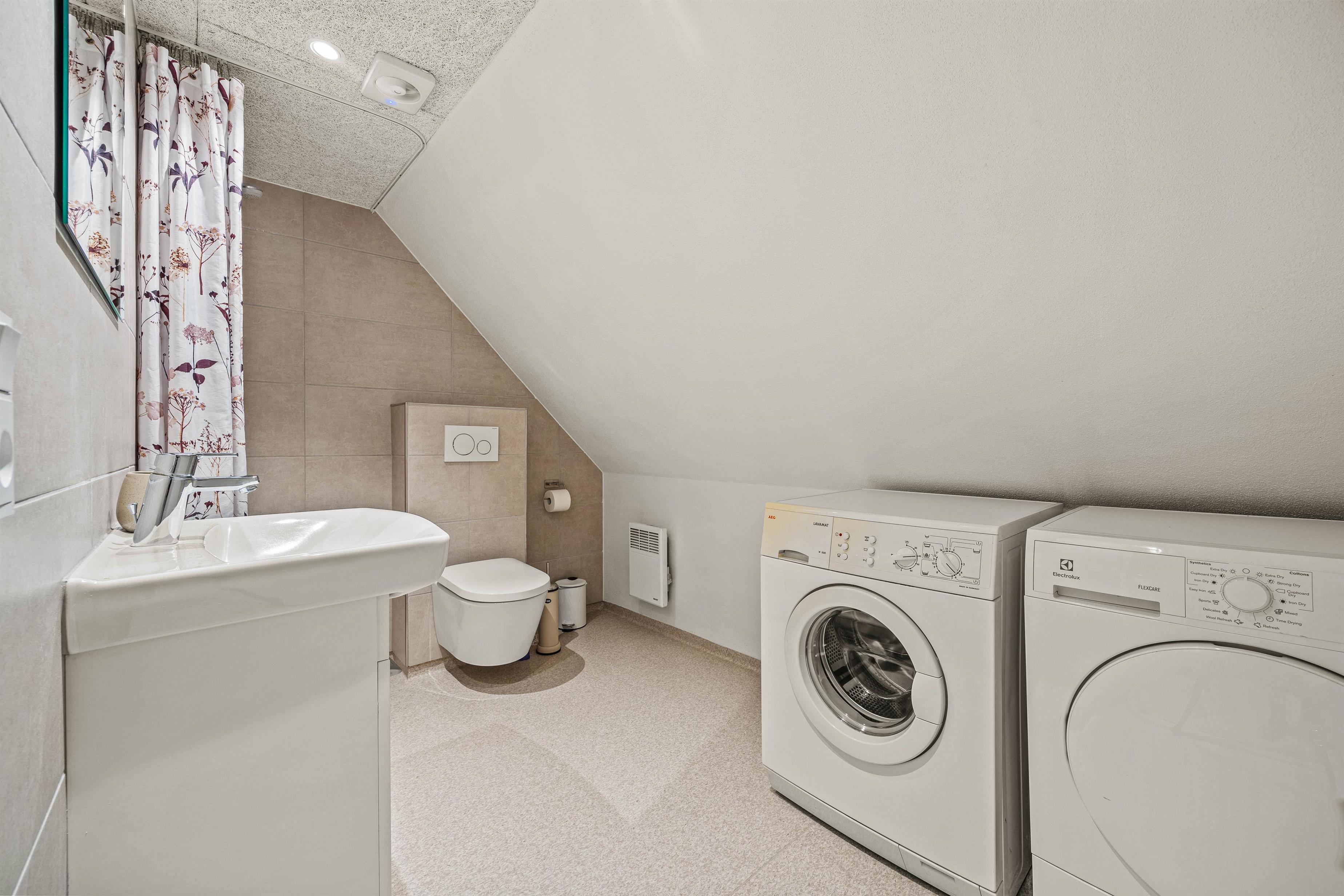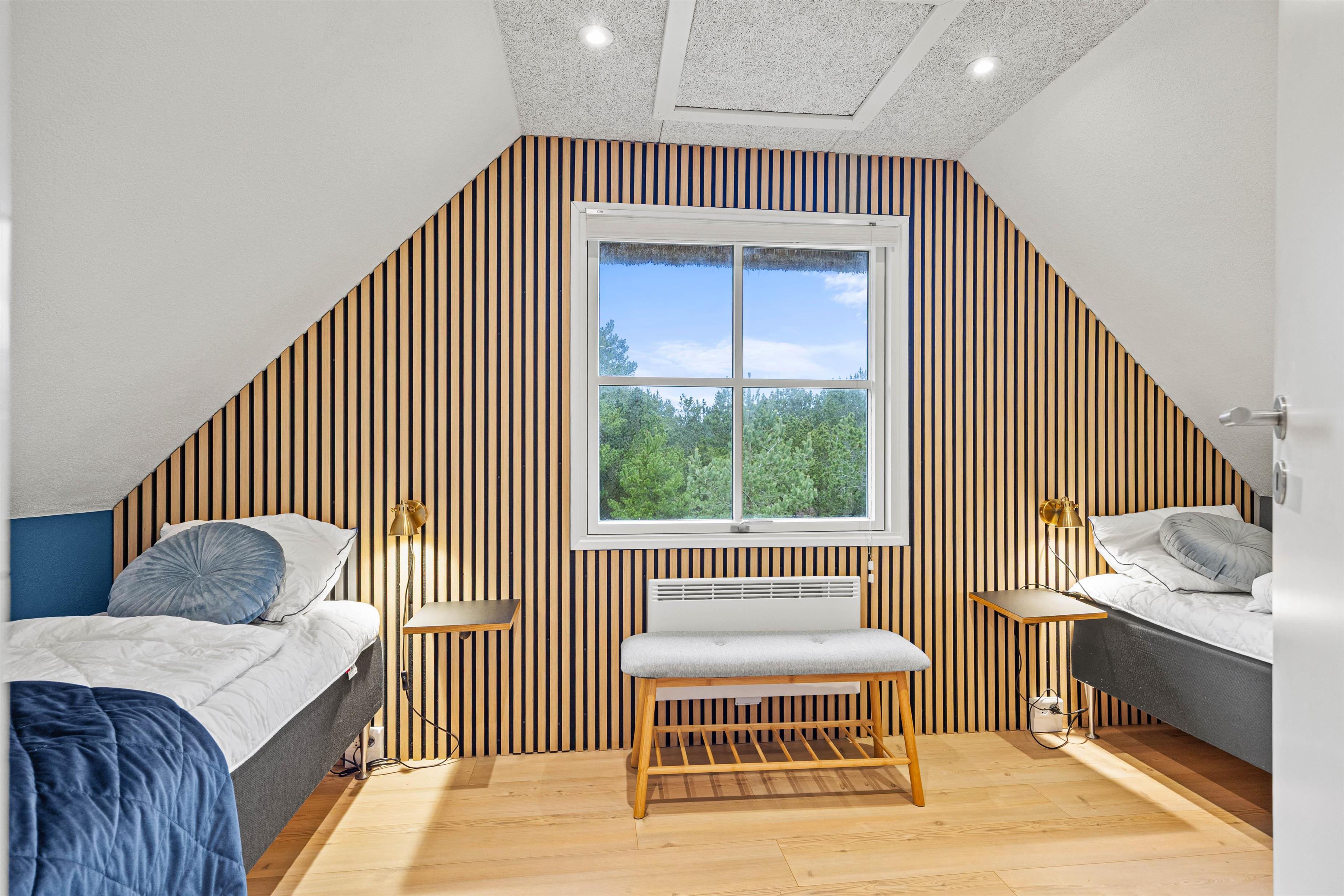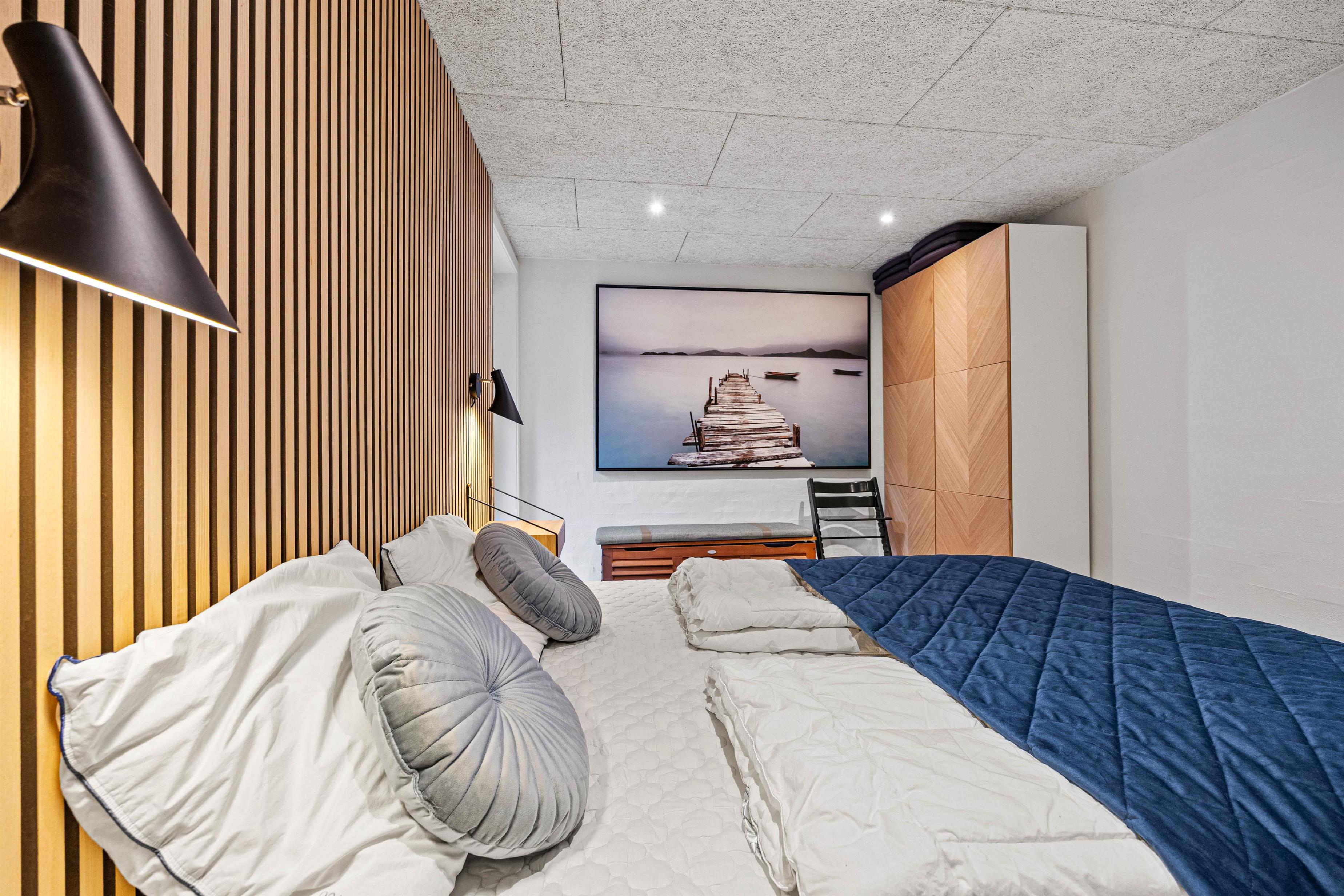 Den stilfulde, skandinaviske atmosfære fortsætter i indretningen af soverummene. I stueetagen venter jer 1 soveværelse med dobbeltseng, imens de resterende 4 soverum befinder sig på 1. salen. Her får I 3 rum med dobbeltsenge og et med enkeltsenge. Derudover har sommerhuset to moderne badeværelser fordelt på begge etager - begge med gulvvarme og et med vaskemaskine og tørretumbler.