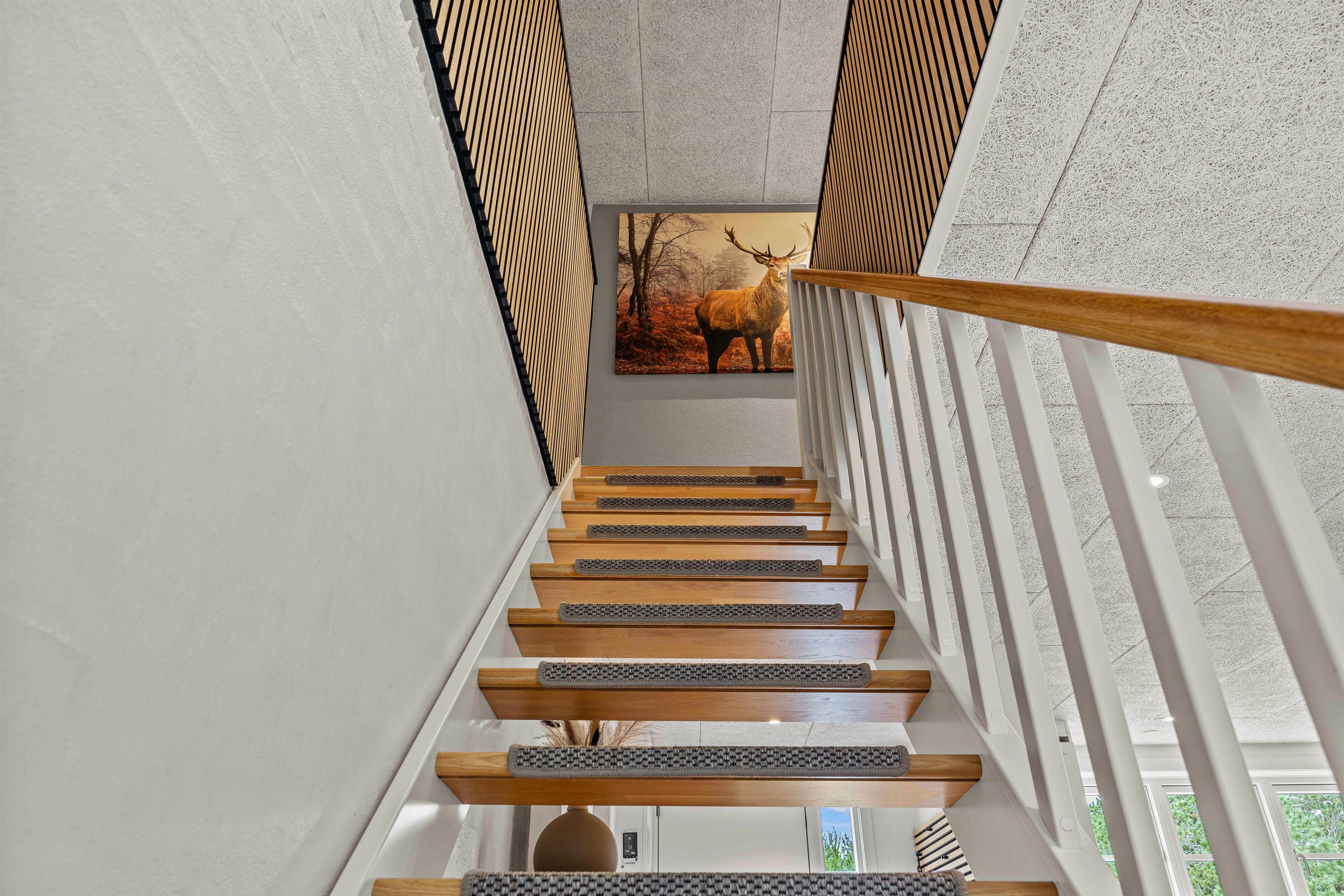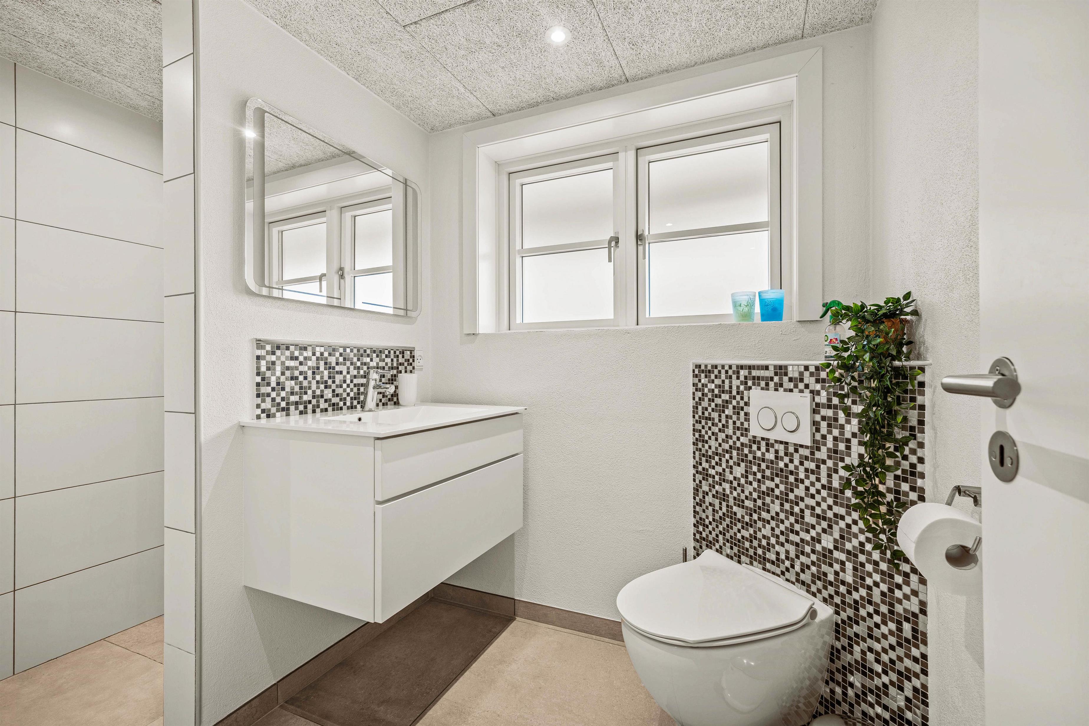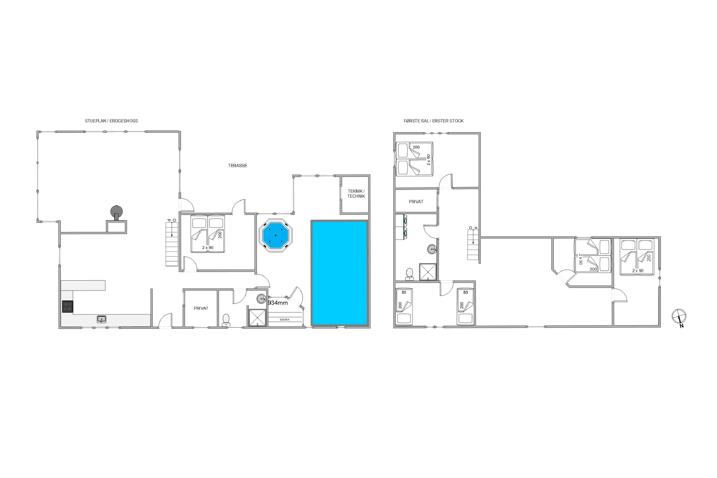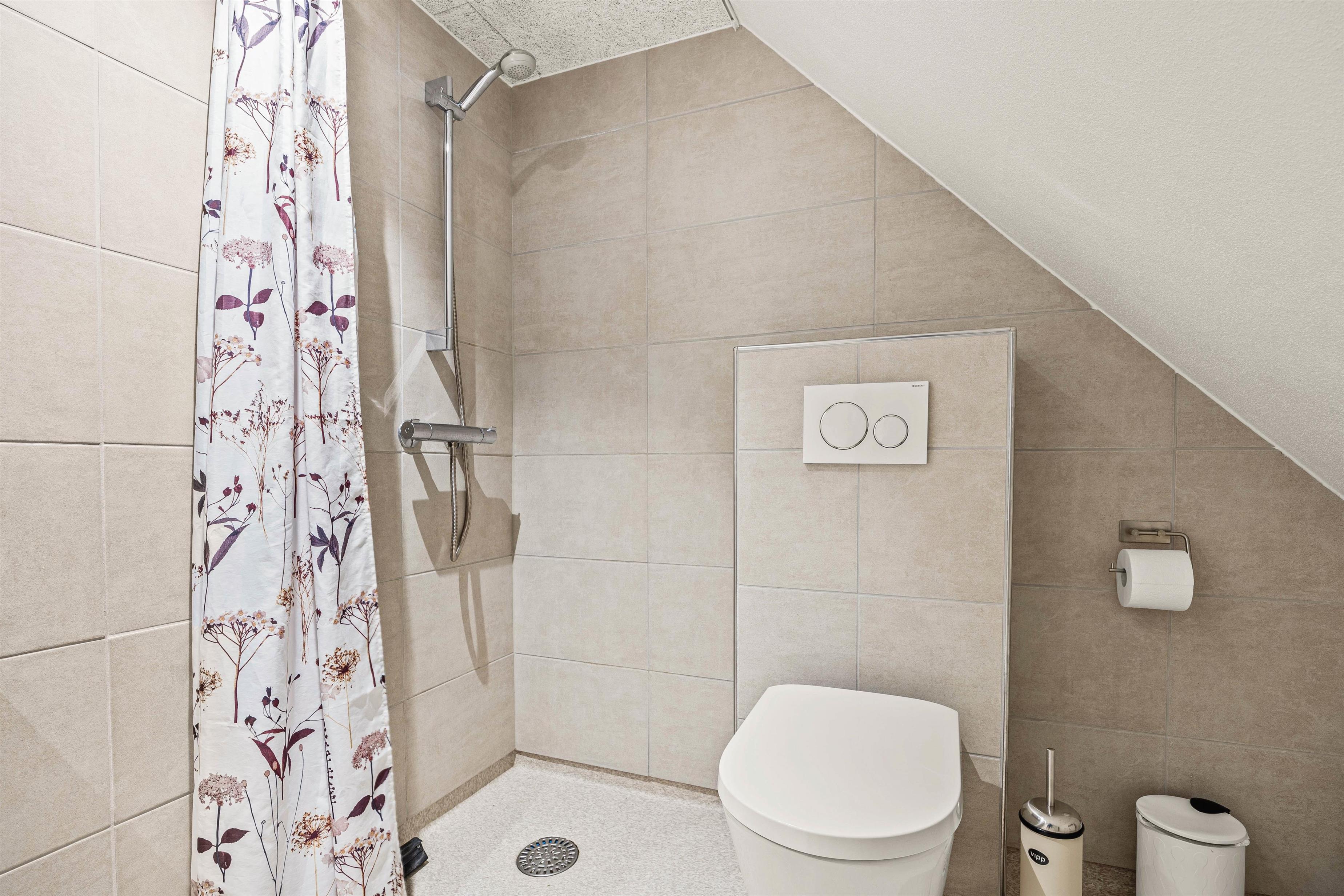 Den stilfulde, skandinaviske atmosfære fortsætter i indretningen af soverummene. I stueetagen venter jer 1 soveværelse med dobbeltseng, imens de resterende 4 soverum befinder sig på 1. salen. Her får I 3 rum med dobbeltsenge og et med enkeltsenge. Derudover har sommerhuset to moderne badeværelser fordelt på begge etager - begge med gulvvarme og et med vaskemaskine og tørretumbler.