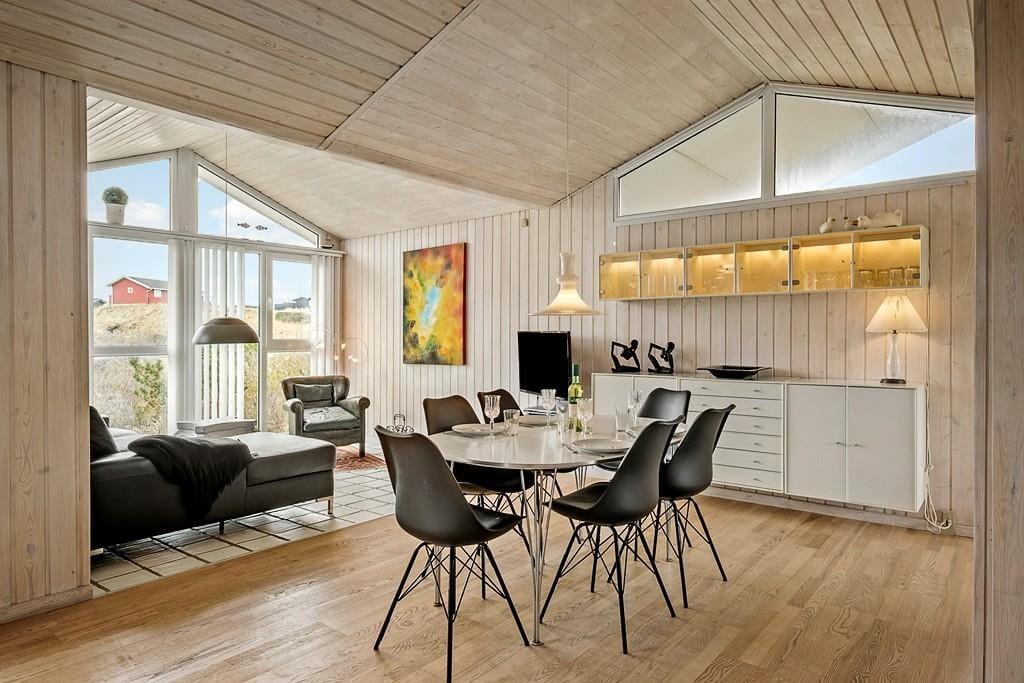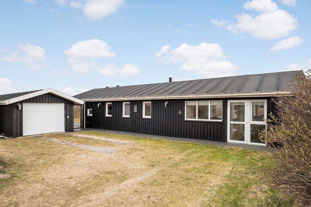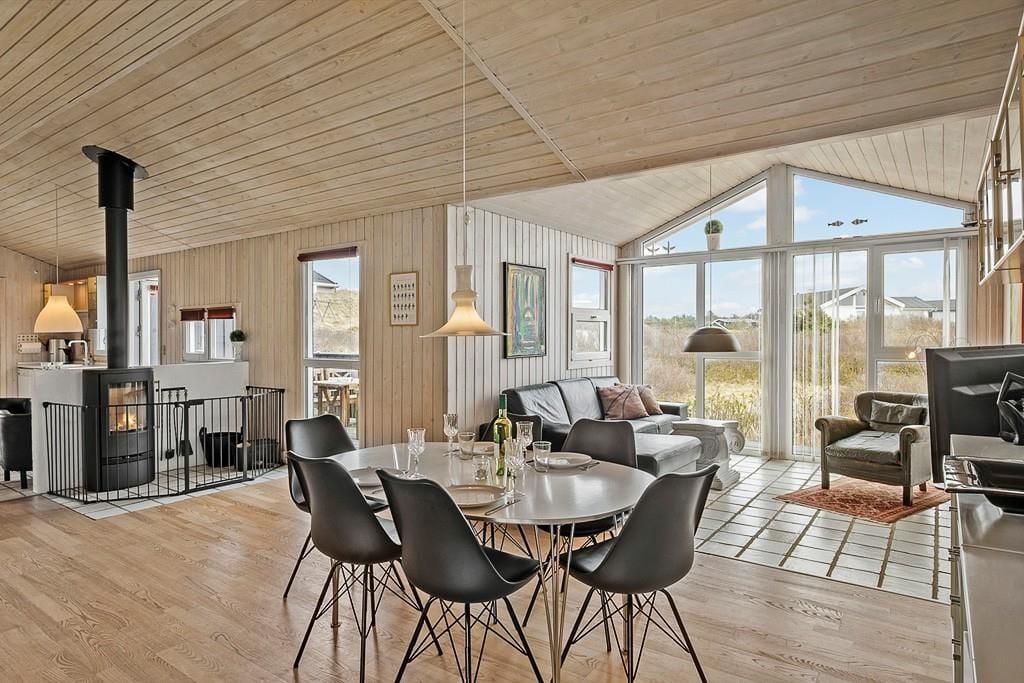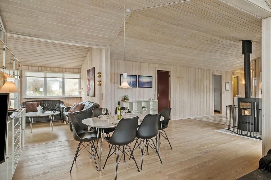 Sommerhus i Blokhus Strand og By, Nordjylland, med plads til 4 voksne, 6 børn og 1 husdyr. Der er en hyggelig indretning med bl.a. brændeovn, og du finder desuden vaskemaskine, opvaskemaskine og tørretumbler i boligen.