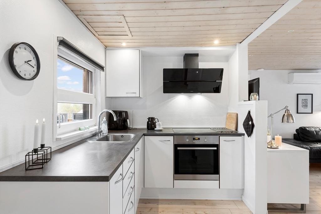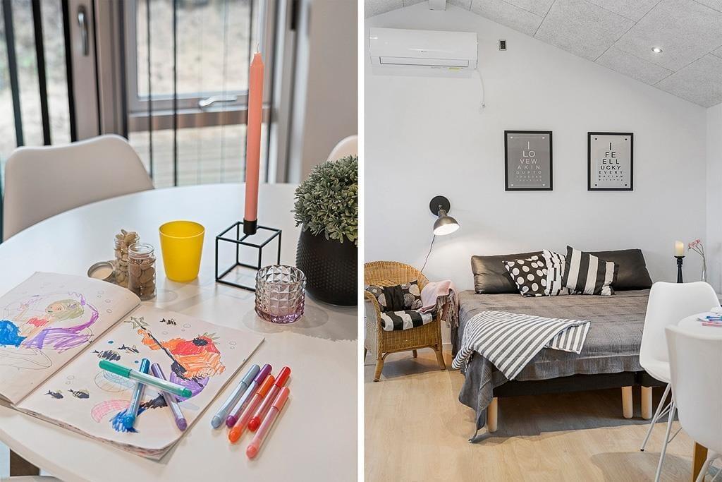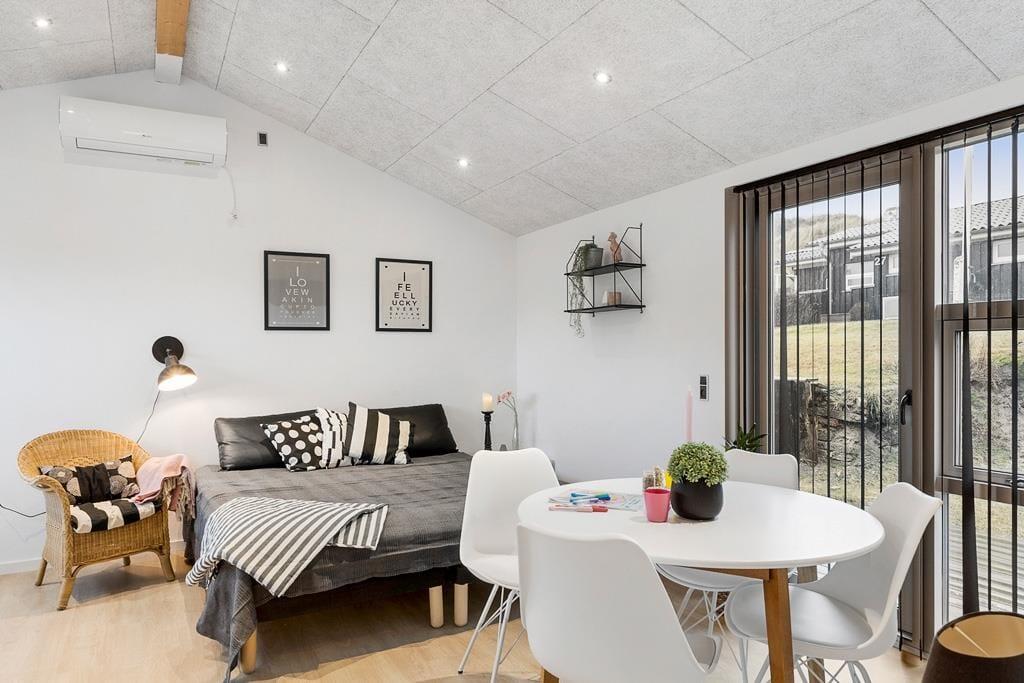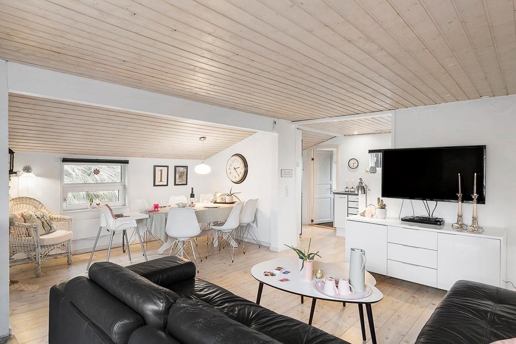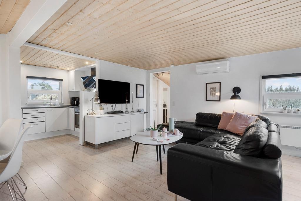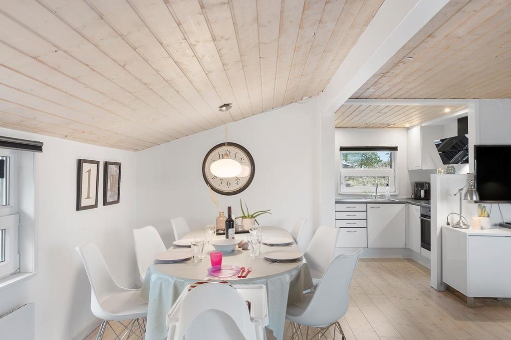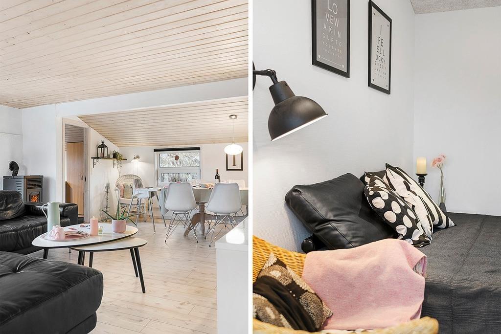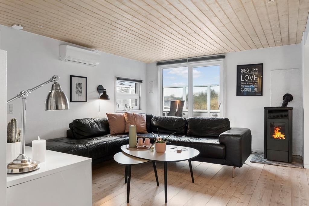 Velkommen indenfor i et dejligt og velfungerende sommerhus. Huset er indrettet i en varm stil med hvide trævægge, fine møbler og en stor brændeovn, som gør, at man sagtens kan holde ferie her i de kølige måneder. Faktisk er der ikke noget bedre end at komme ind i varmen og slappe af med en kop varm kakao efter et par timer på legepladsen eller en lang og frisk gåtur langs stranden. Sommerhusets centrale rum er stuen, hvor der kanslappes af foran tv’et, leges på gulvet eller læses en god bog. Derudover råder huset over to værelser med dobbeltsenge og et badeværelse med bruser. Et rigtig hyggeligt og velfungerende sommerhus, hvor familien nok skal få indhentet lidt kvalitetstid!