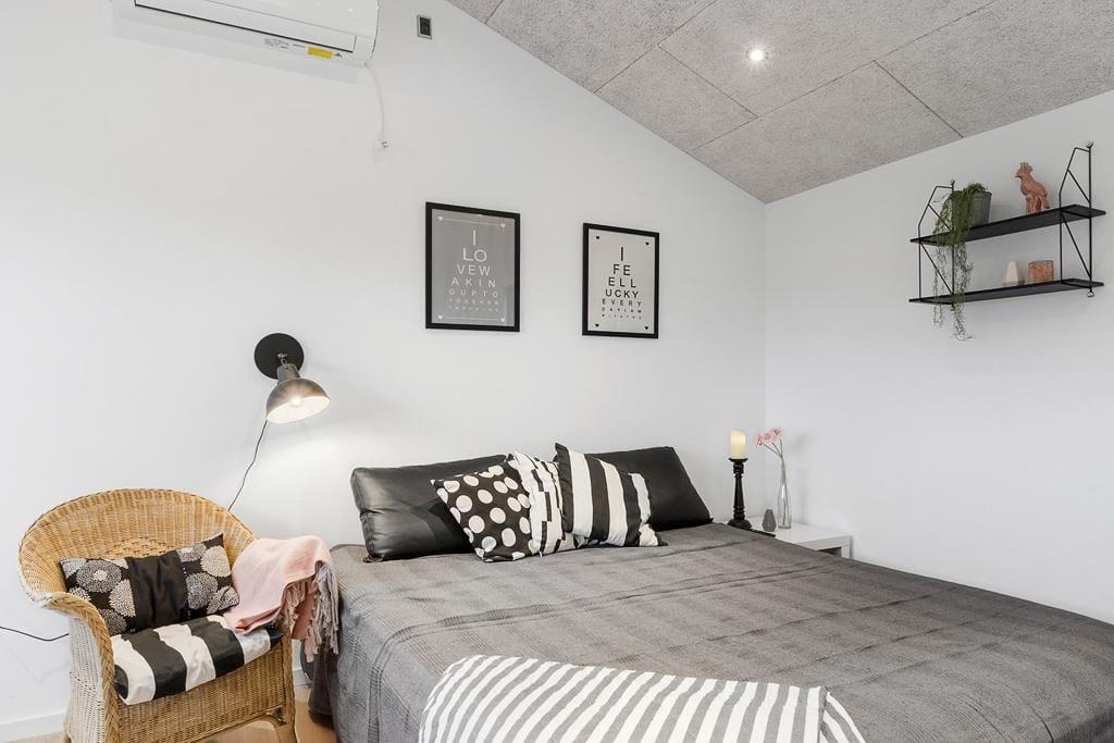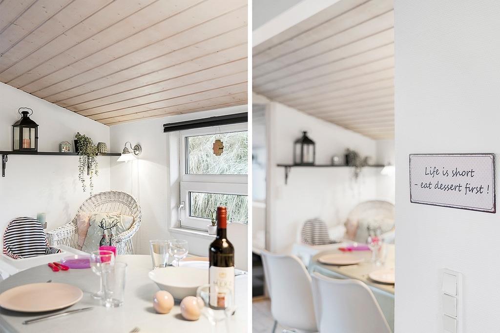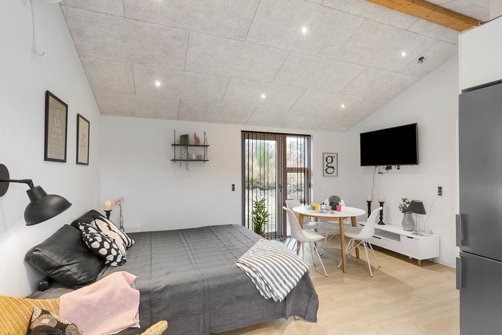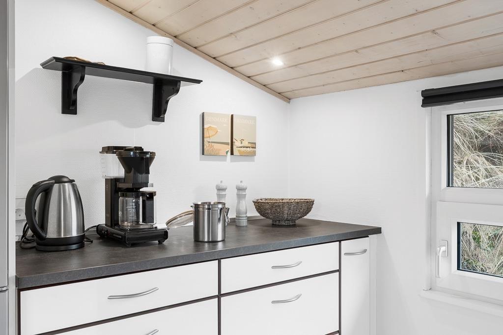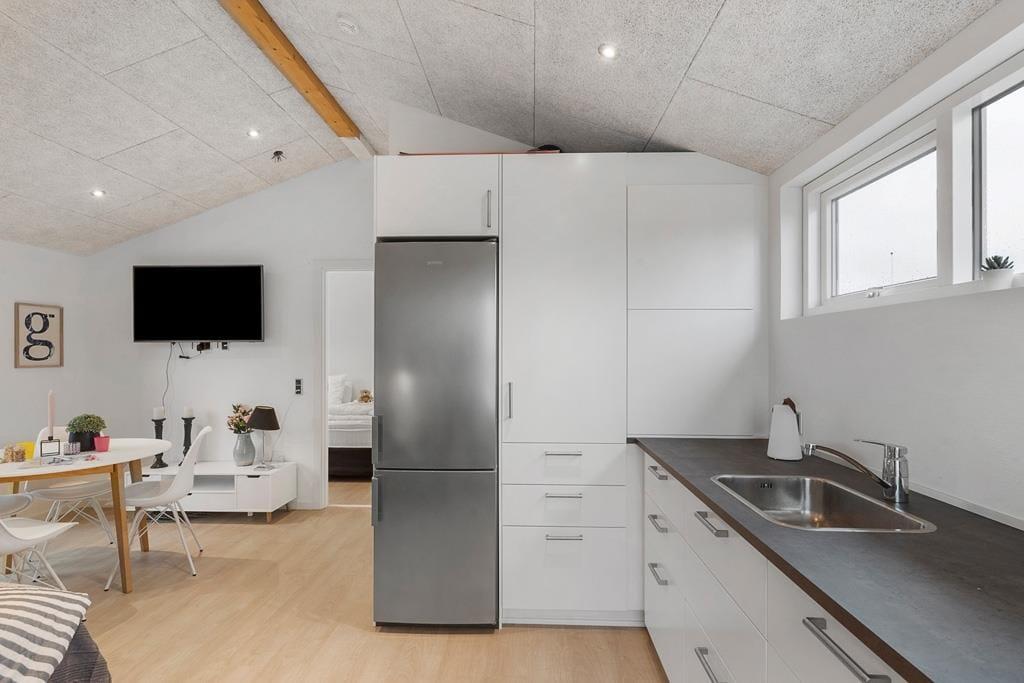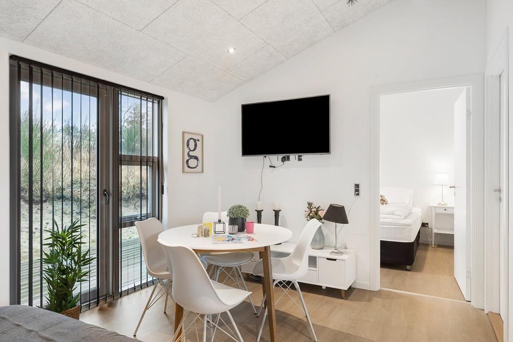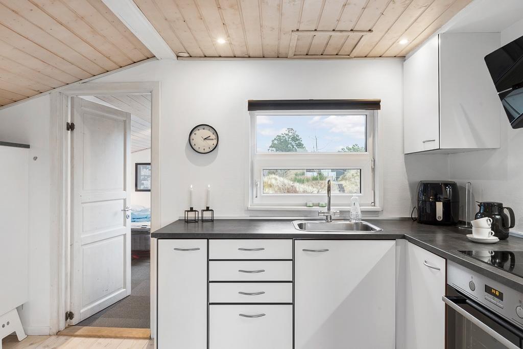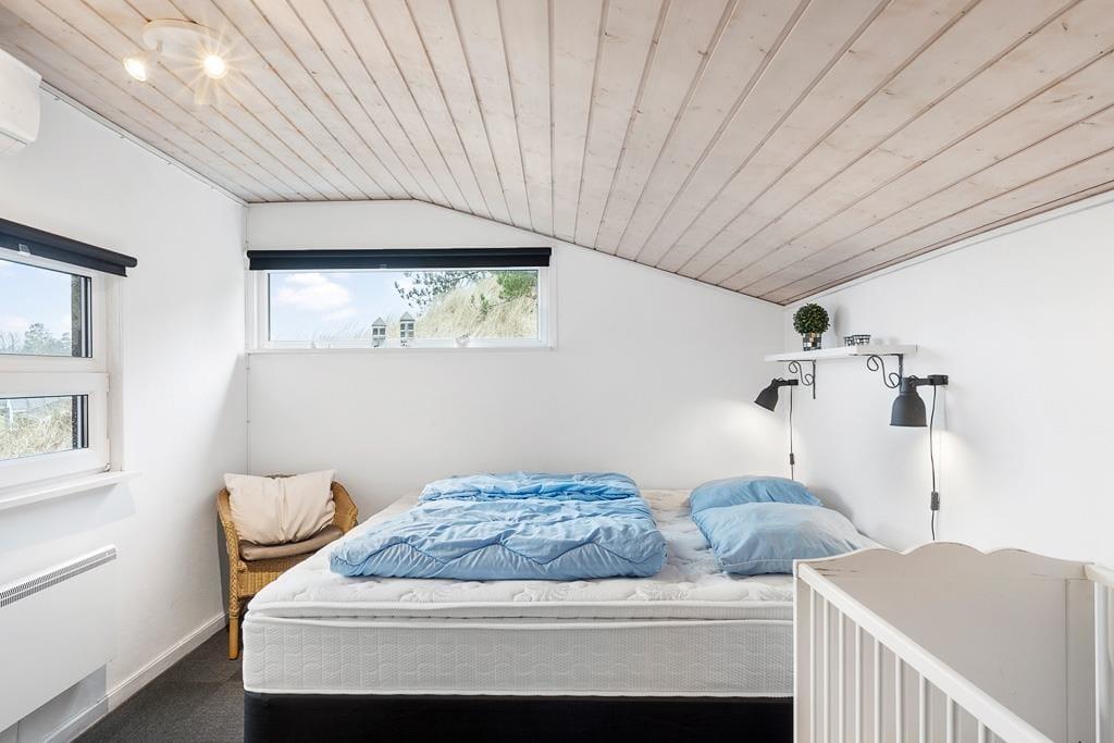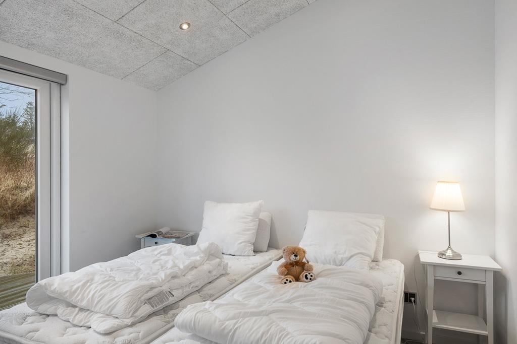 Velkommen indenfor i et dejligt og velfungerende sommerhus. Huset er indrettet i en varm stil med hvide trævægge, fine møbler og en stor brændeovn, som gør, at man sagtens kan holde ferie her i de kølige måneder. Faktisk er der ikke noget bedre end at komme ind i varmen og slappe af med en kop varm kakao efter et par timer på legepladsen eller en lang og frisk gåtur langs stranden. Sommerhusets centrale rum er stuen, hvor der kanslappes af foran tv’et, leges på gulvet eller læses en god bog. Derudover råder huset over to værelser med dobbeltsenge og et badeværelse med bruser. Et rigtig hyggeligt og velfungerende sommerhus, hvor familien nok skal få indhentet lidt kvalitetstid!