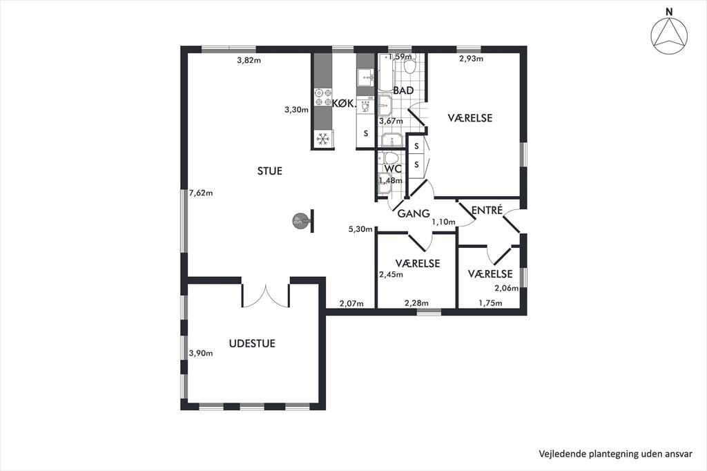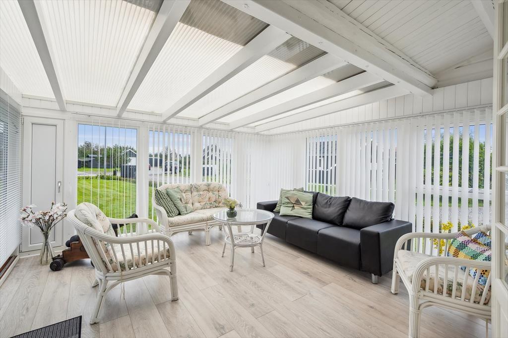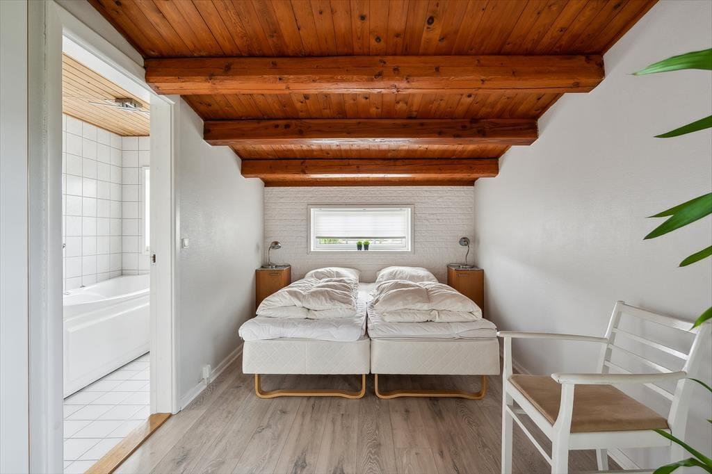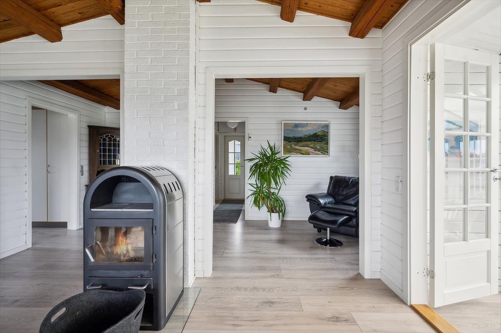 Huset er meget funktionelt delt op, med de tre værelser samlet omkring entreen, hvor du også finder husets gæste-WC. De er alle charmerende indrettet, og i tilknytning til det største værelse ligger det nydelige badeværelse, som foruden bruseniche også har et aflangt 2-personers spabad installeret. Her kan man med få midler arrangere en afslappende wellness-oplevelse. Køkkenet ligger centralt i huset, har god skabsplads, alle moderne hvidevarer og er åbent mod spiseafdelingen, som igen fører over i den store og pænt indrettede stue med flere dejlige sofaarrangementer og en skøn udsigt til haven. Der er således mange muligheder for at slappe af med en god bog, en avis eller ved at surfe lidt på det gratis og ubegrænsede Wifi-net; måske i varmen fra brændeovnen, som står midt i stuen. Man kan også trække ud i den pragtfulde og lyse havestue med store glaspartier og dejlige, bløde sofaer; et stort plus for huset.
