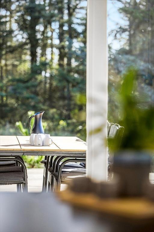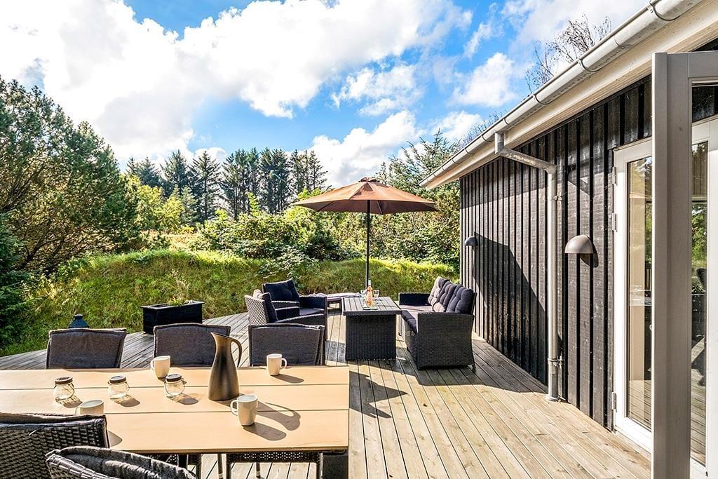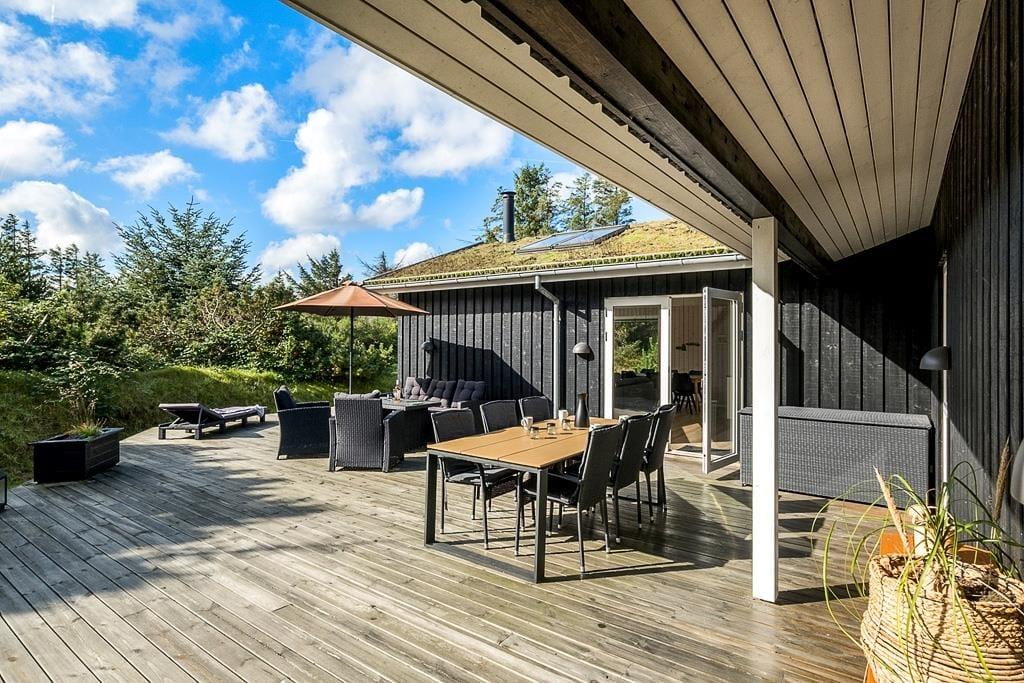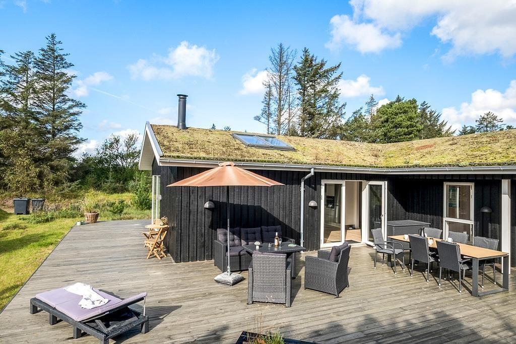 Huset ligger på en 1442 m2 stor naturgrund med træer og randbeplantning. Med ferieadresse her har man det helt for sig selv. En stor træterrasse omkranser huset og giver de bedste betingelser for at nyde den omgivende natur – og særligt den sydvendte del af terrassen tilbyder masser af plads. At sidde her og mærke freden og roen og de duftende fyrretræer, mens solen bage fra oven – det er sommerhusliv, når det er bedst.