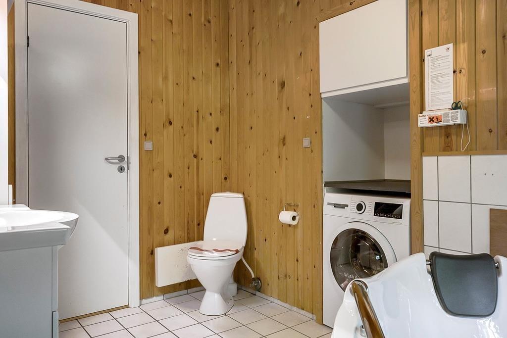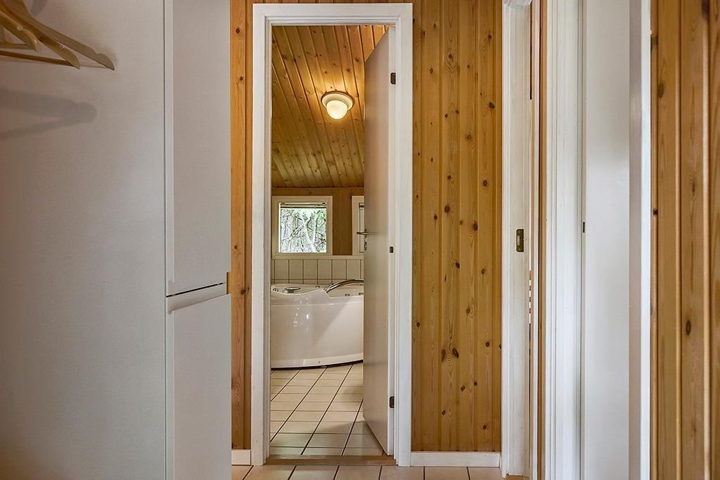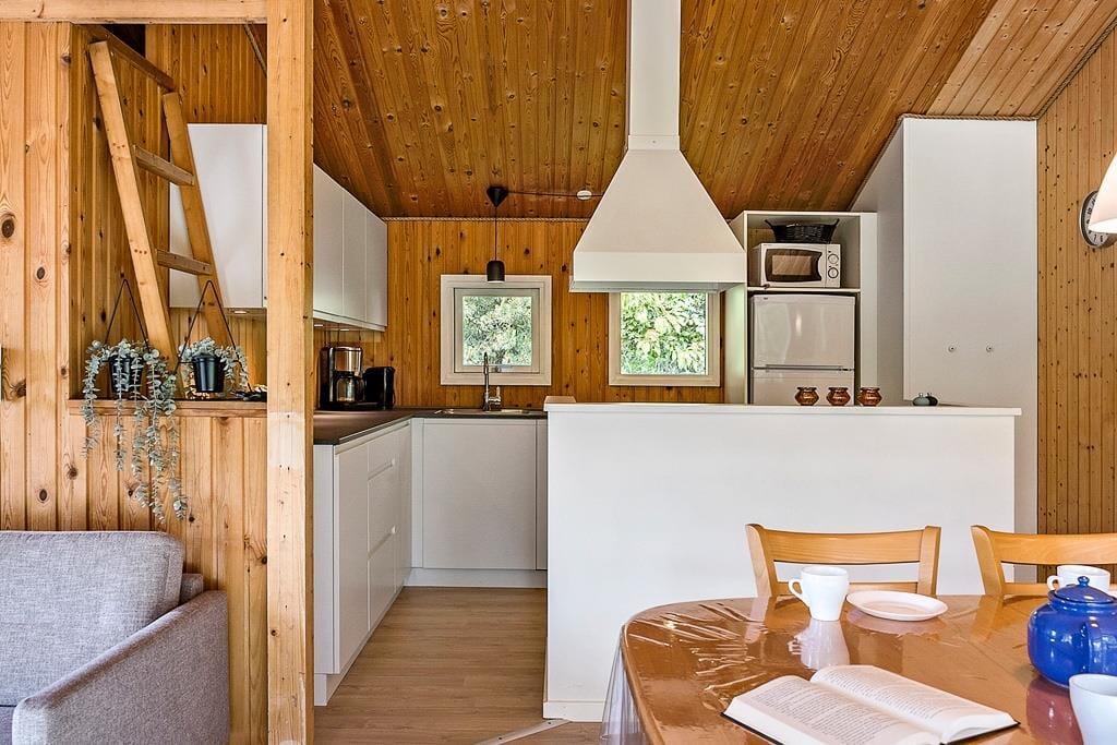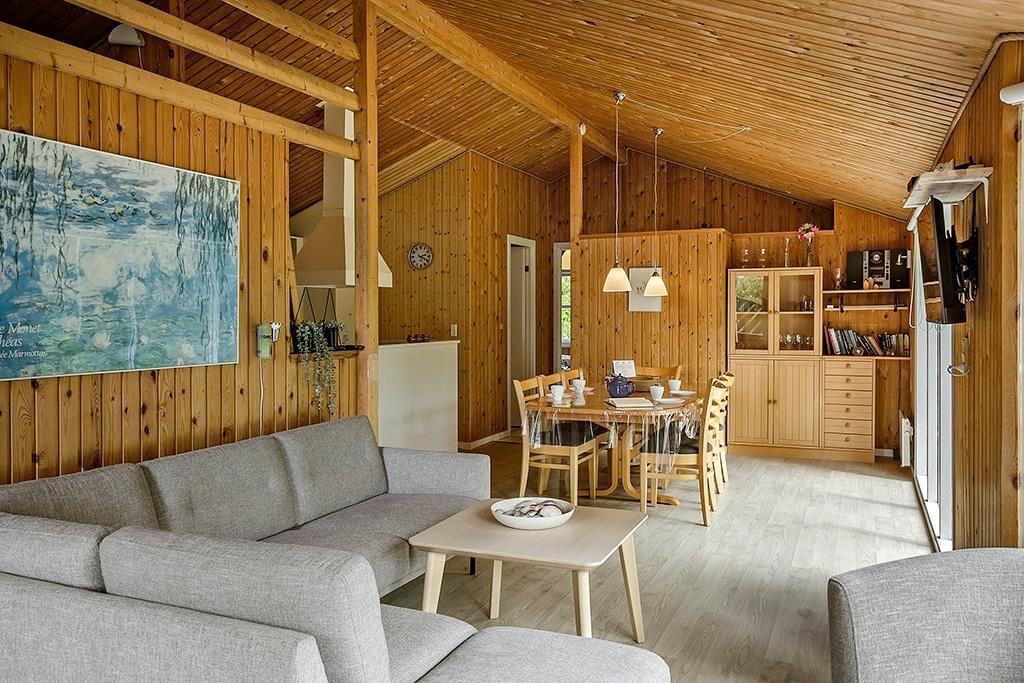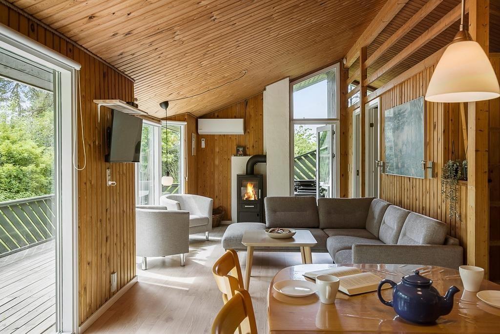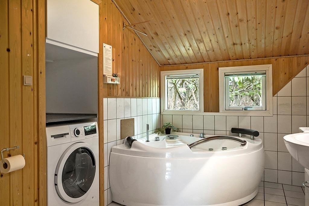 Når du træder ind i dette sommerhus, bliver du mødt af et åbent og indbydende køkken-alrum med højt til loftet. Her er masser af plads til både at lave mad sammen og slappe af, mens du nyder udsigten til de grønne omgivelser gennem de store vinduer. Brændeovnen skaber en hyggelig atmosfære på de køligere dage, hvor du kan slappe af med en god bog eller nyde tid sammen med familien. Det store badeværelse byder på både spabad og sauna, så du kan forkæle dig selv med wellness, når dagen er slut.