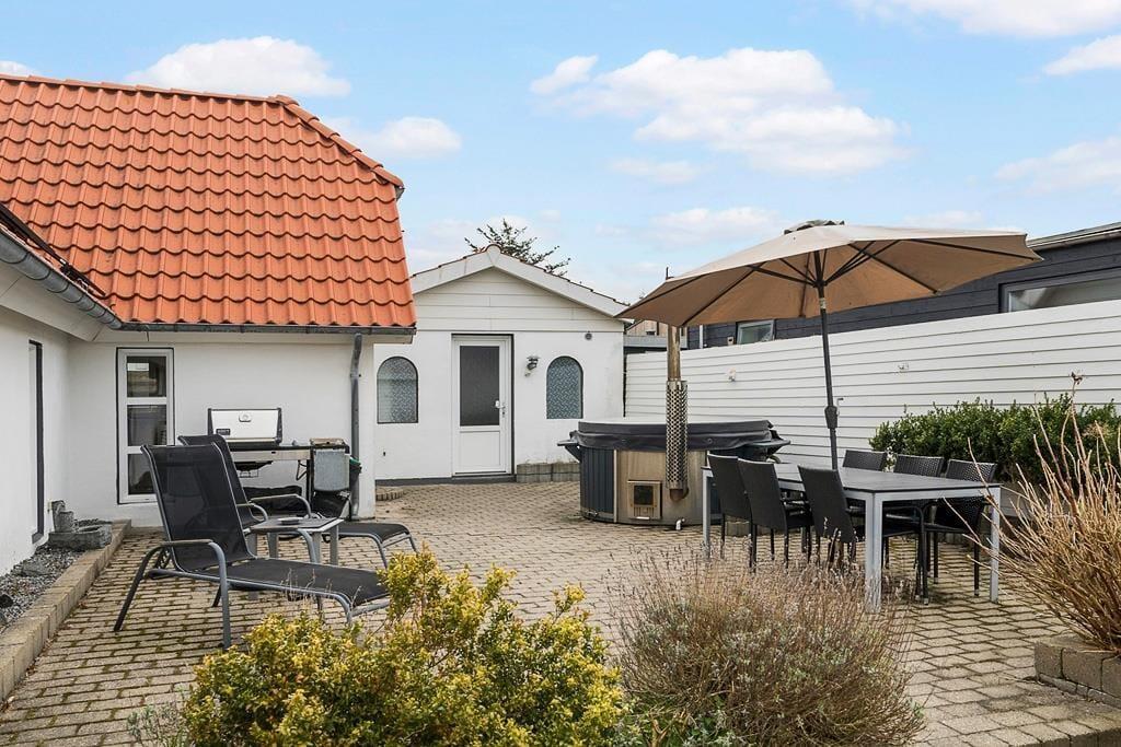 Den hyggelige gårdhave er som skabt til afslapning og fordybelse. Her er der rig mulighed for at slå sig ned i de komfortable havemøbler og nyde en kop kaffe eller et glas vin i fred og ro. Kronen på værket er vildmarksbadet, hvor du kan lade dig synke ned i det varme vand og lade hverdagen glide bort – særligt skønt, når stjernerne lyser himlen op. Den aflukkede gårdhave skaber desuden en helt privat atmosfære, hvor du kan nyde solen i læ eller grille en lækker middag til familien.