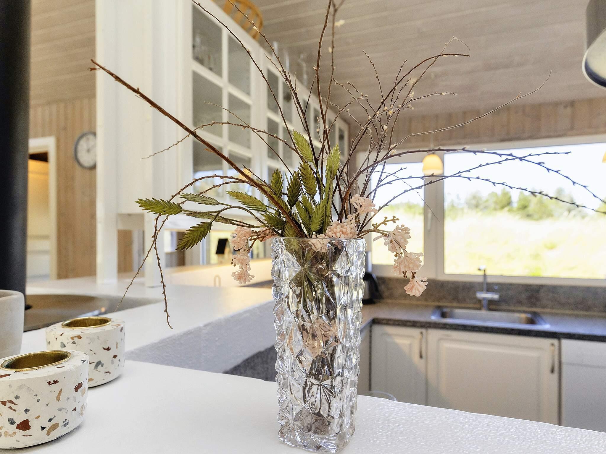 Køkkenet er åbent til stue og spisestue. Her kan du nyde spil eller se tv foran brændeovnen fra 2023.