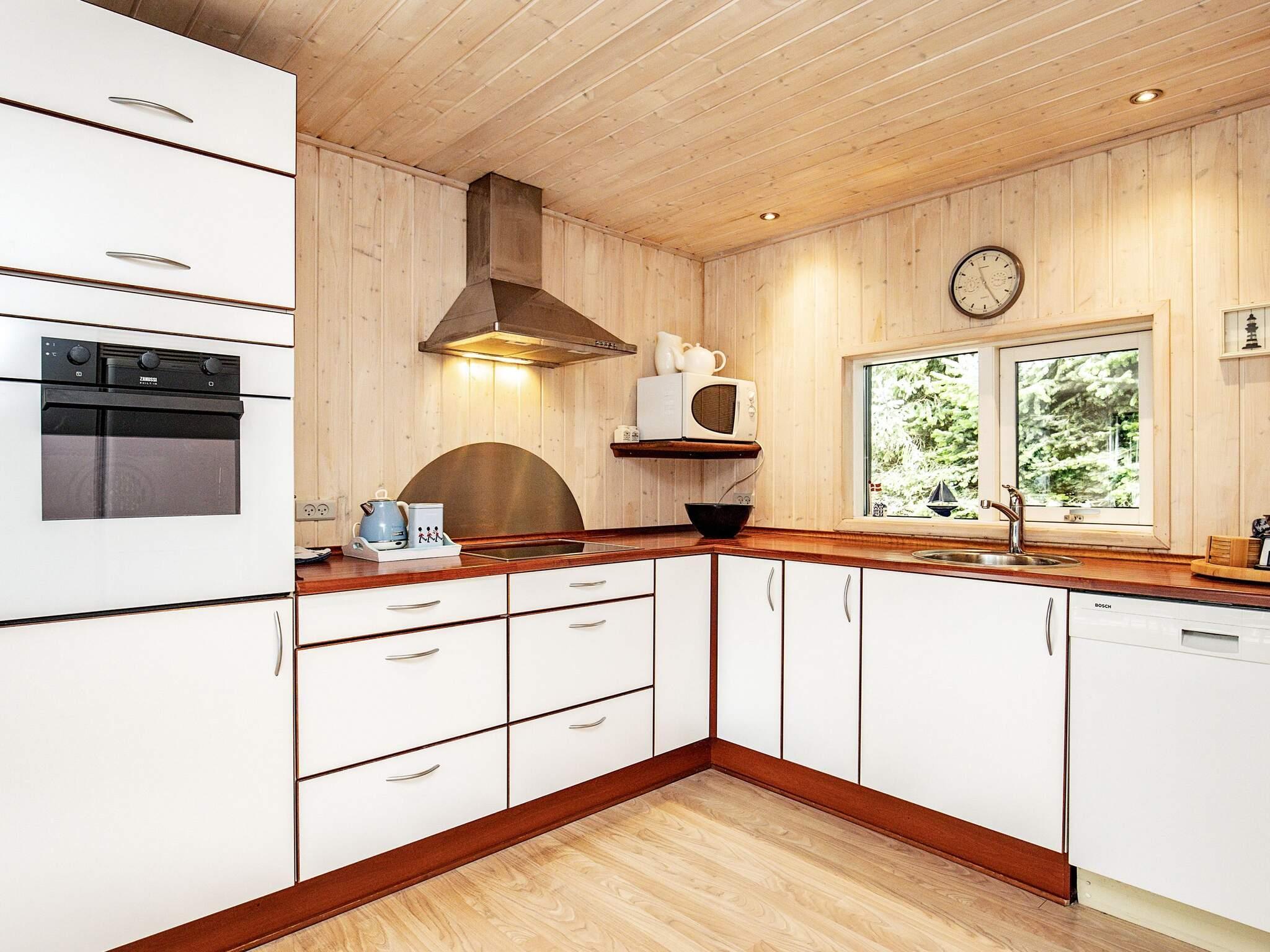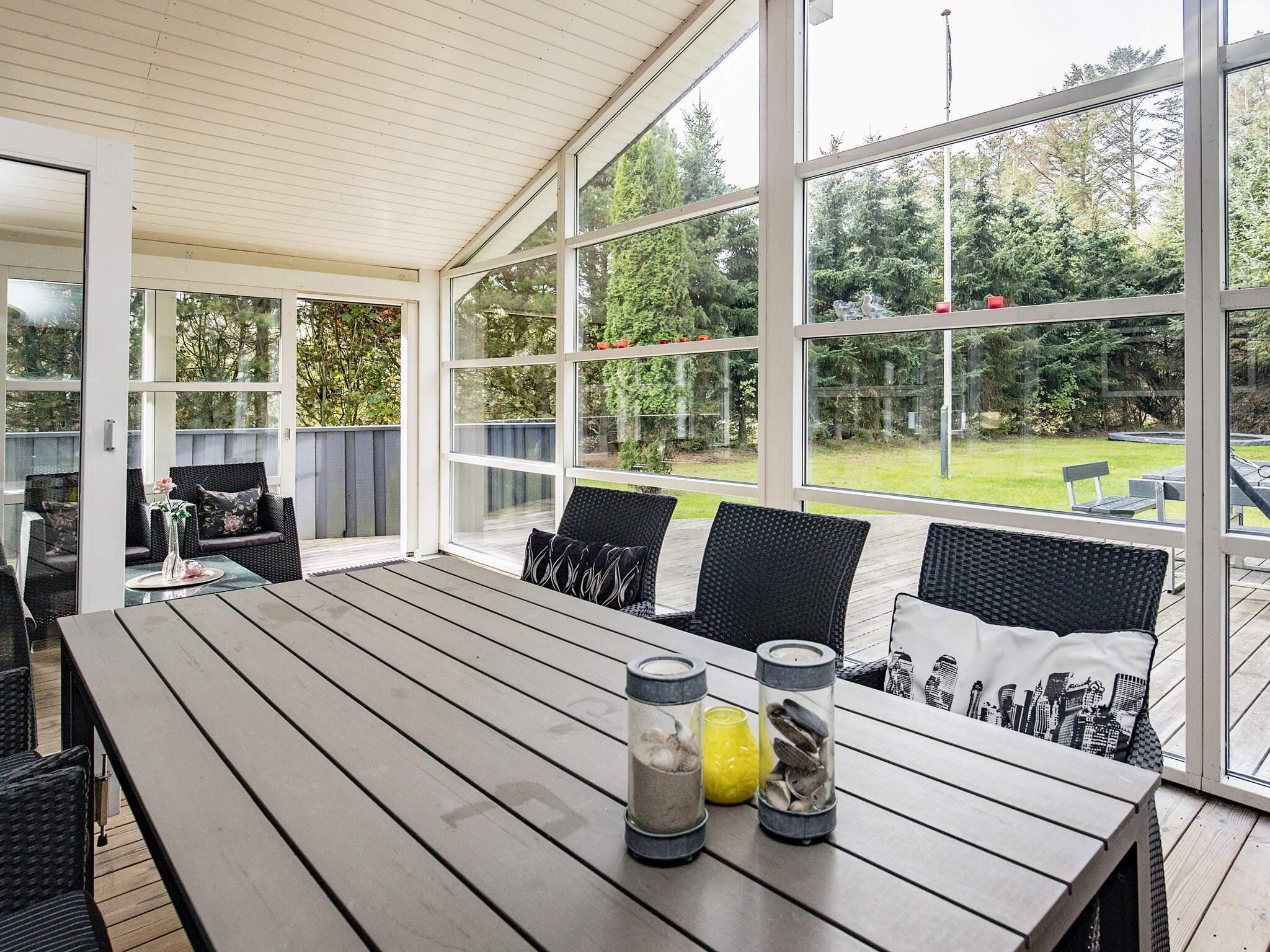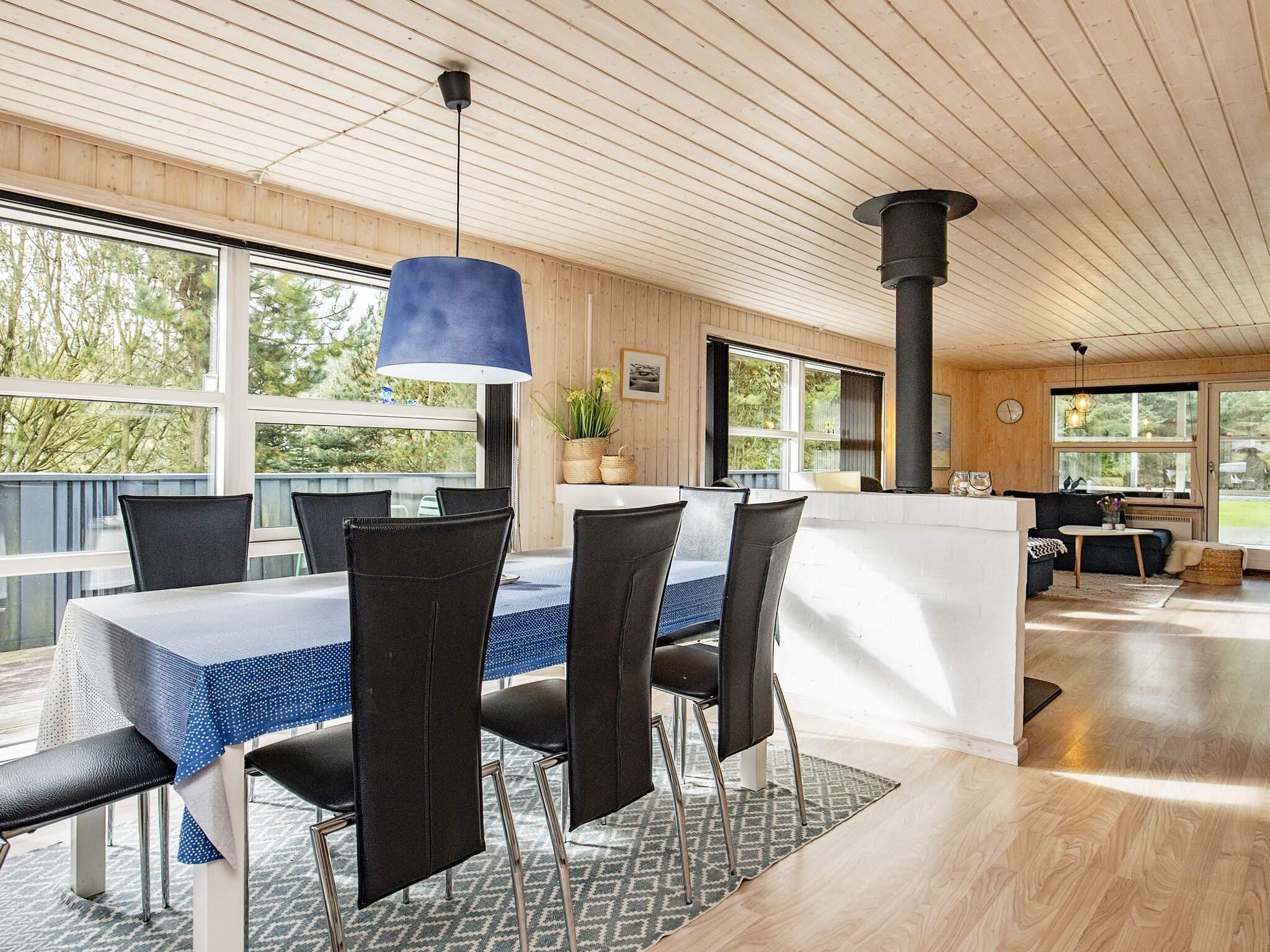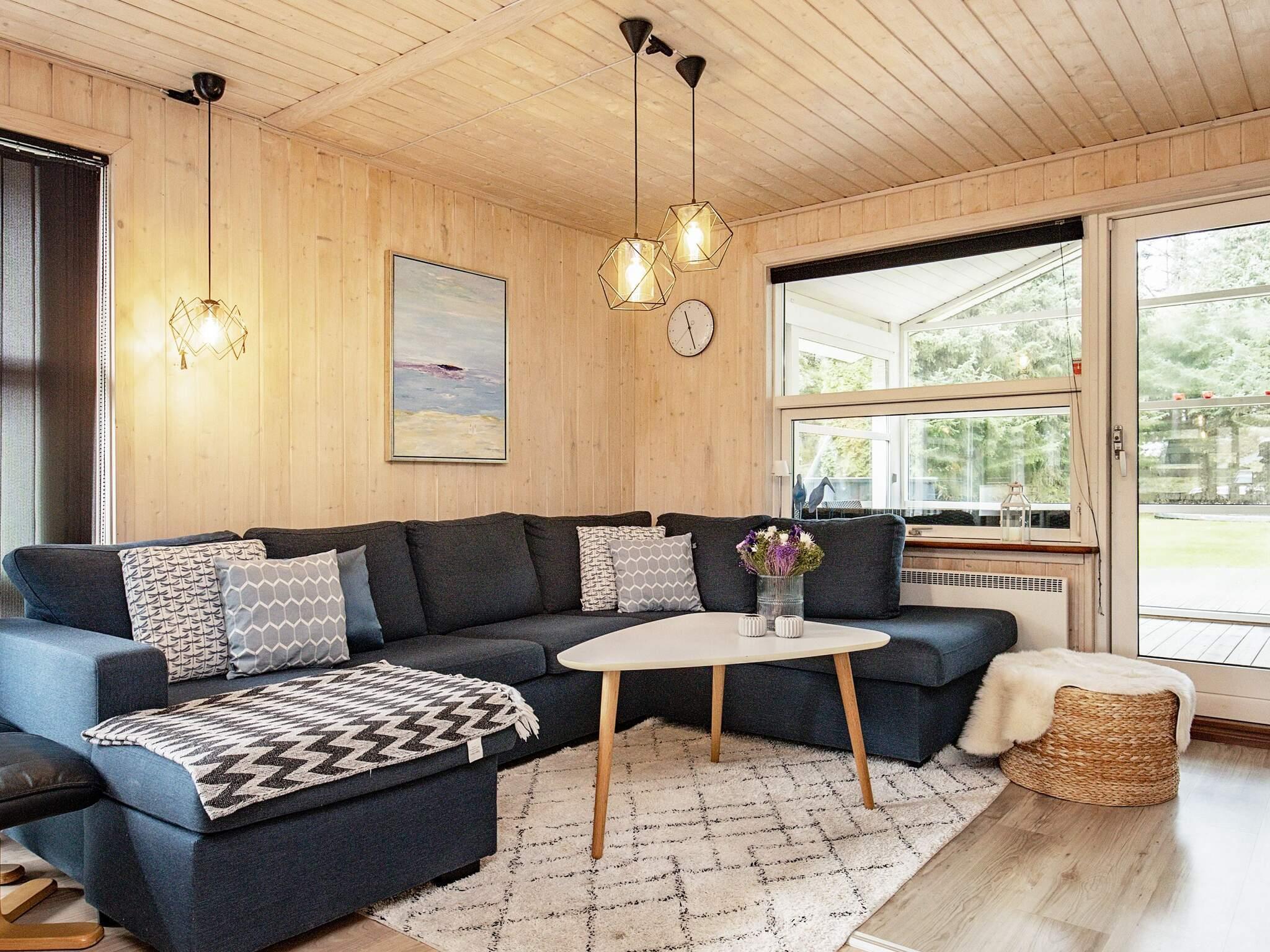 Indvendigt har feriehuset et stort åbent køkken og opholdsstue, perfekt til at tilbringe tid sammen som en familie. En brændeovn skaber en varm og hyggelig atmosfære på køligere aftener, mens direkte adgang fører til den glaserede veranda, hvor du kan nyde en kop kaffe med udsigt over haven.