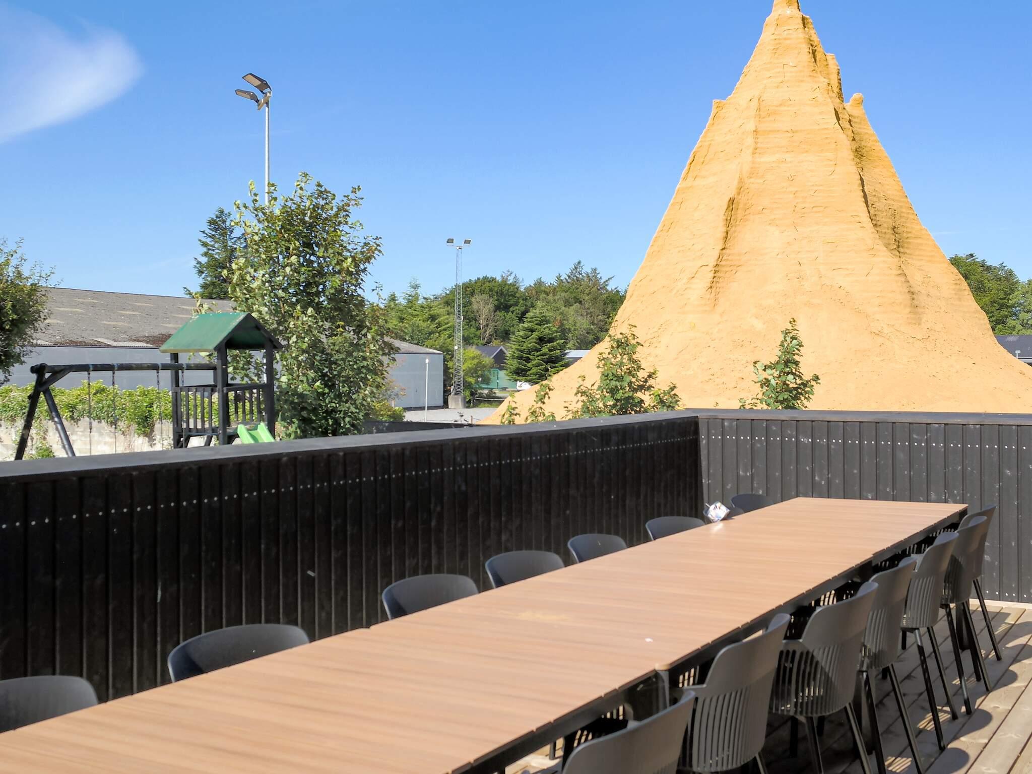 På første sal finder du husets hjerte – et stort køkken-alrum, der indbyder til socialt samvær. Køkkenet er udstyret med to ovne, to opvaskemaskiner og to køleskabe, så du kan lave mad til selv de største grupper. Der er desuden udgang til en indhegnet terrasse med integreret udekøkken med vask, grill og køleskab – perfekt til sommeraftener med madlavning og socialt samvær under åben himmel.